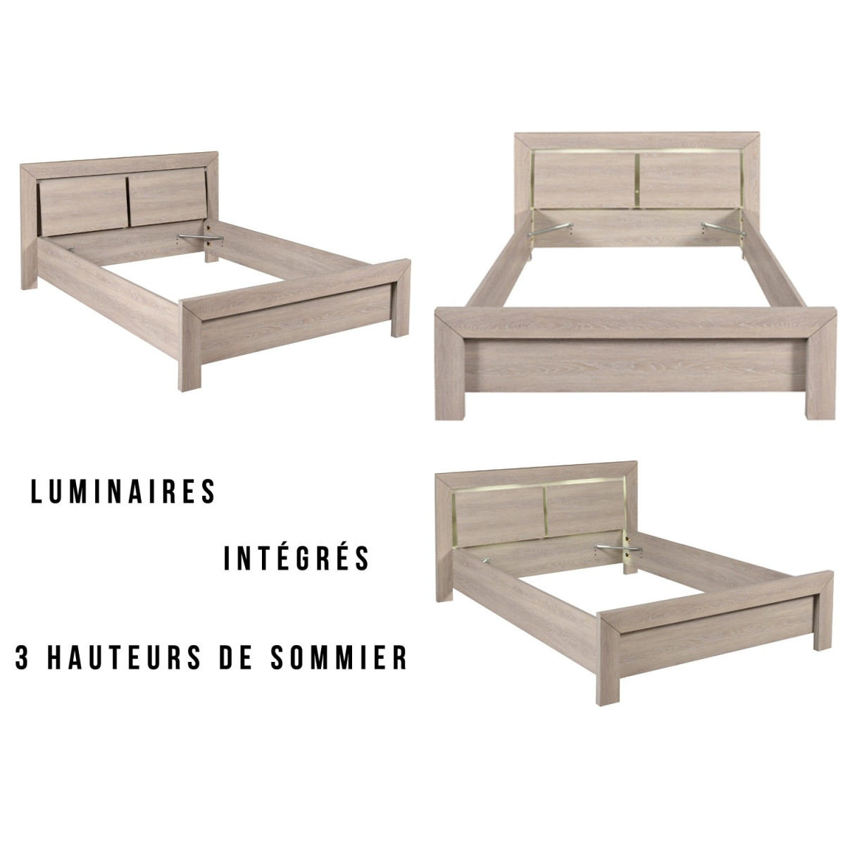 Le lit coffre est très pratique grâce à sa structure de lit fermée et son sommier relevable. Vous gagnez un espace de rangement supplémentaire pour vos couettes, draps, oreillers ou tout autre linge de lit. L’ouverture du coffre est facilitée par un système d’amortissement. Découvrez notre sélection de lits design et moderne intégrant à merveille le côté pratique du rangement. Vous aimerez surement notre lit coffre au style contemporain avec une tête de lit élégante aux décorations soignées. L’éclairage LED blanc intégré, activable depuis 1 ou 3 interrupteurs, ajoute la touche moderne. Les deux chevets associés vous permettent d’avoir à portée de main les objets utiles. Laissez-vous séduire par notre lit en bois de finition élégante pour une ambiance chic dans votre chambre à coucher.