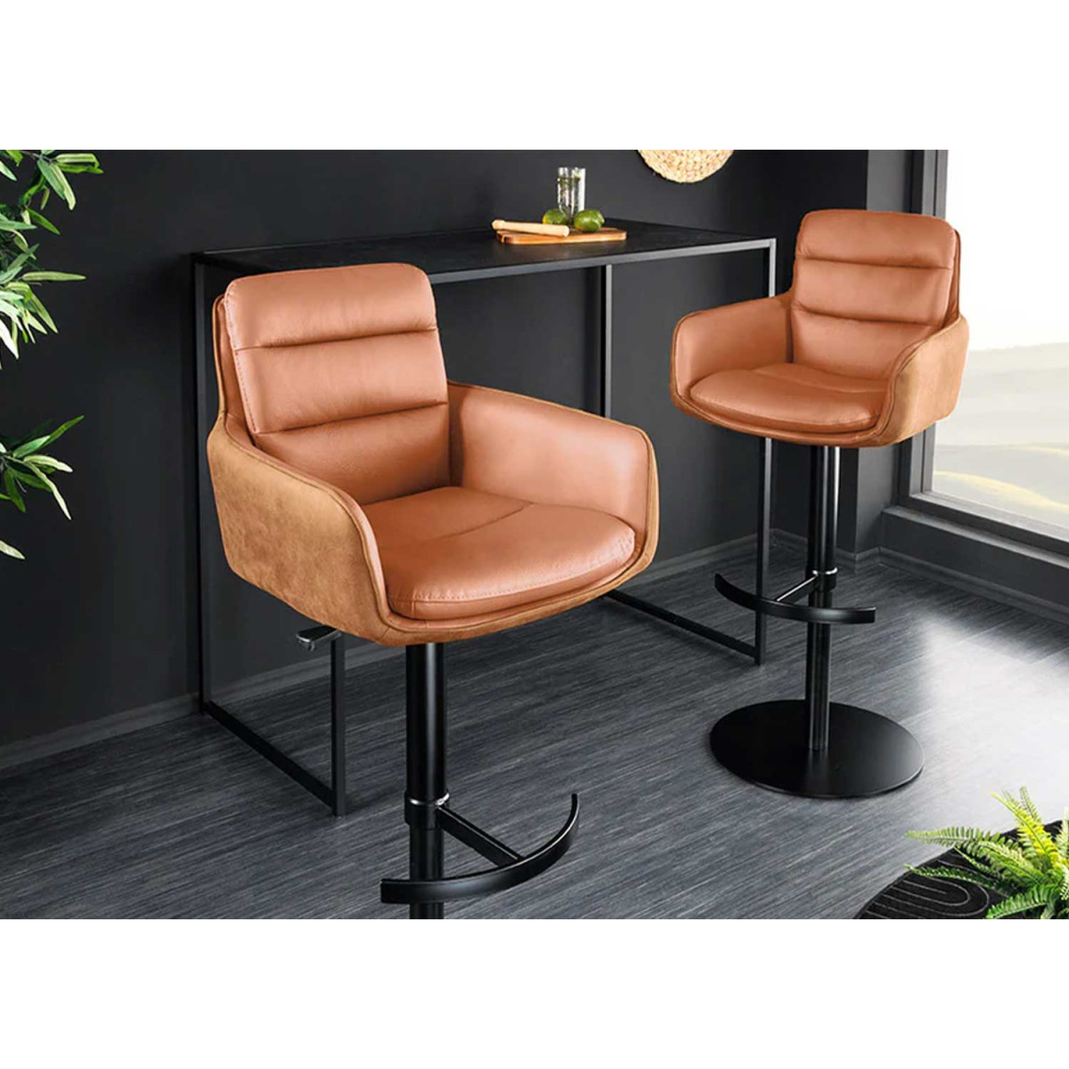 Le tabouret de bar pivotant Abby associe un revêtement en microfibre et cuir cognac à un confort optimal grâce à ses accoudoirs. Réglable en hauteur, il repose sur un piétement en métal noir équipé