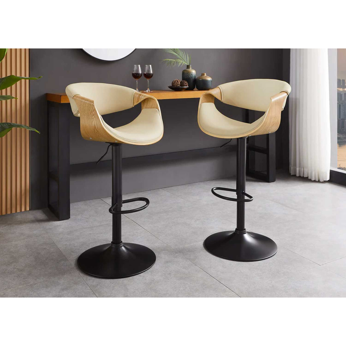 Le tabouret de bar Oliver est doté d'une assise recouverte de simili-cuir beige confortable. Le bois clair en placage chêne est utilisé pour envelopper l’assise et souligne le côté nature du design,