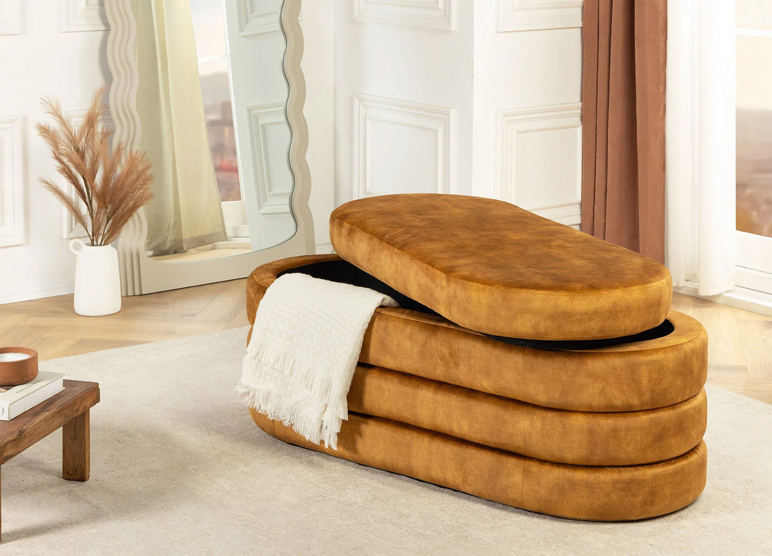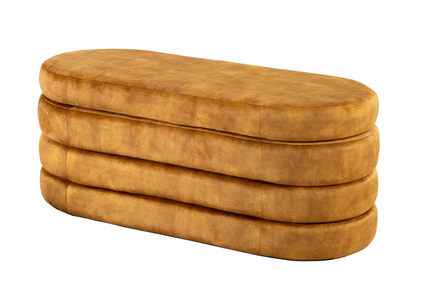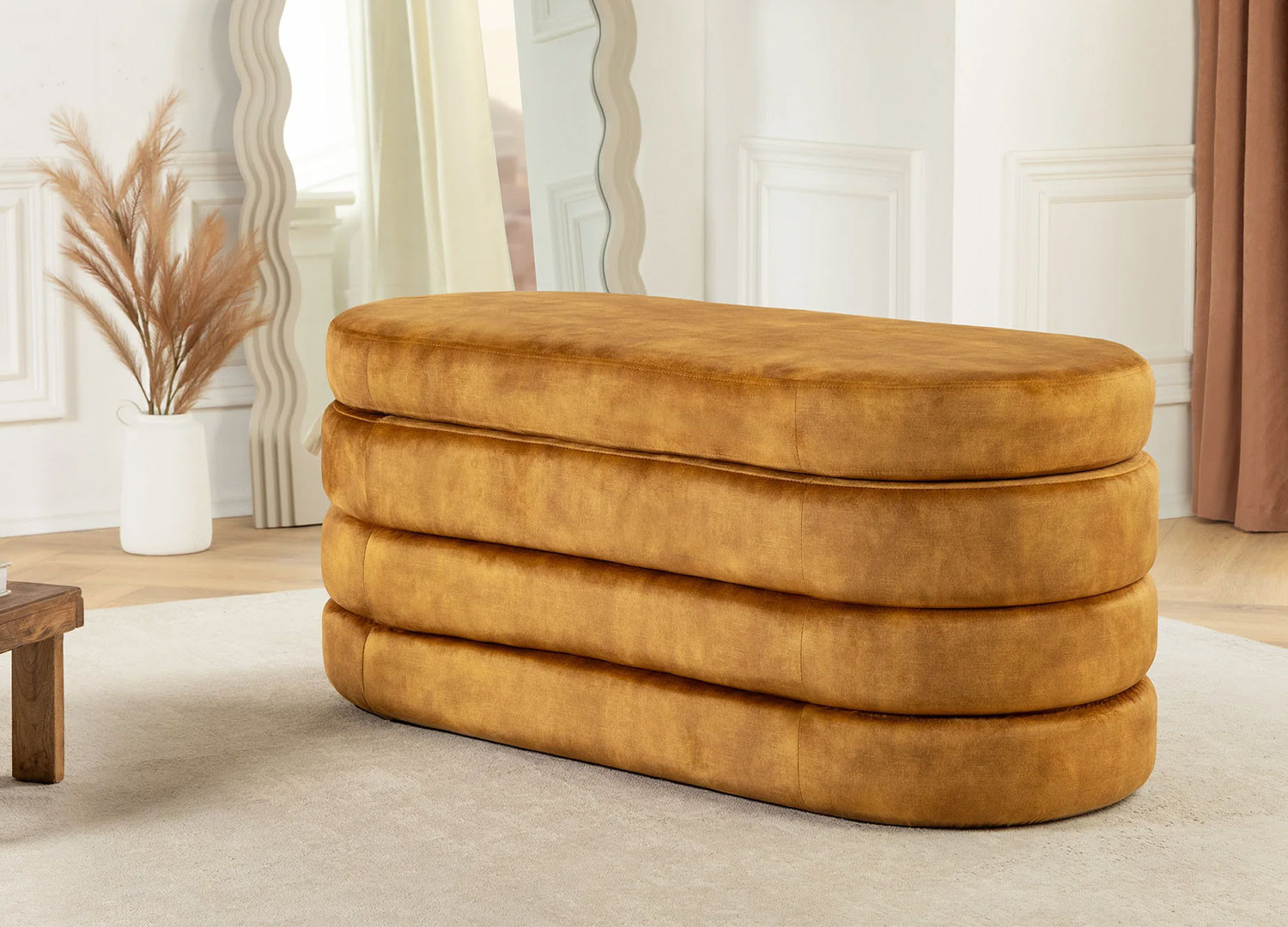 ✓ Élégance et rangement discret pour le banc coffre Hope en tissu velours jaune moutarde idéal dans une entrée, un salon ou même dans une chambre en tant que pied de lit.