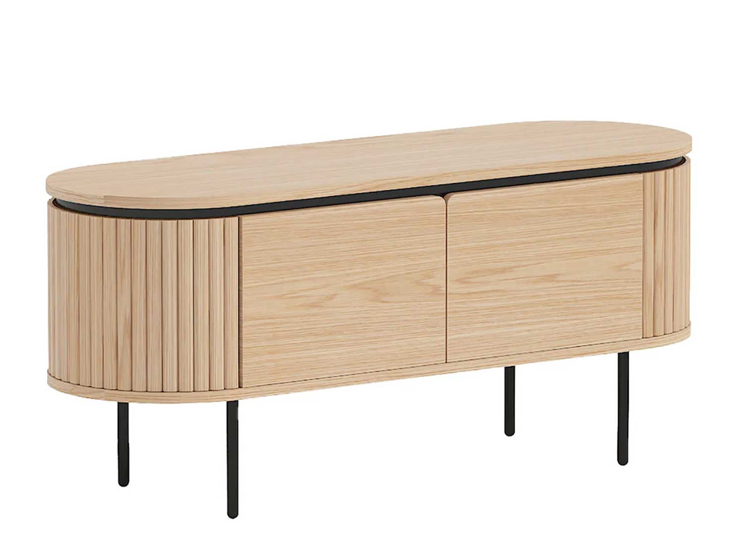 Le meuble TV Lili mesure 120 cm de large. Il est conçu en MDF et en panneaux plaqués chêne et repose sur des pieds en métal noir de 20 cm de hauteur, ce qui lui donne un style sobre et moderne. Il dispose de deux portes à fermeture magnétique qui permettent de ranger facilement vos appareils ou accessoires tout en gardant un aspect épuré. Sa structure solide peut supporter jusqu’à 40 kg, ce qui en fait un meuble pratique et fiable pour accueillir votre télévision et votre équipement multimédia.