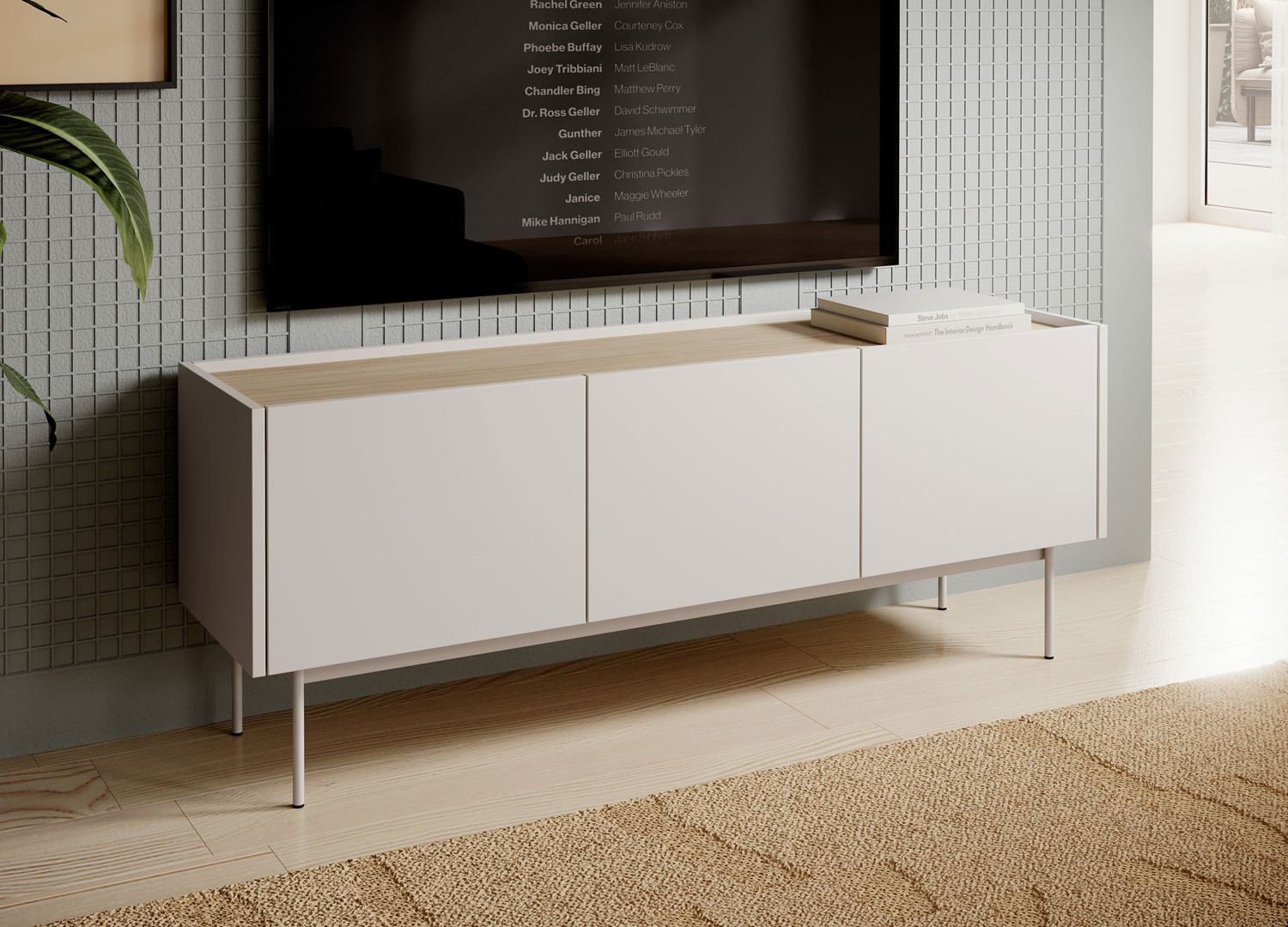✓ Il trône dans le salon comme une pièce de caractère. Avec ses teintes cachemire et chêne, ce meuble TV ne se contente pas d’accueillir votre écran : il installe une atmosphère.