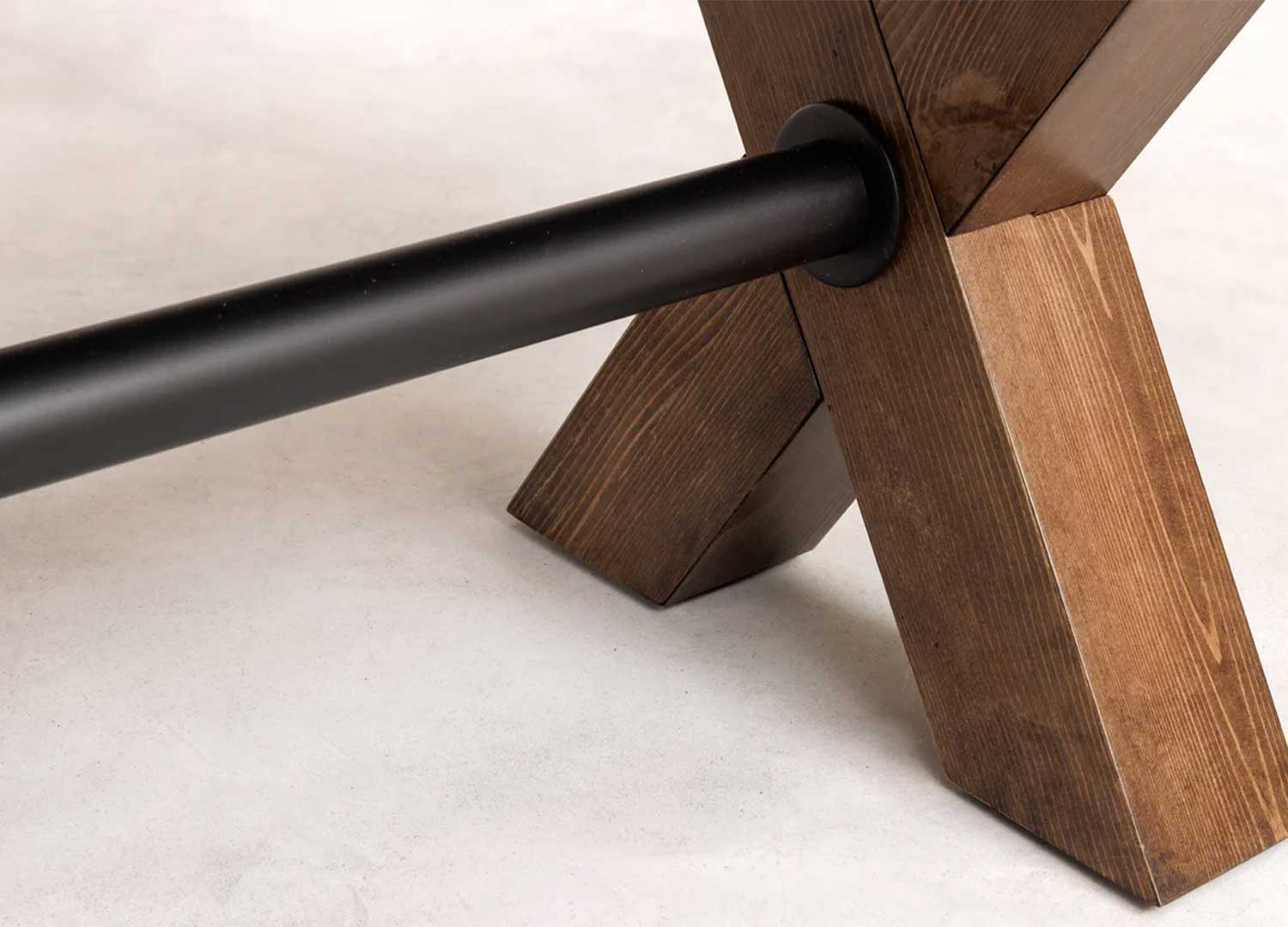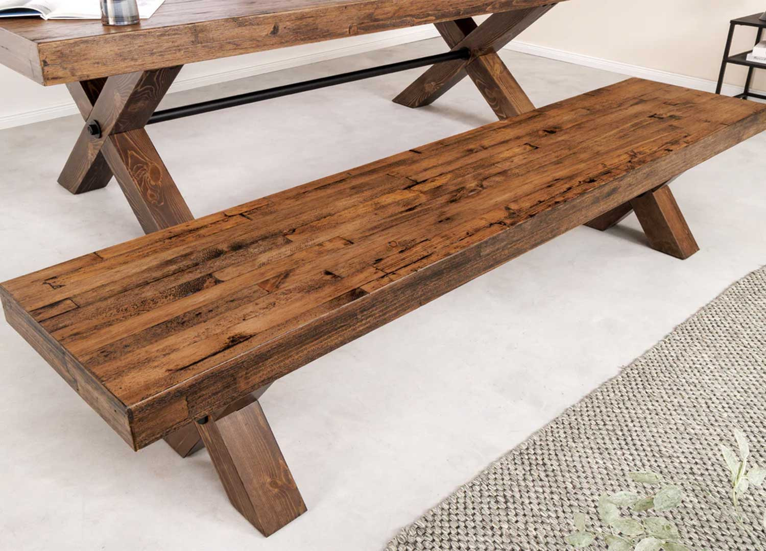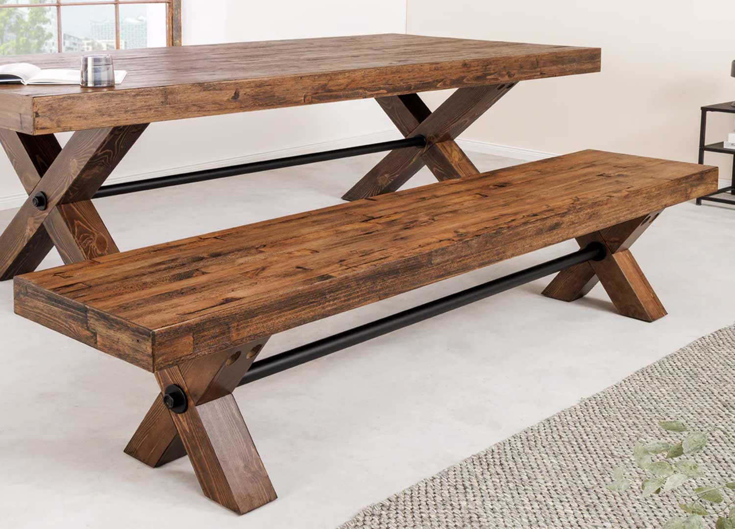 Le banc de table Malaya sera parfait avec les tables de la même collection. Il dispose d'une assise large de 180 cm et est réalisé en panneau MDF recouvert d’un placage en bois de pin teinté. L'assise est soutenue par un piétement croisé avec une barre de renfort en métal noir.