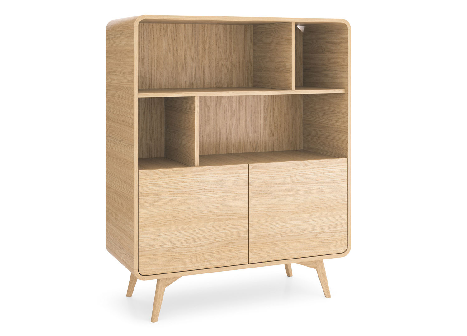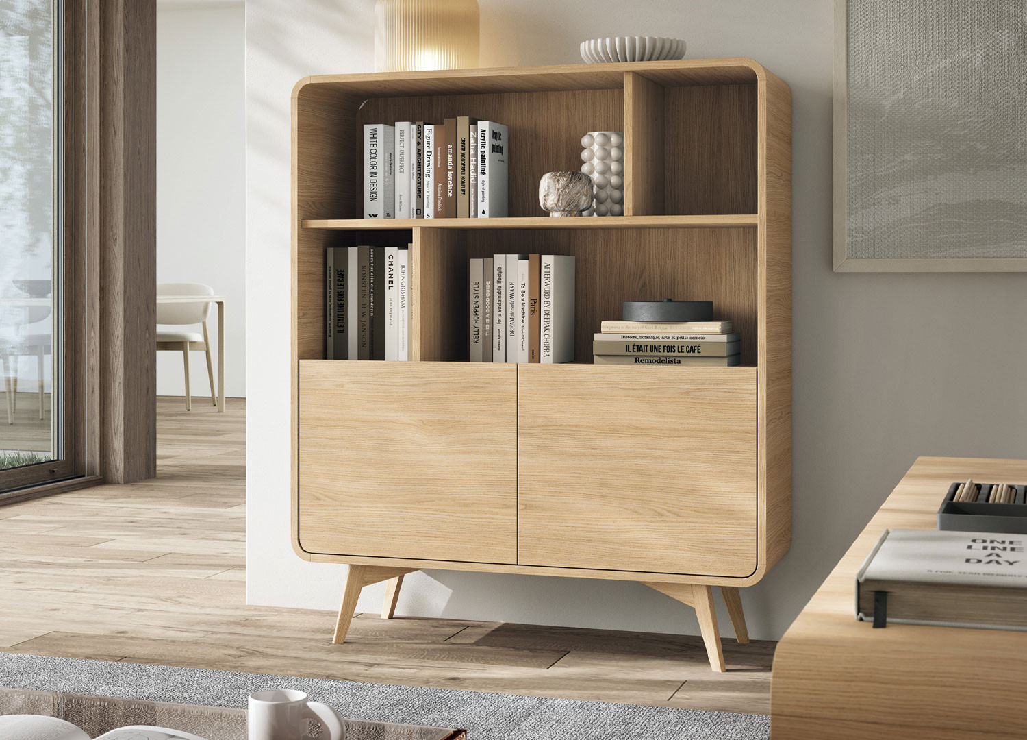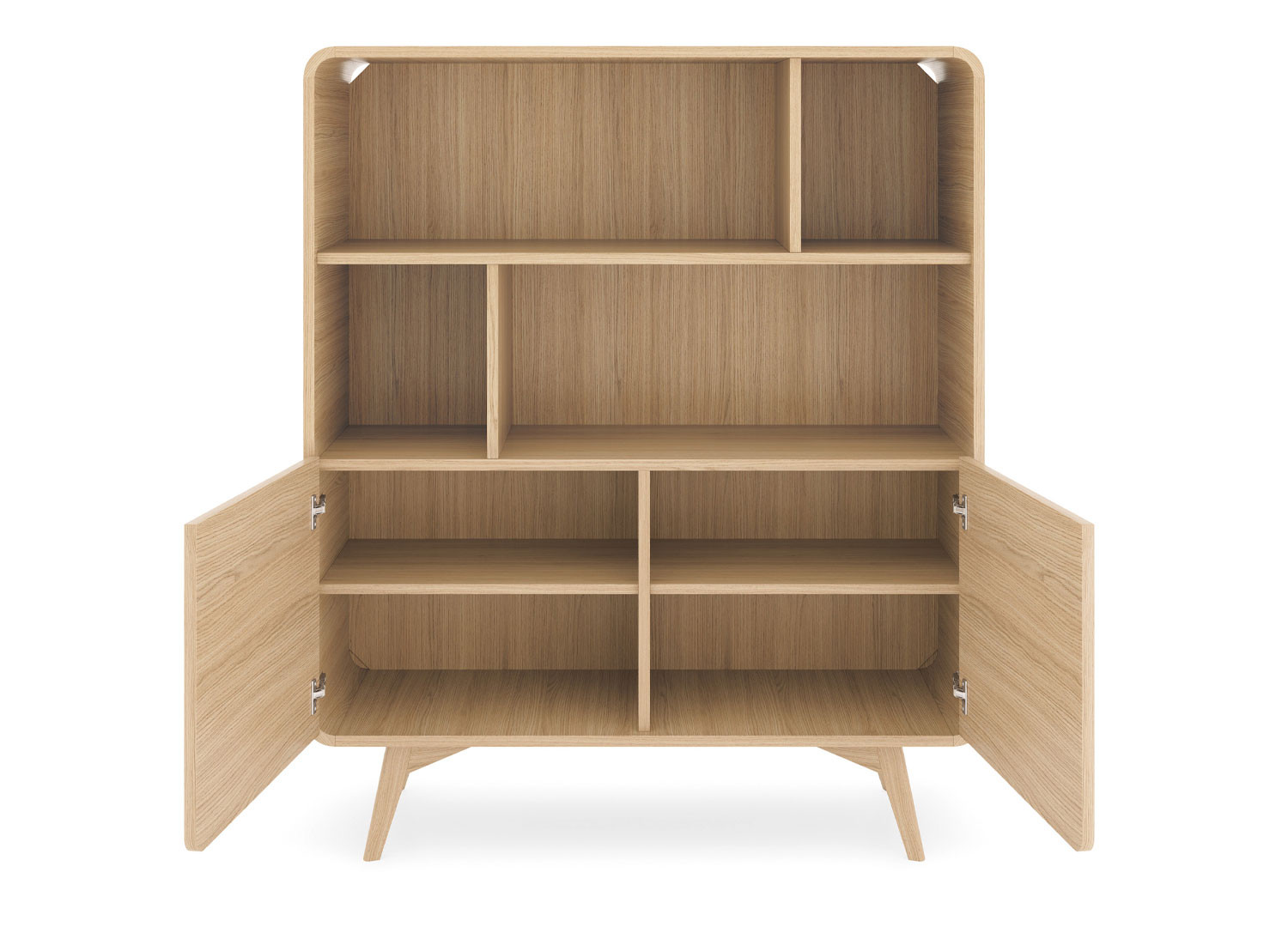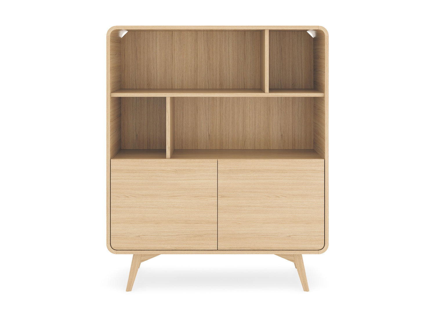 La bibliothèque Helion de couleur chêne clair mêle quatre niches ouvertes à un espace fermé par deux portes, offrant ainsi une belle flexibilité d’usage : on peut exposer livres, objets décoratifs ou œuvres, tout en dissimulant ce que l’on souhaite garder à l’abri du regard.