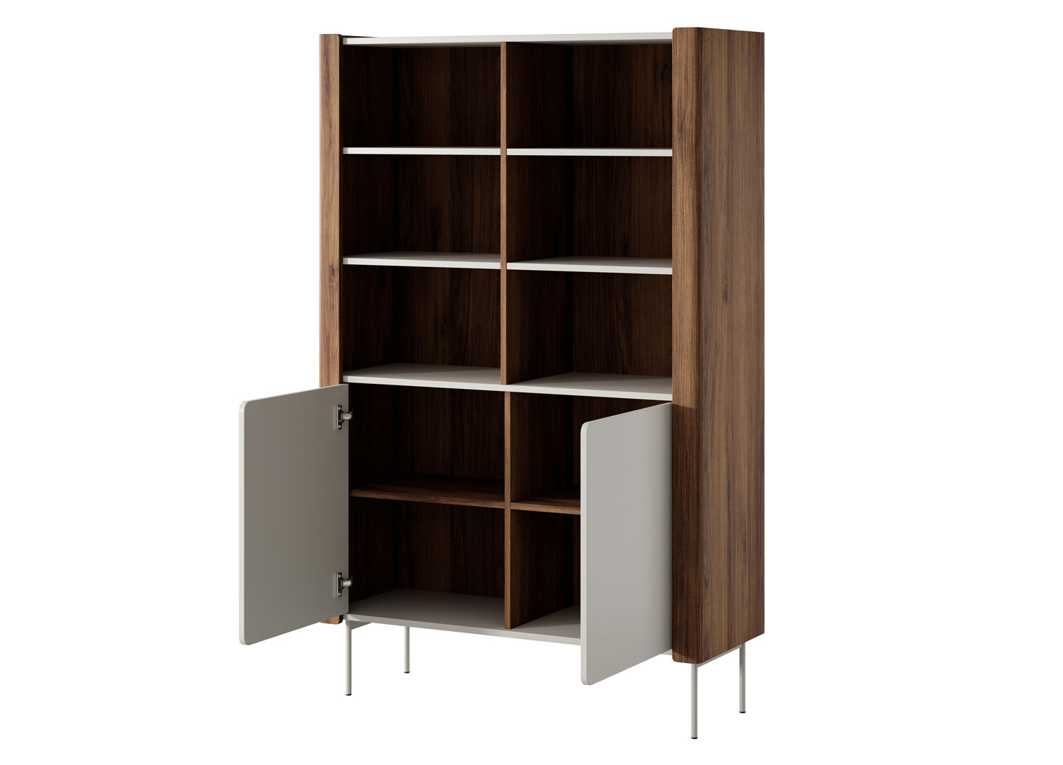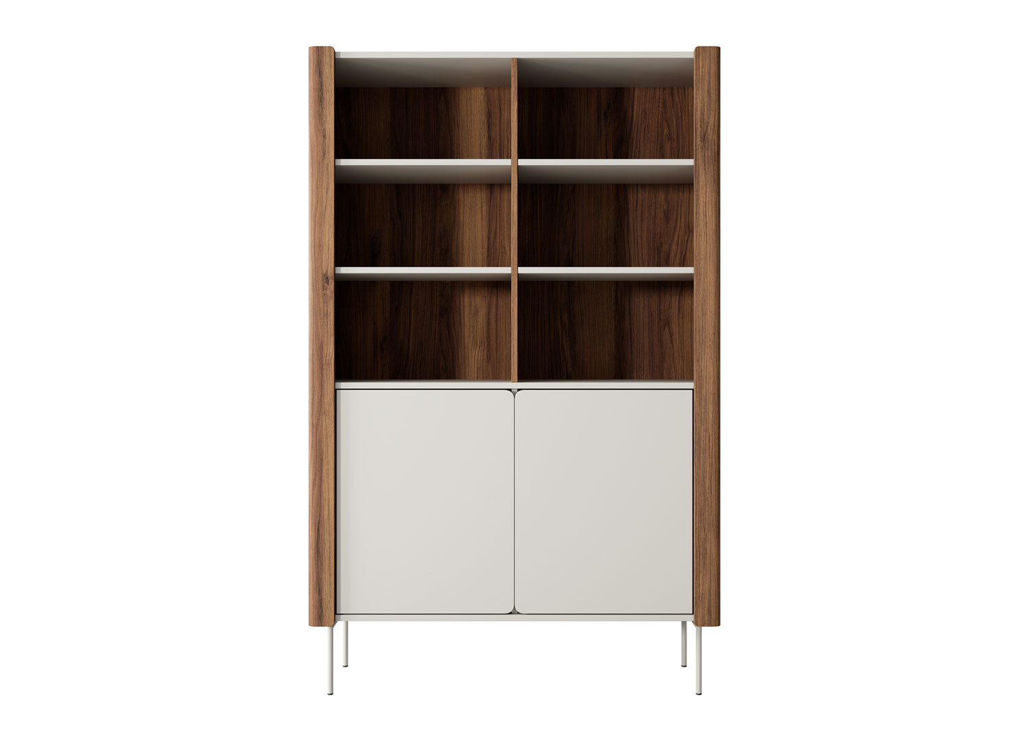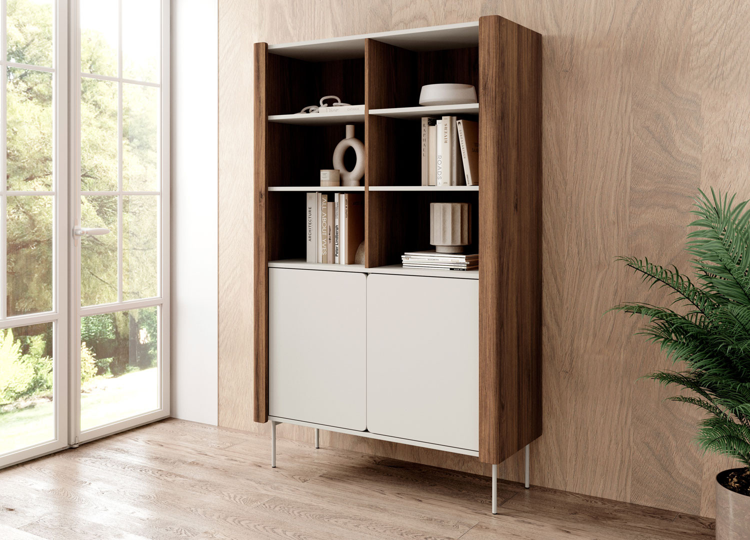 Avec ses espaces ouverts et fermés, le meuble bibliothèque Wrap, de couleur noyer et cachemire, offre à la fois des zones d’exposition et de rangement fermé pour tout type d'accessoire de salon.