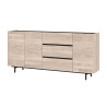 Détail du buffet moderne chêne et noir - 3 tiroirs - 3 portes intégrant 4 étagères réglables en hauteur - 6 patins en pvc ou base métal thermolaqué noir - inclus et au choix lors de l'assemblage - ouverture par prise de mains - sans poignées - amortisseurs portes et tiroirs ✔ Ce meuble est livré en kit ; son temps de montage est estimé à 120 mn |