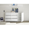 Détail du buffet design blanc laqué - 1 porte intégrant 1 étagère - 2 espaces de rangement au total - 3 tiroirs à double compartiment - ouverture par prise de mains - sans poignées - socle d'une hauteur de 8 cm |