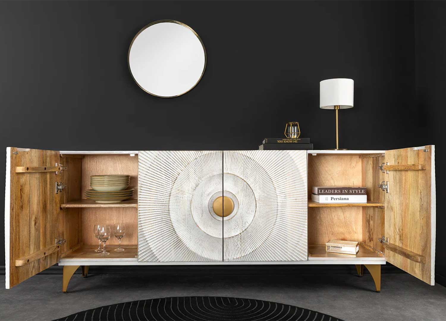 Pour une salle à manger originale, offrez-vous ce buffet de la collection Sunset. Il est équipé de quatre portes avec compartiments de rangement et est fabriqué en bois de manguier blanc avec détails dorés. Son point fort se trouve sur ses façades magnifiquement décorées.