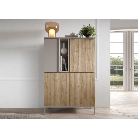 Buffet haut design avec rangementCe buffet haut de salle à manger, d’une hauteur de 150 cm, affiche un style design avec une finition chêne Cadiz et Cashmere. Il est équipé de quatre portes, chacune renfermant une étagère pour optimiser le rangement. Au centre, une niche avec une étagère en verre crée deux compartiments ouverts, idéals pour exposer des objets décoratifs ou de la vaisselle. Ses pieds en métal, de forme bâton, assurent une bonne stabilité tout en apportant une touche moderne. Un éclairage LED est disponible en option pour mettre en valeur la niche et ajouter un effet visuel supplémentaire. Ce buffet est un meuble pratique pour organiser et structurer votre espace. | ||