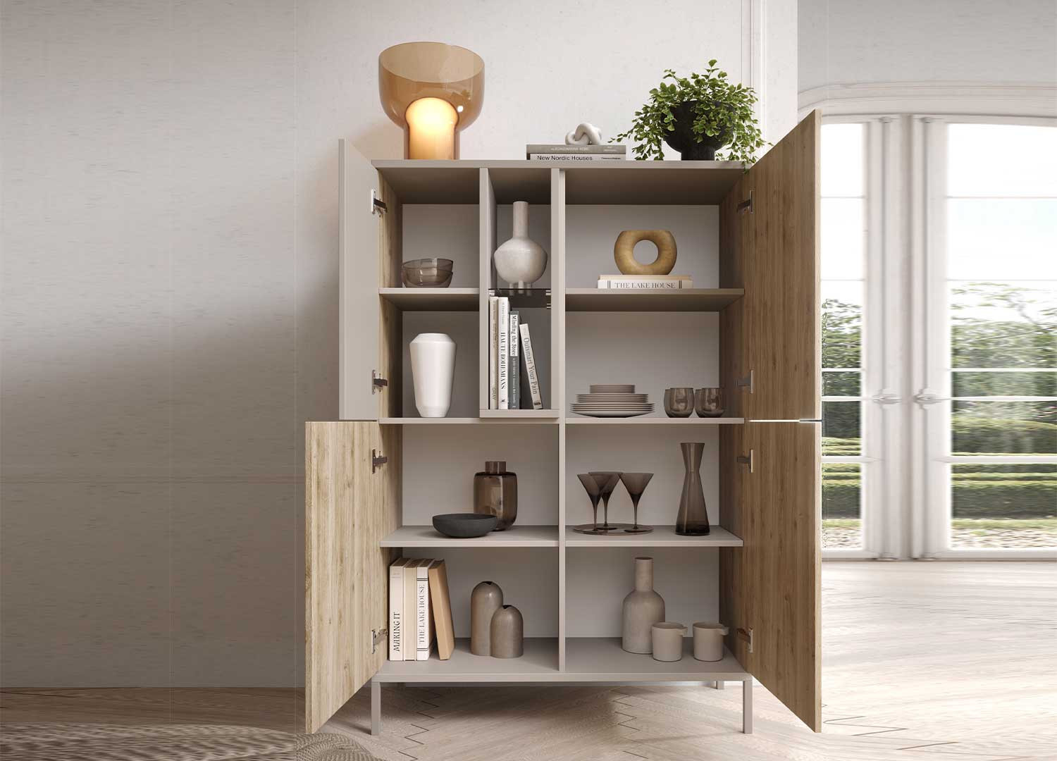 Ce buffet haut de 150 cm de hauteur de finition chêne Cadiz et Cashmere dispose de quatre portes avec étagères pour un rangement optimisé. Une niche avec une étagère en verre crée deux compartiments ouverts, parfaits pour exposer des objets. Son piétement en métal, de forme bâton, assure stabilité. Un éclairage LED en option permet de mettre en valeur la niche.