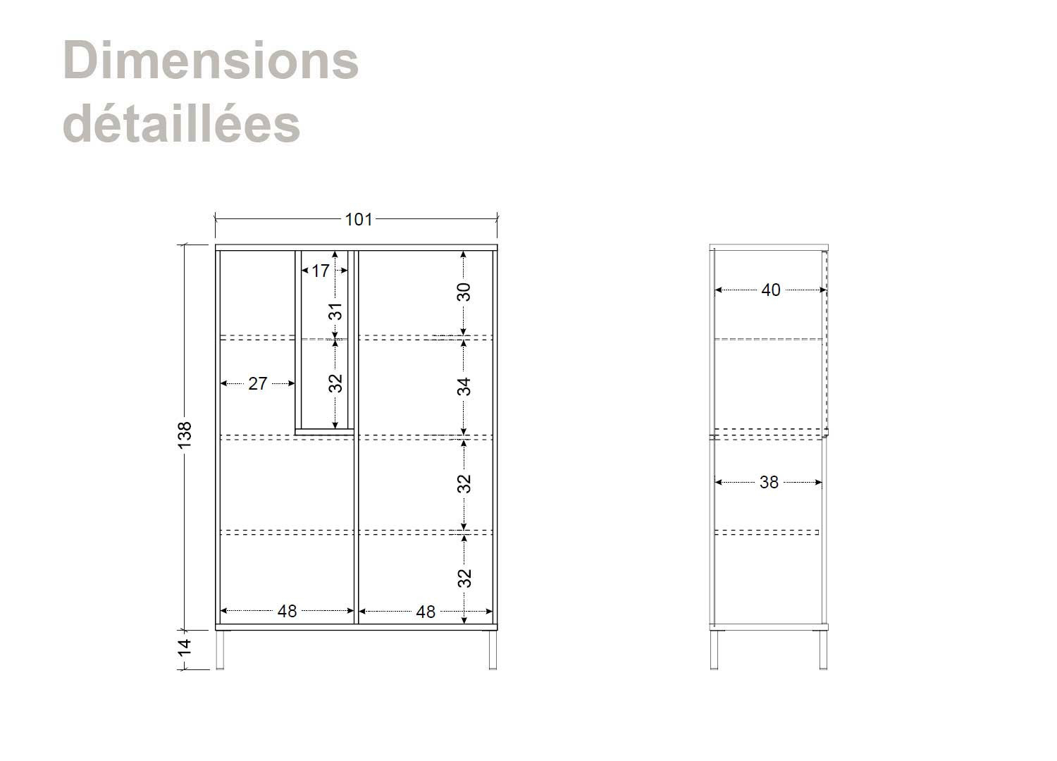 Détail du buffet haut moderne - 4 portes intégrant chacune 1 étagère non réglable en hauteur - 1 niche avec 1 étagère en verre séparatrice (ép. 4mm) offrant 2 compartiments de rangement - Ouverture des portes par bouton poussoir - pieds en métal de forme bâton En Option - Kit LED blanc ✓ ce meuble est à fixer au mur afin d'éviter tout basculement. Fixation murale fournie ; cheville à vous procurer en fonction de votre mur (béton, placo, etc...) |