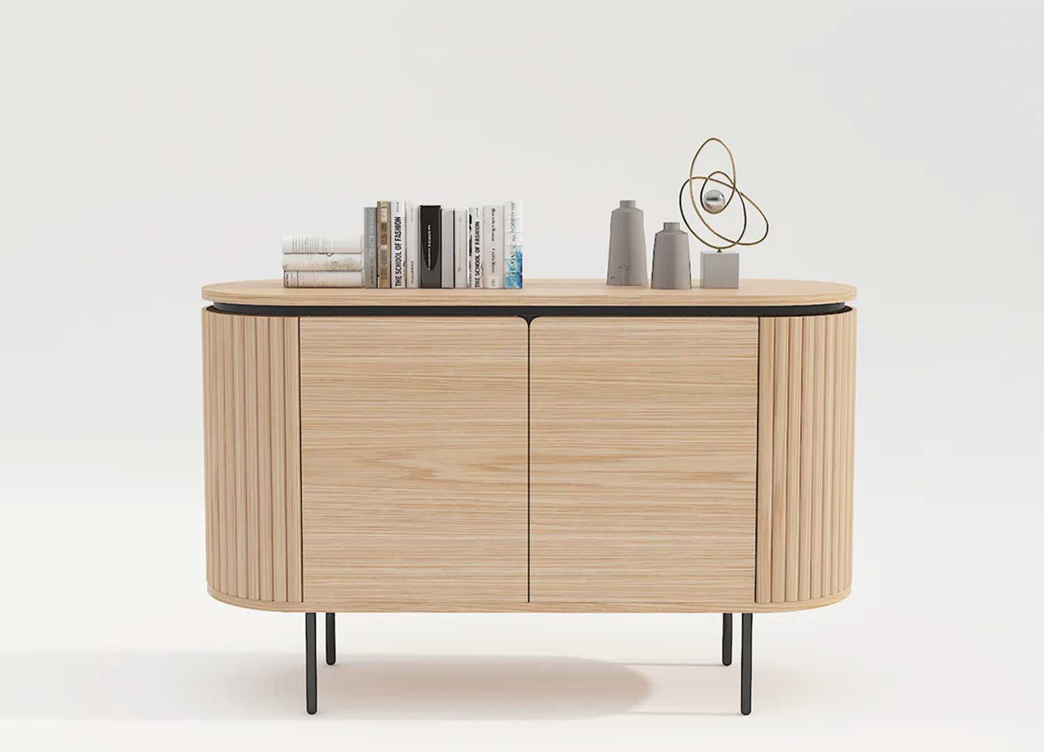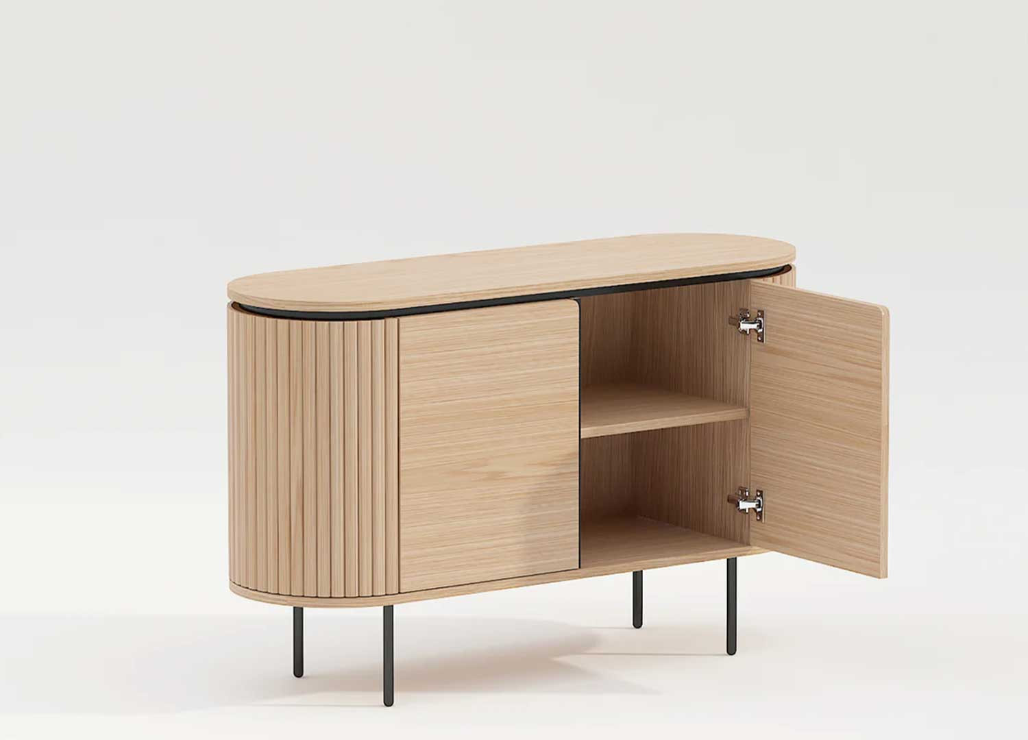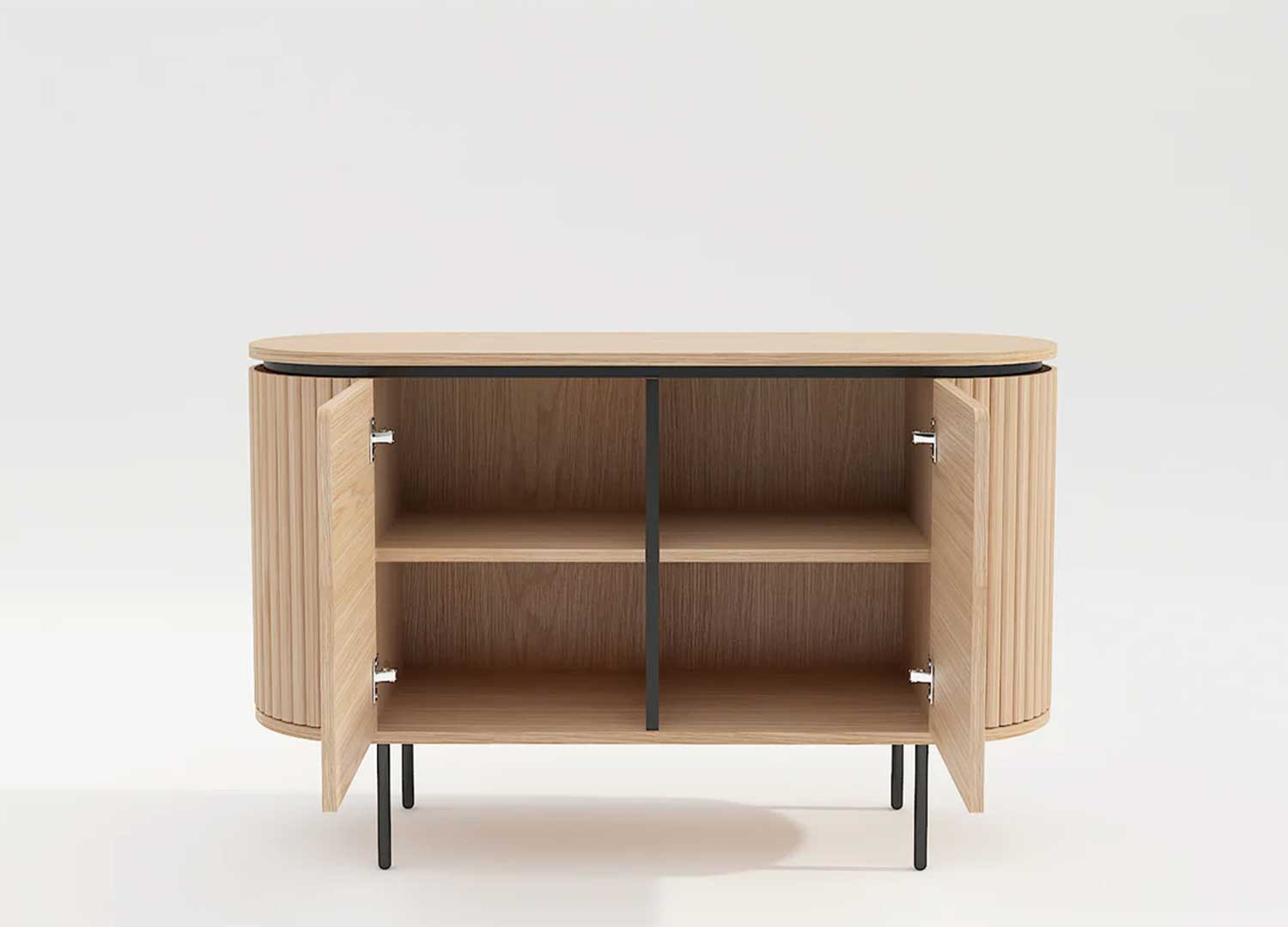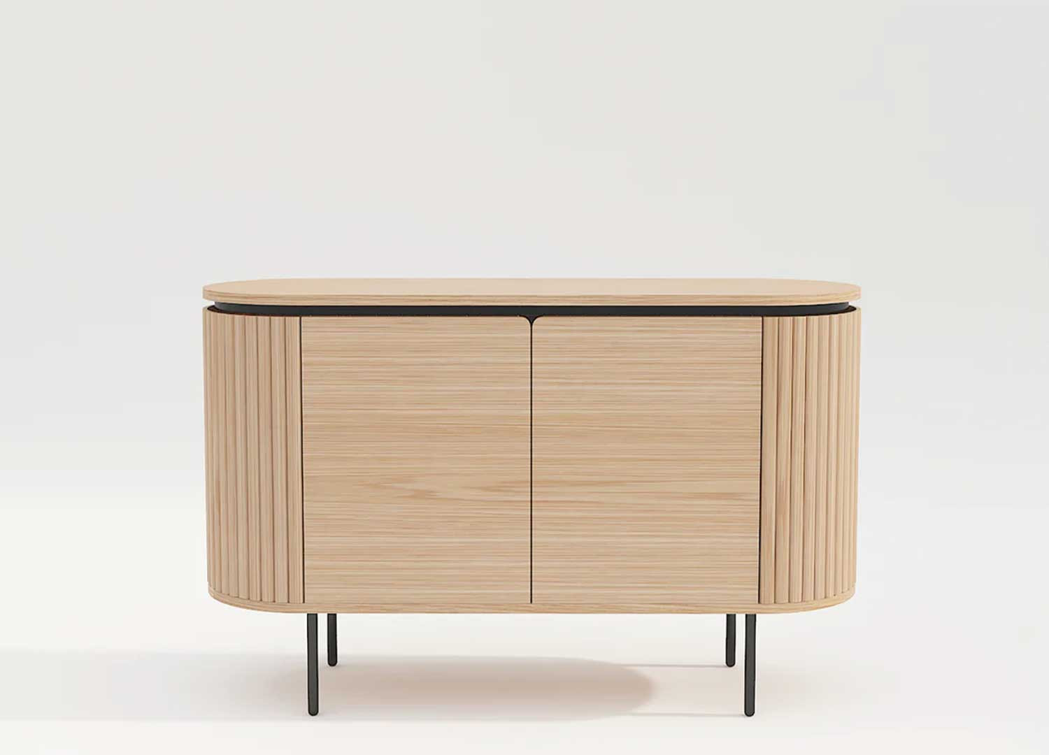 Le buffet Lili s’impose comme une pièce maîtresse de la salle à manger. Il est conçu en panneaux plaqués chêne naturel et soutenu par de fins pieds en métal noir. Ses quatre compartiments, dissimulés derrière deux portes à fermeture magnétique, offrent des rangements pratiques. Le design du buffet Lili se distingue par ses lignes douces et arrondies.