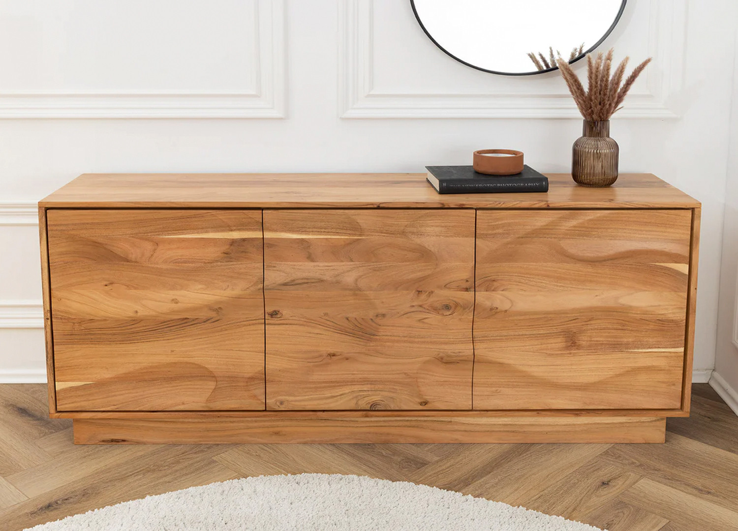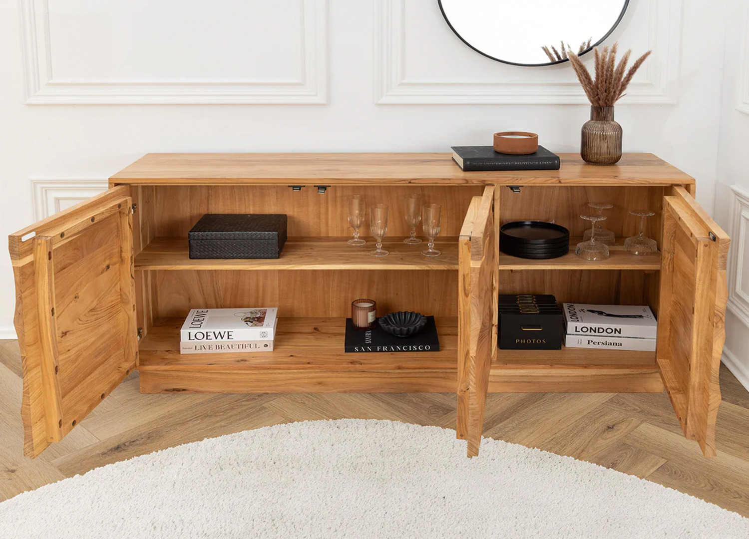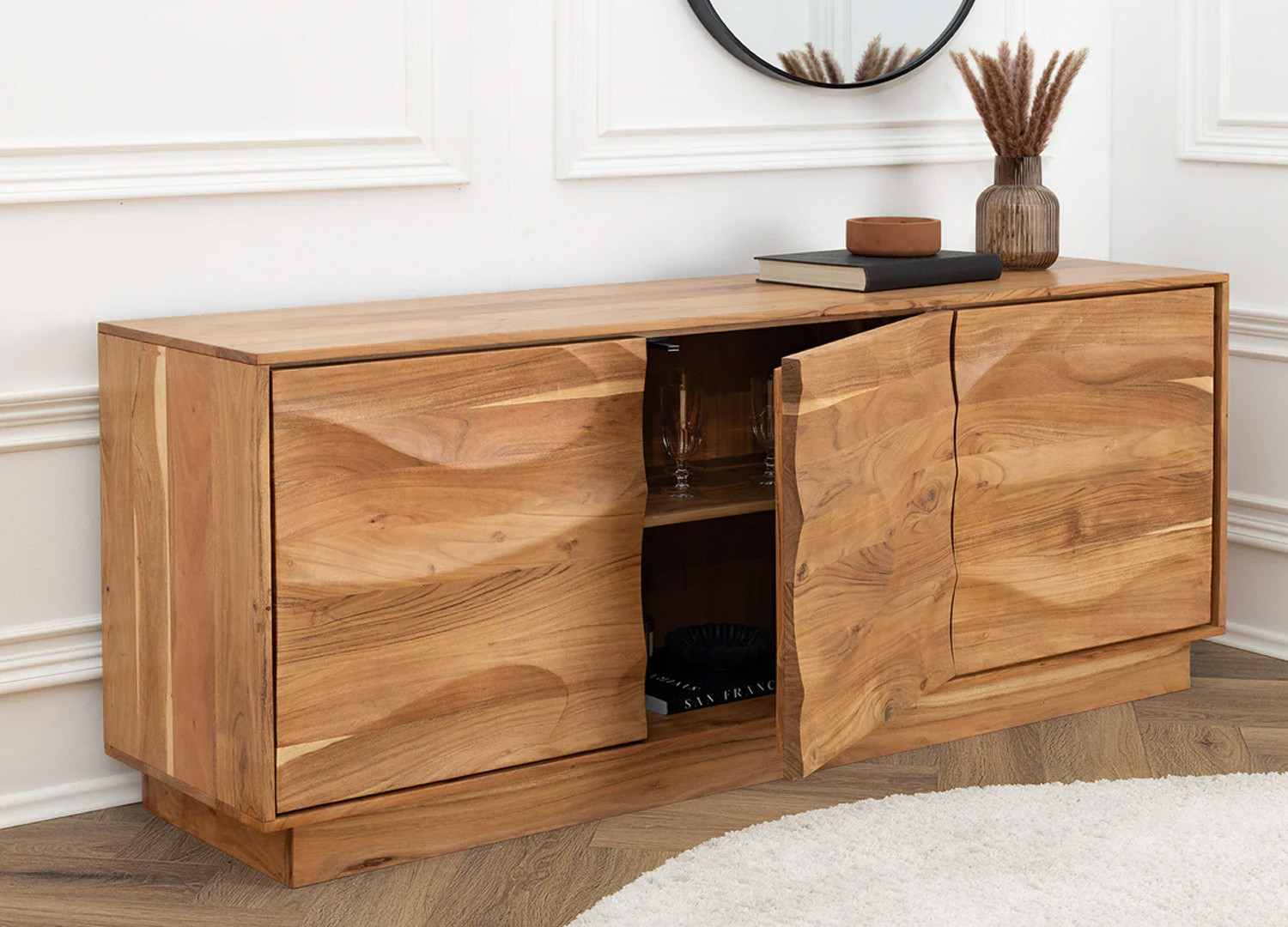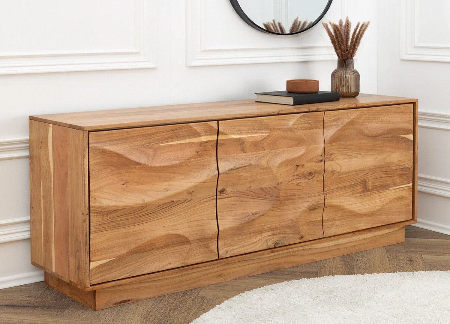 ✓ Avec son bois d’acacia massif et ses façades sculptées, le buffet Megane sublime la décoration de votre salle à manger.