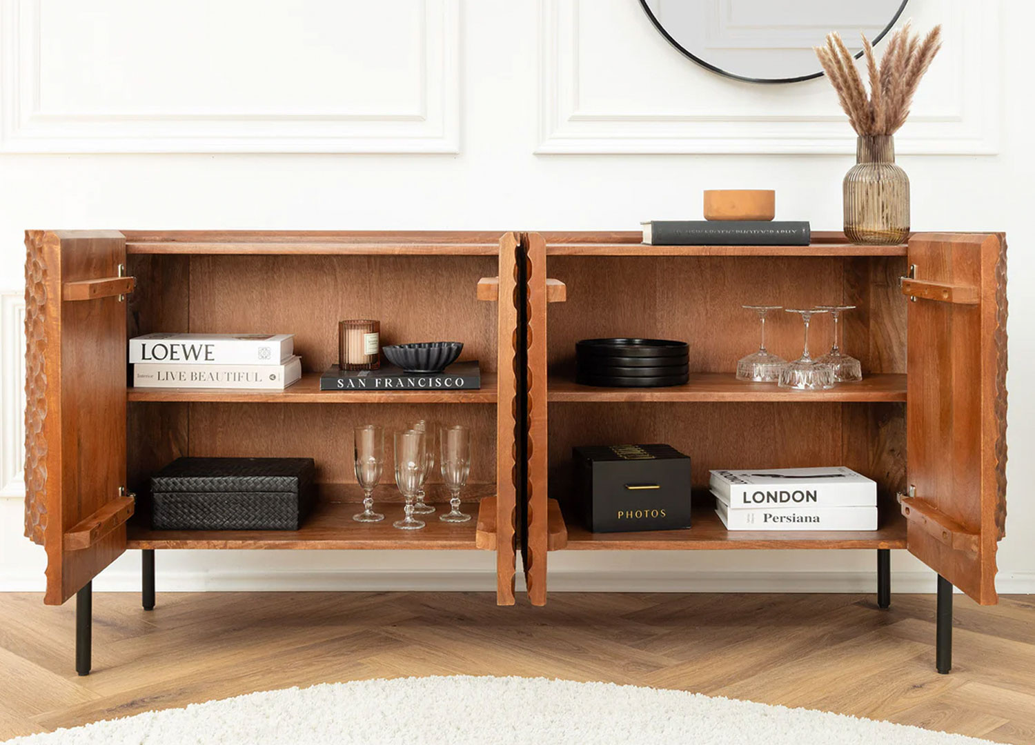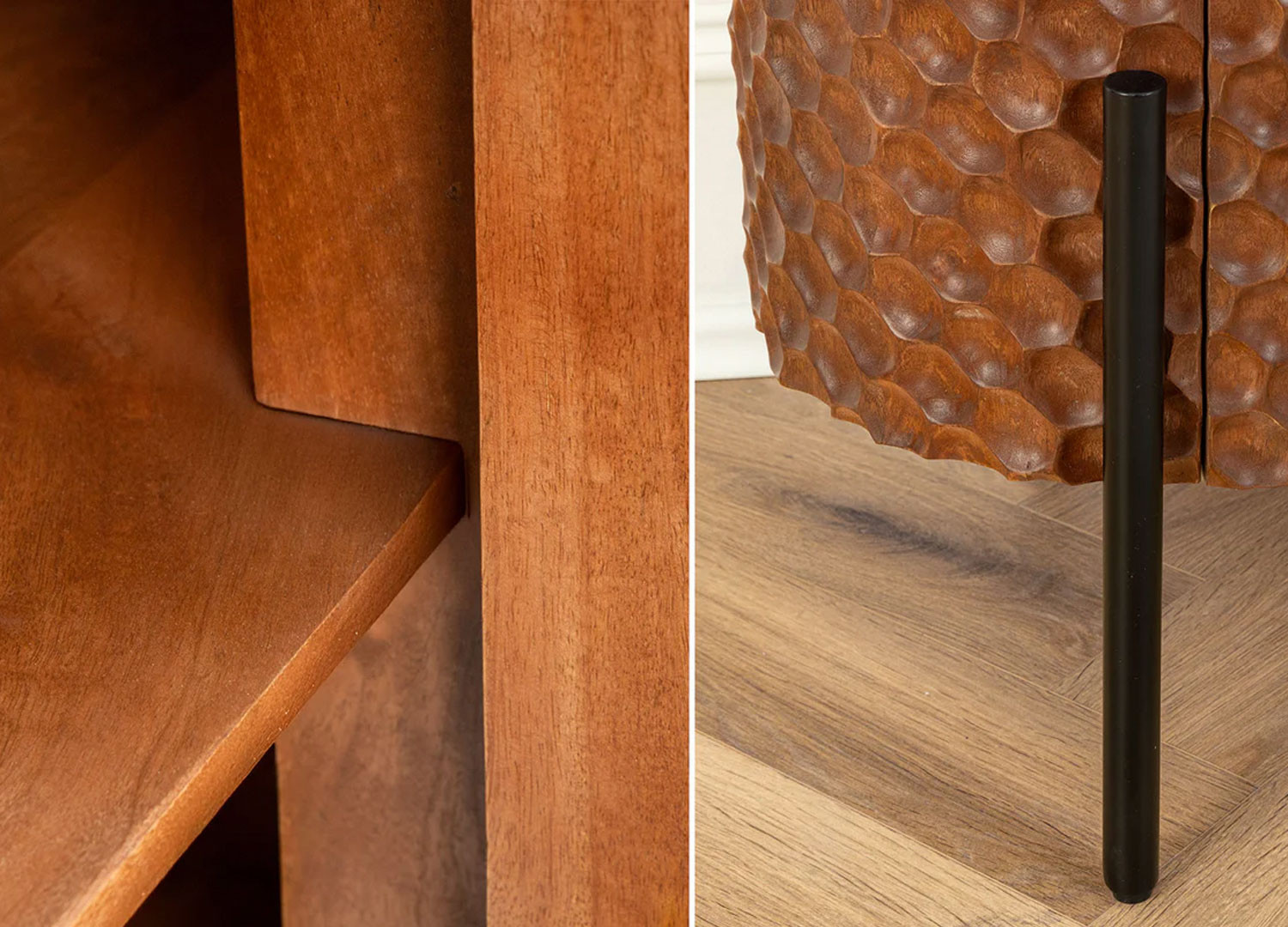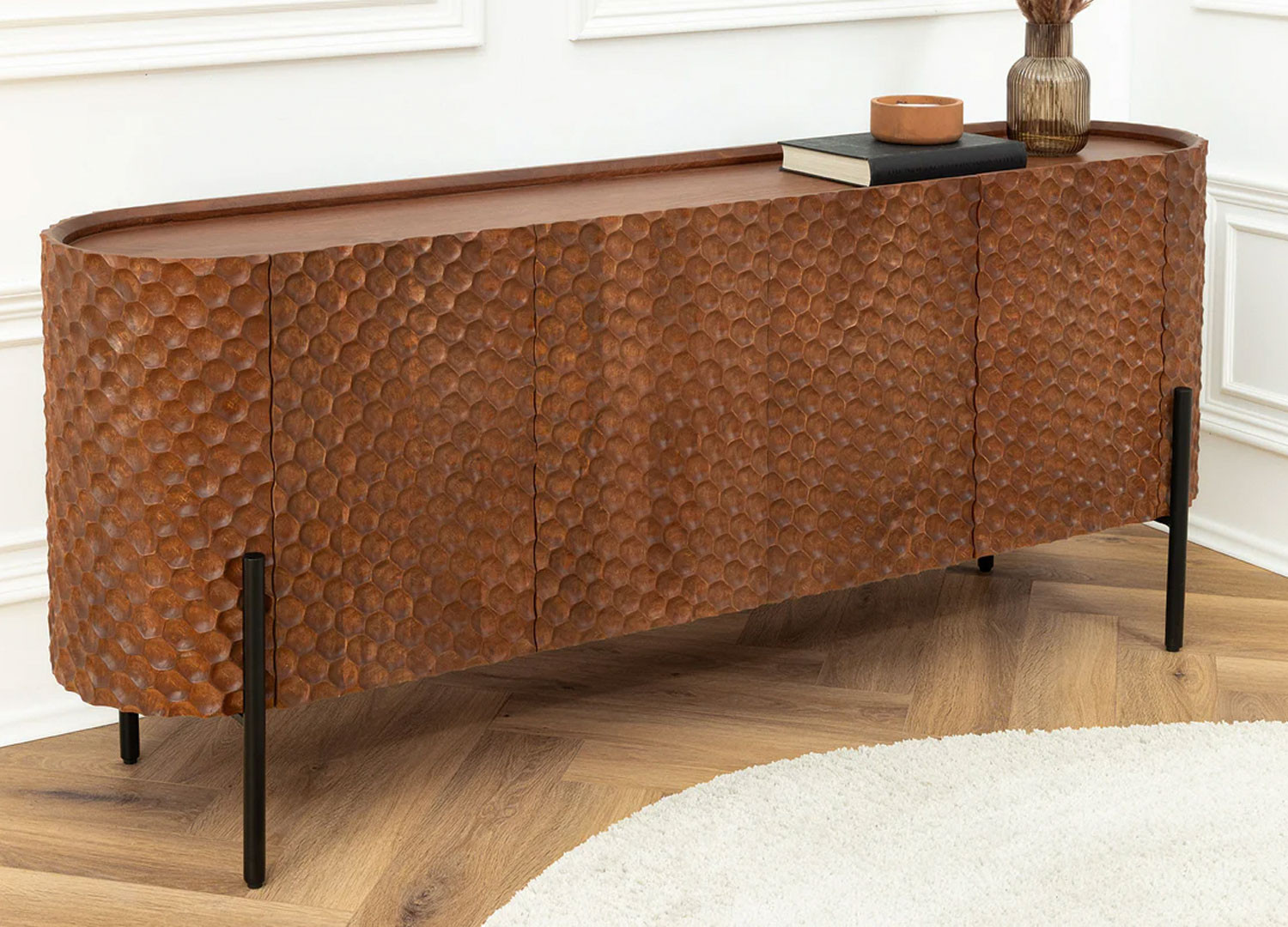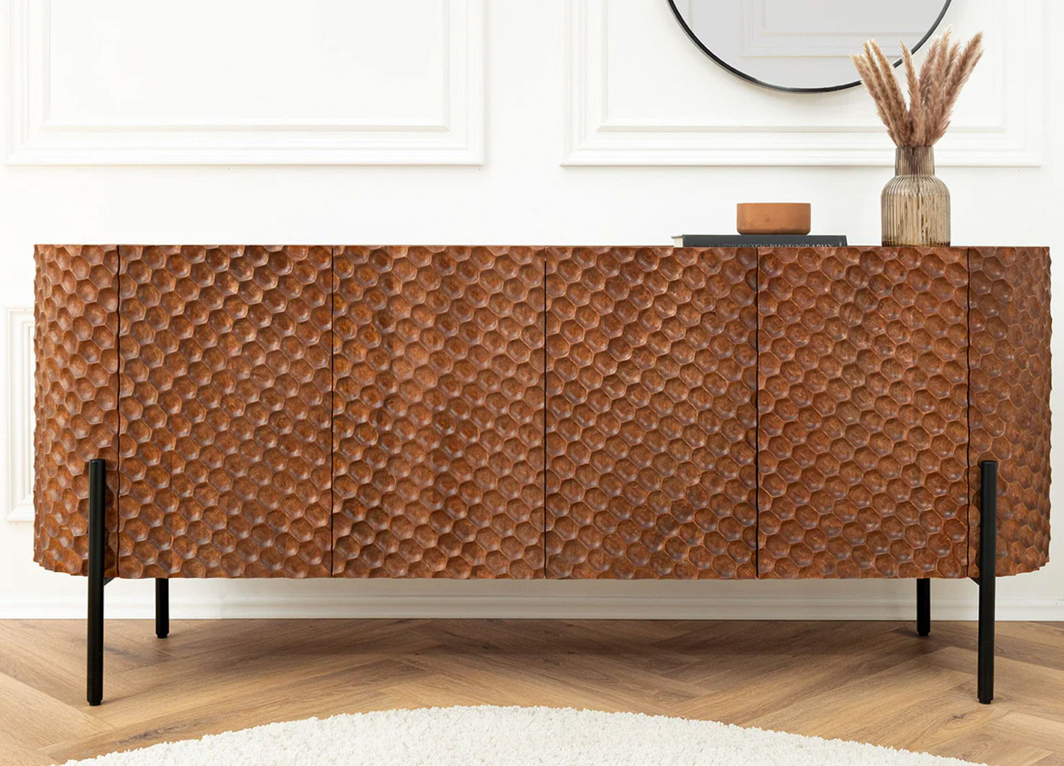 Le buffet Marlon en manguier marron arbore un look élégant et sculptural grâce à ses façades en relief 3D adoptant une structure en nid d’abeilles. Derrière ses quatre portes, ce buffet offre des espaces de rangement pour la vaisselle ou les accessoires de salle à manger. Il est monté sur des pieds métalliques fins de forme bâtons. Il peut être utilisé dans un salon ou une salle à manger comme pièce forte de décoration.