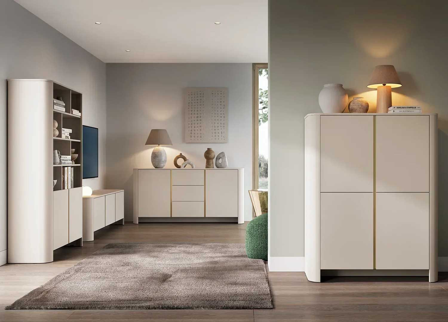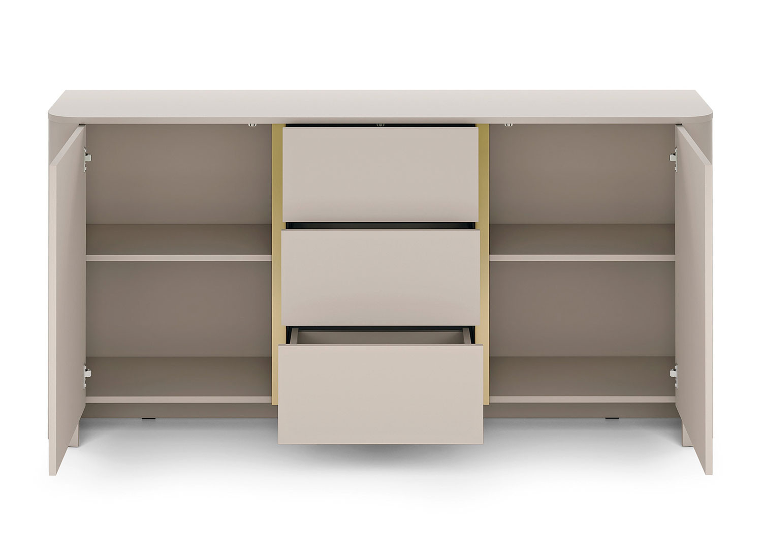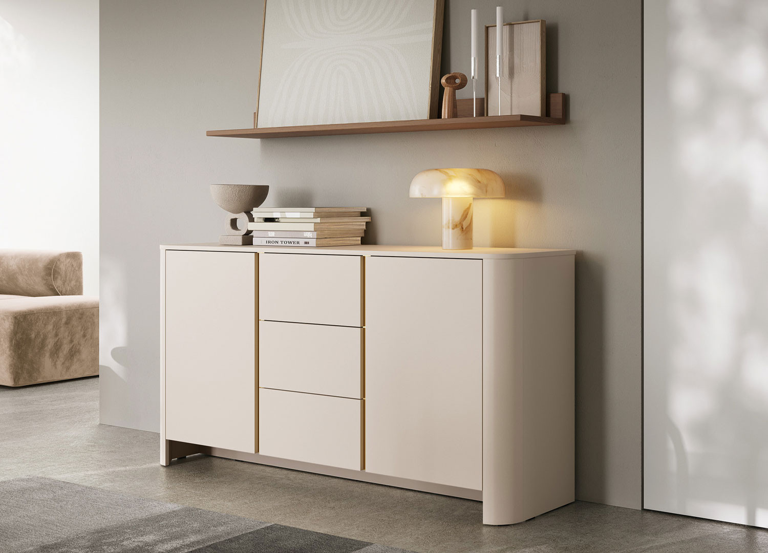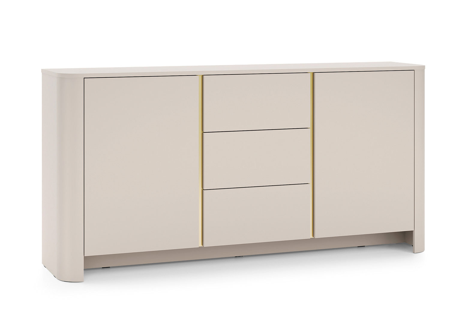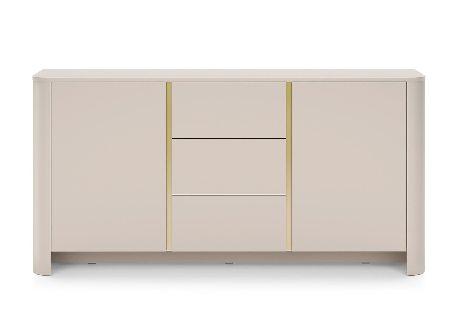 ✓ Le meuble buffet BARI transforme votre salle à manger en un espace contemporain grâce à ses formes arrondies, ses finitions dorées et sa teinte cachemire.