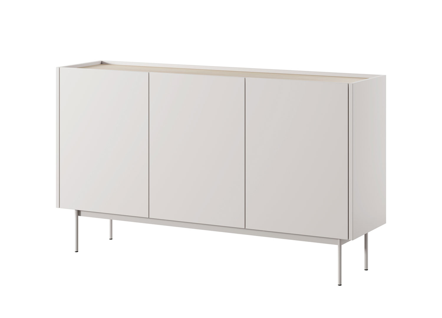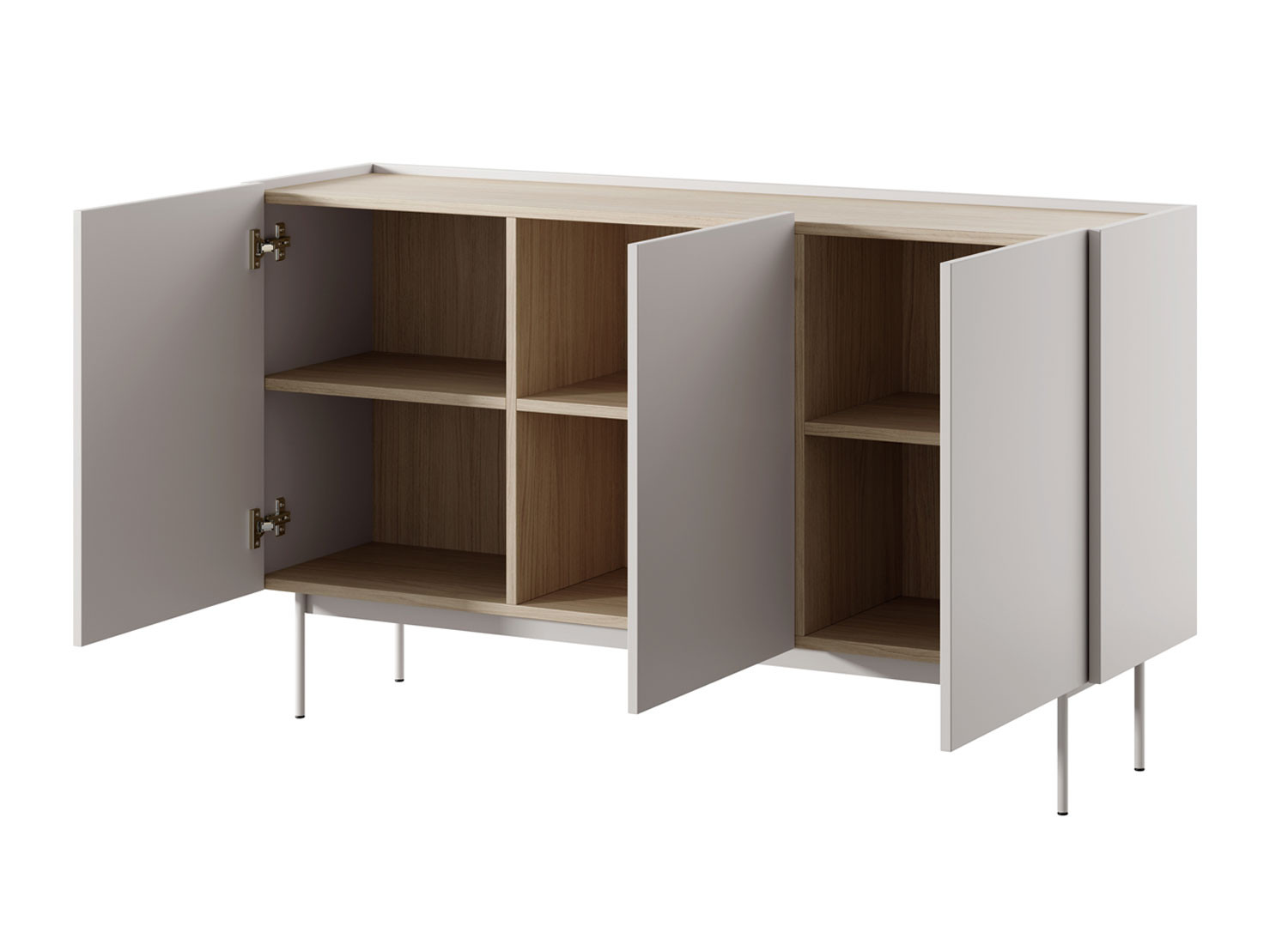 Issu de la collection Color, ce buffet de 144 cm est doté de trois portes dissimulant six compartiments offrant un bel espace de rangement pour la vaisselle ou les objets du quotidien. Sa finition cachemire associée à un plateau et à un intérieur en bois clair apporte une touche moderne à votre pièce. Ses lignes droites et ses pieds fins en métal lui donnent une allure contemporaine, facile à intégrer dans une salle à manger.