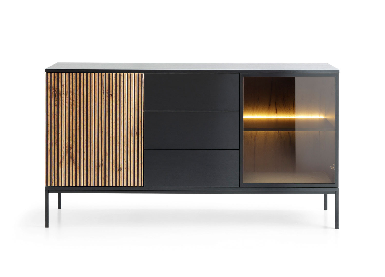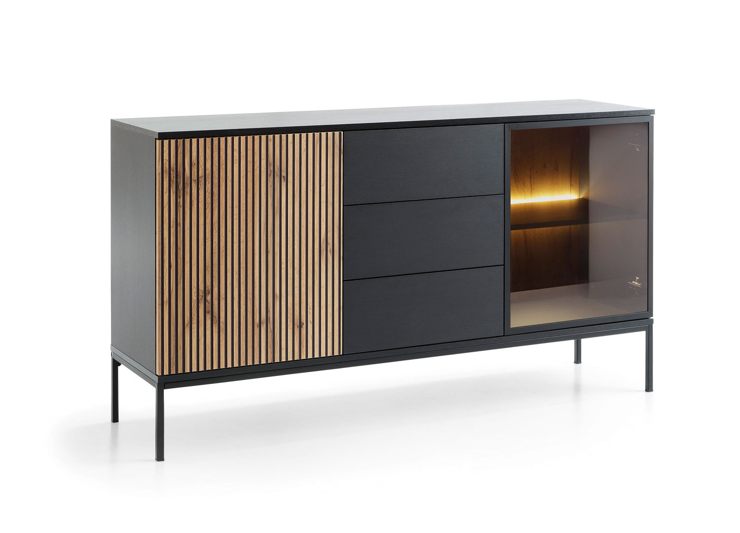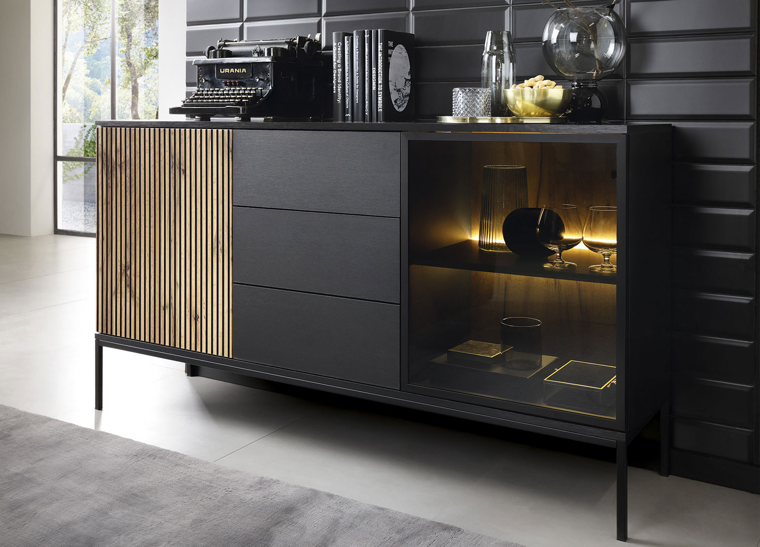 Le buffet Sento noir et chêne wotan dispose de deux portes dont une en verre avec un encadrement en aluminium noir et de trois tiroirs. Grâce à son système d’ouverture “push to open”, il offre une ligne fluide, sans poignées. L’éclairage LED intégré mettra en valeur vos plus beaux objets.