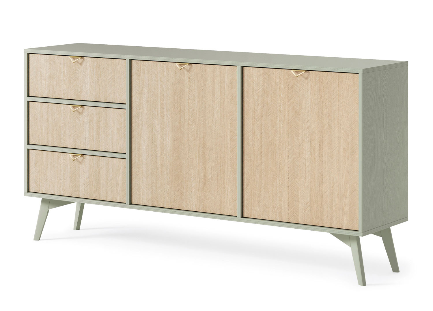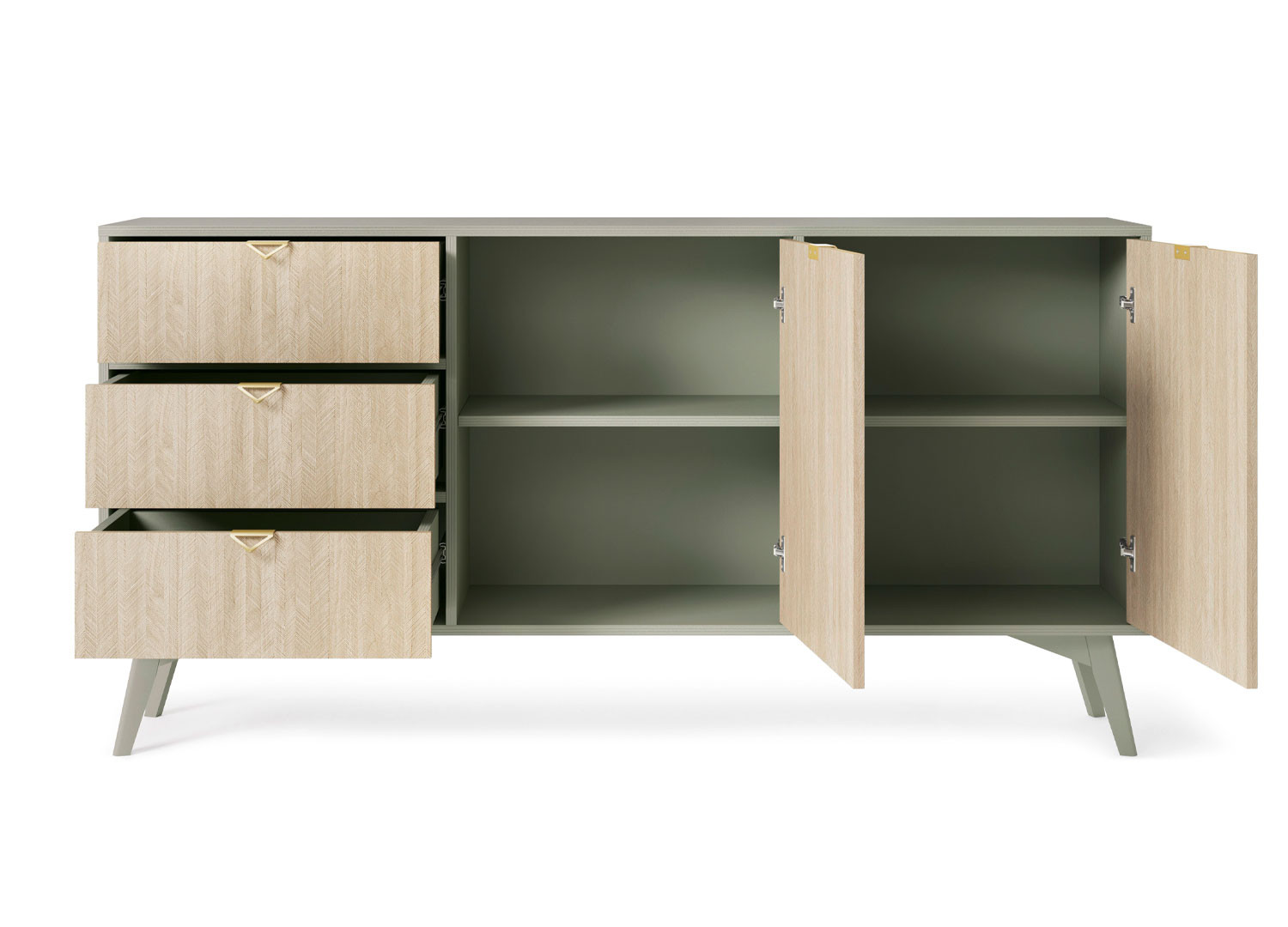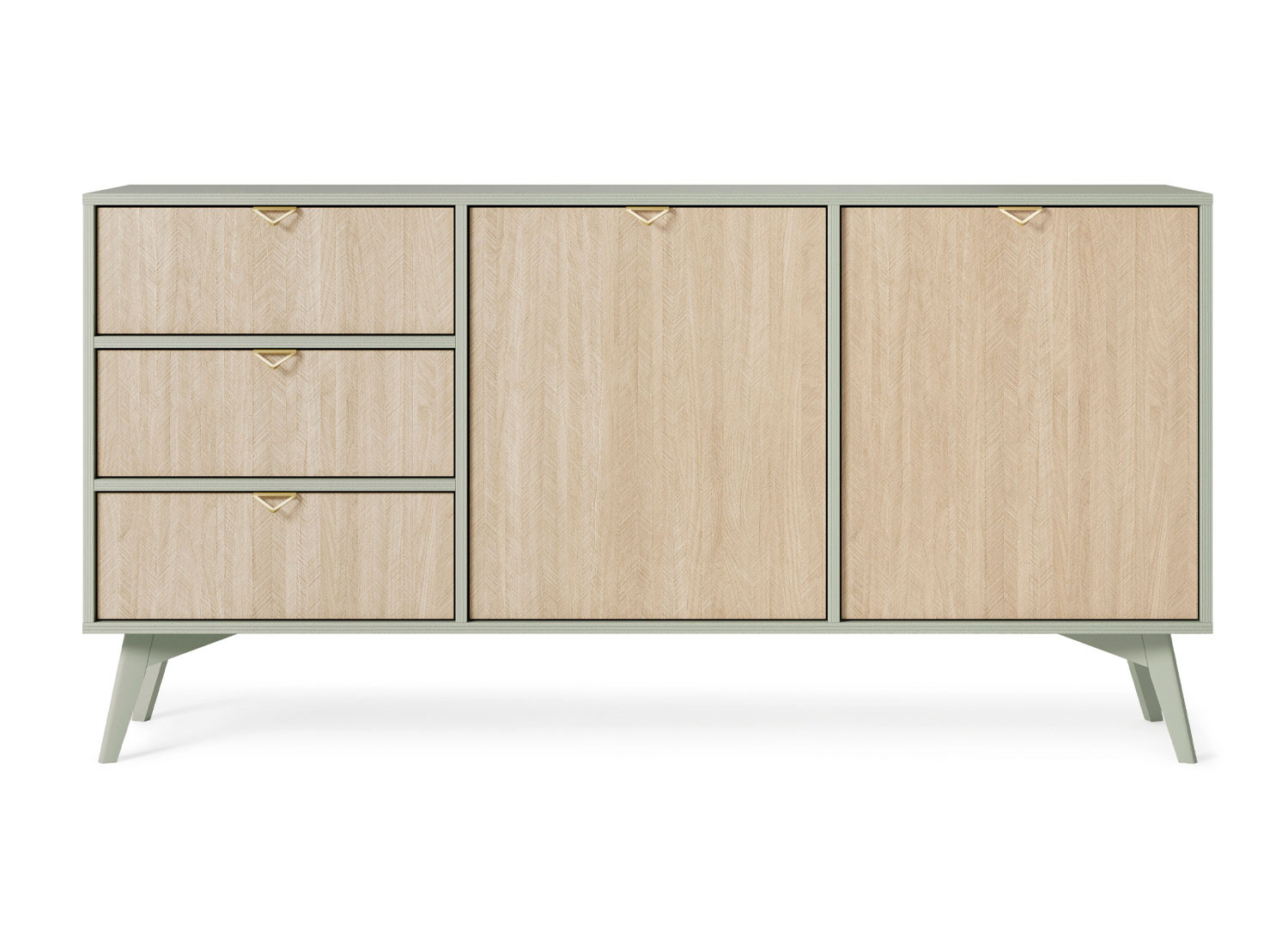 Apportez une touche de fraîcheur à votre intérieur avec le buffet Forest. Son design associe avec élégance le bois clair et une teinte verte. Avec ses trois tiroirs et ses deux portes, ce buffet offre du rangement pour la vaisselle. Il se distingue par ses poignées dorées et ses façades aux motifs chevrons pour créer une ambiance bohème.