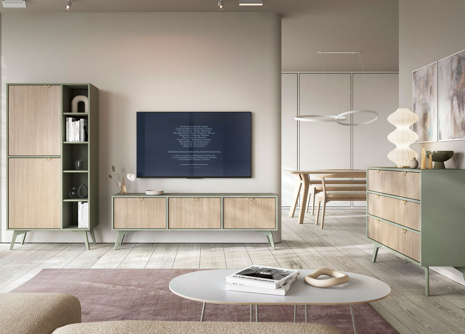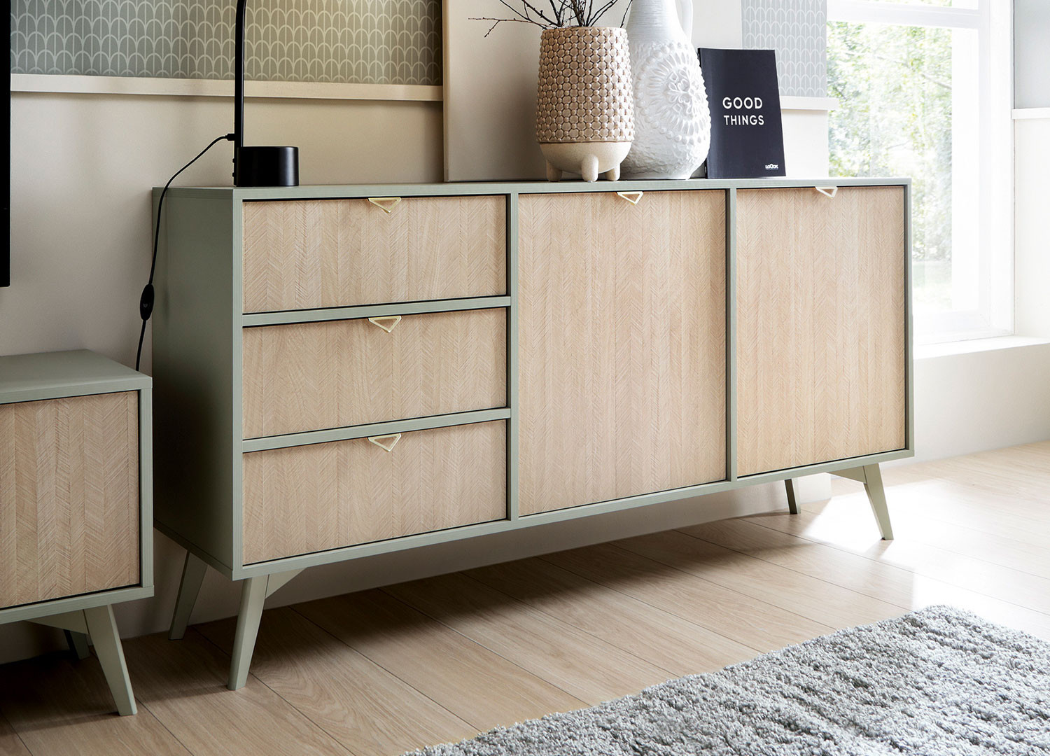 ✓ Le buffet Forest offre de grands espaces de rangement et un design naturel associant bois clair et vert pour une salle à manger harmonieuse.