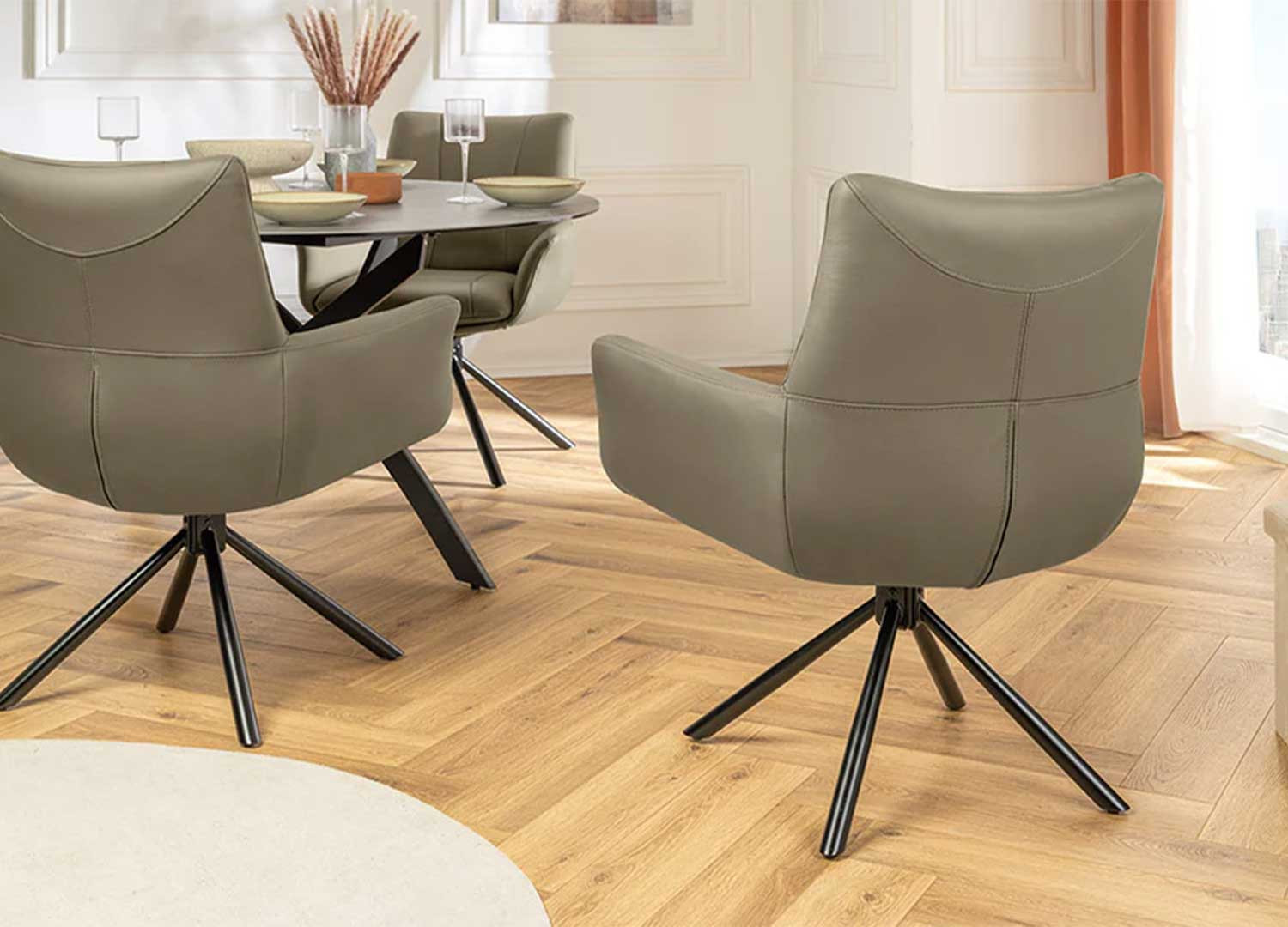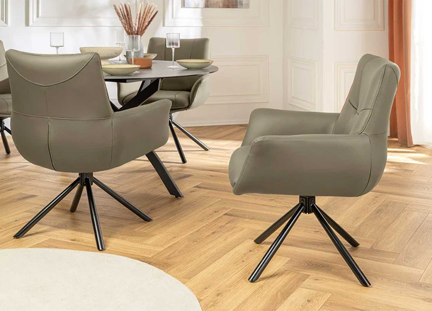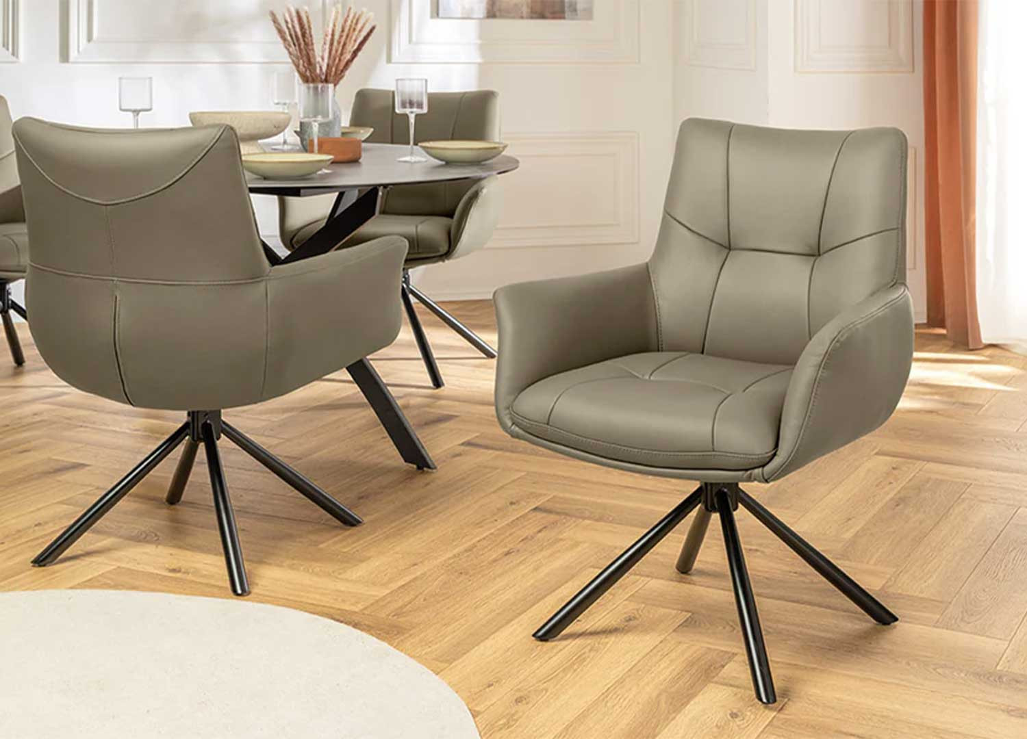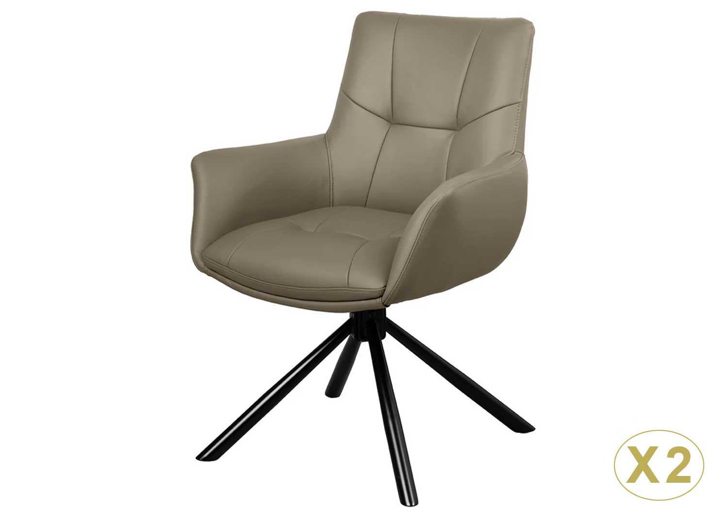 Pour des moments conviviaux autour d'une table à manger, ce lot de 2 chaises pivotantes en cuir couleur taupe sera parfait. Ces chaises disposent d'une assise rembourrée montée sur un piétement en métal noir, d'un dossier ergonomique et d'accoudoirs enveloppants pour une assise confortable.