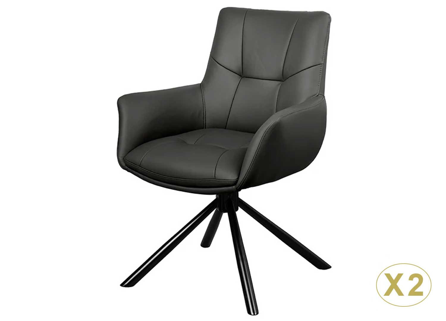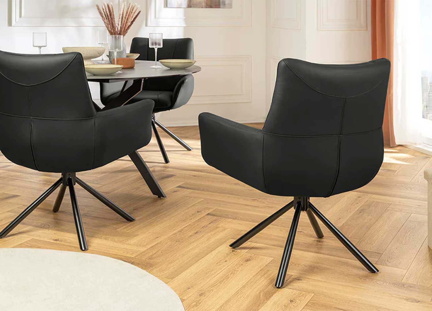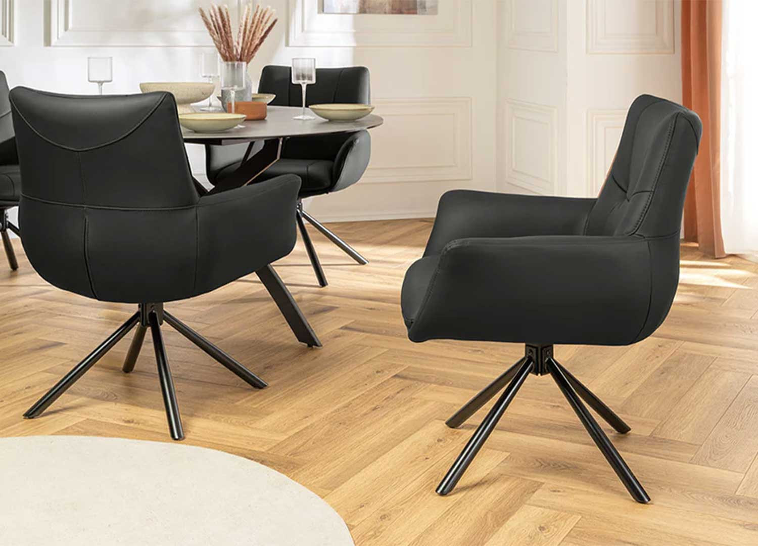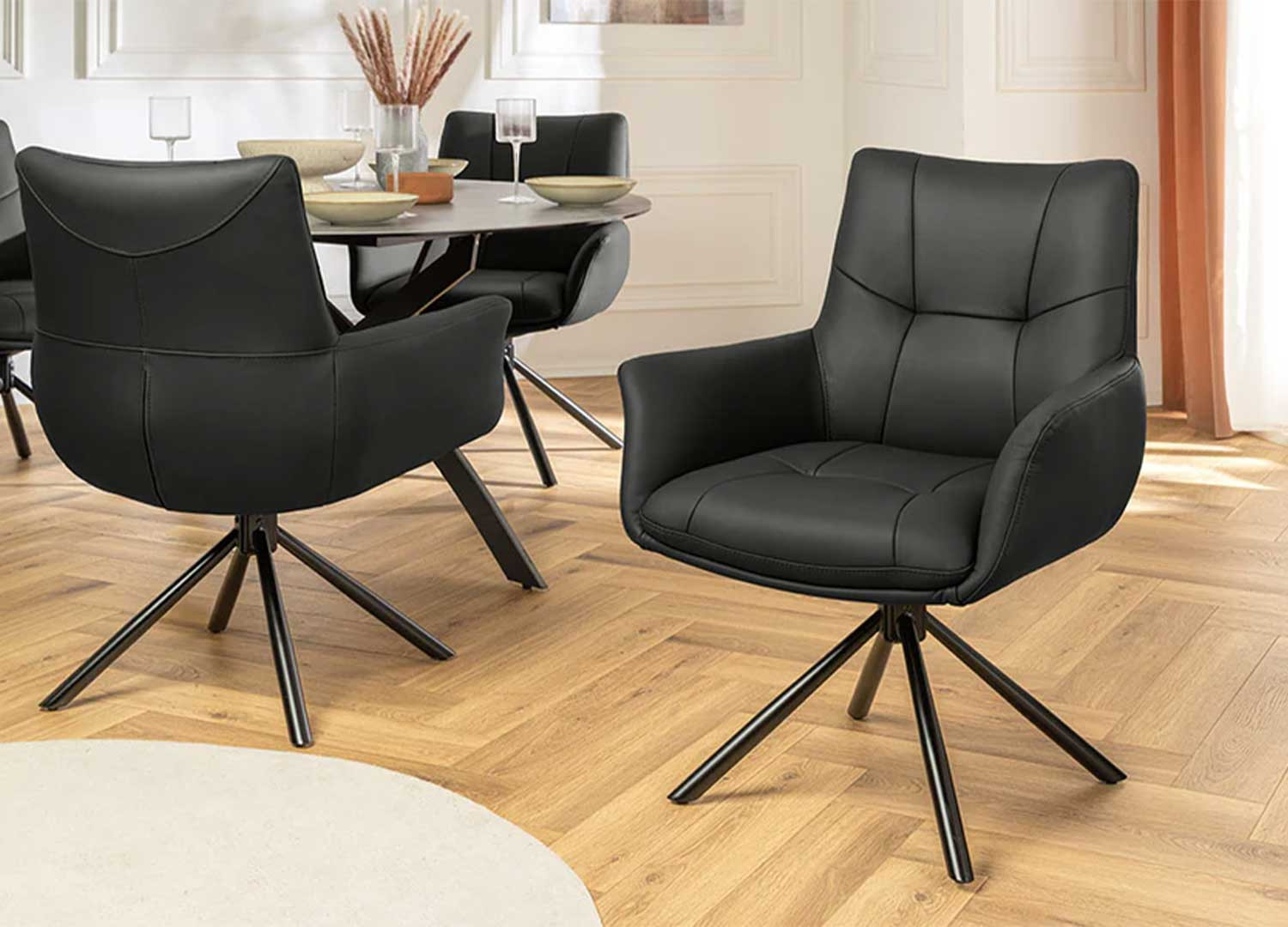 Pour des moments conviviaux autour d'une table à manger, ce lot de 2 chaises pivotantes en cuir couleur noir sera parfait. Ces chaises disposent d'une assise rembourrée montée sur un piétement en métal noir, d'un dossier ergonomique et d'accoudoirs enveloppants pour une assise confortable.