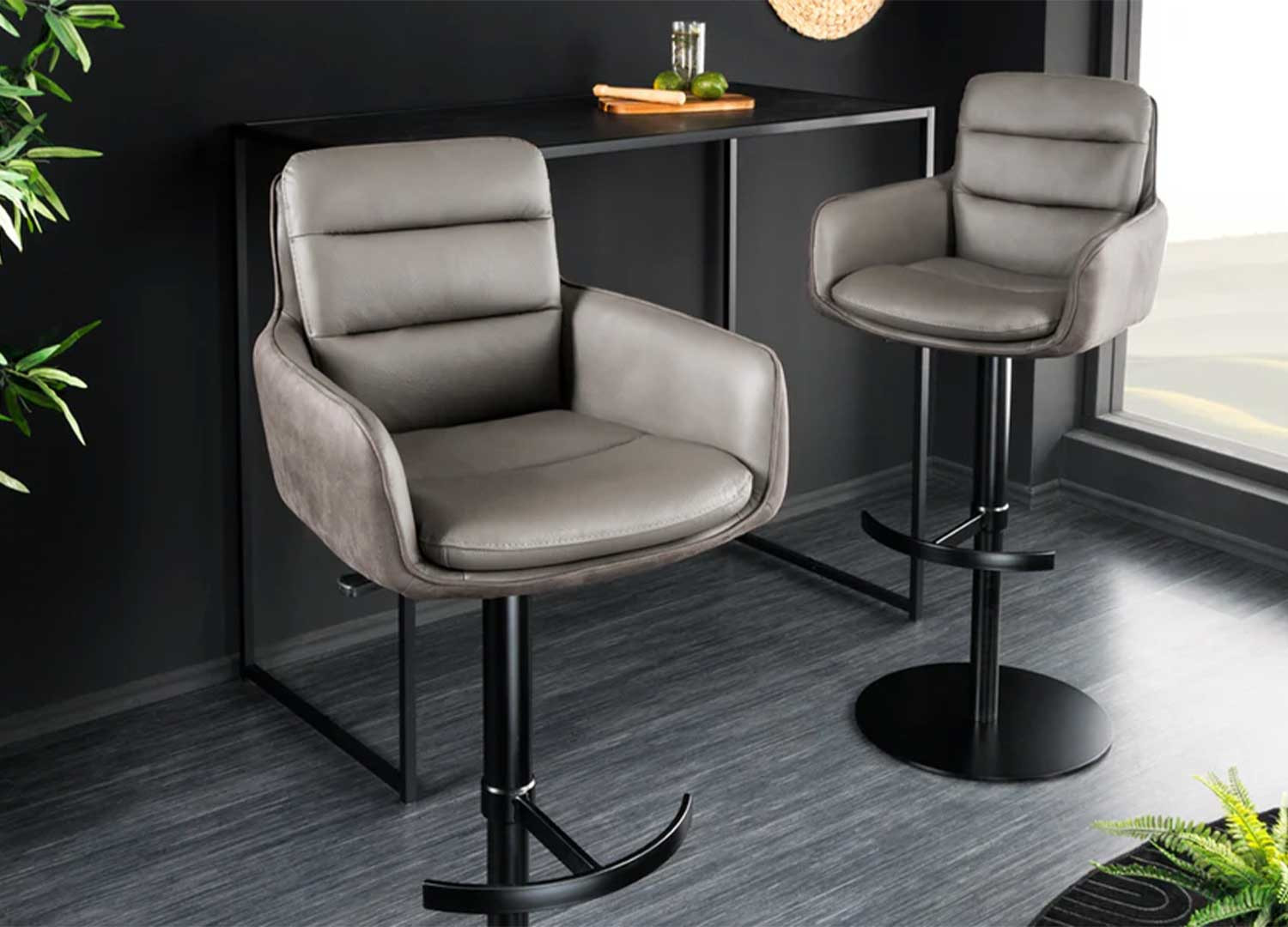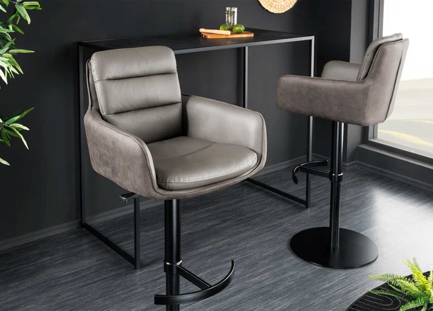 ✓ Apportez du style à votre salle à manger ou à votre table de bar avec la chaise de bar Abby. Pivotante, réglable en hauteur et habillée de microfibre et cuir taupe, elle séduit par ses accoudoirs enveloppants et son pied métal noir au design moderne.