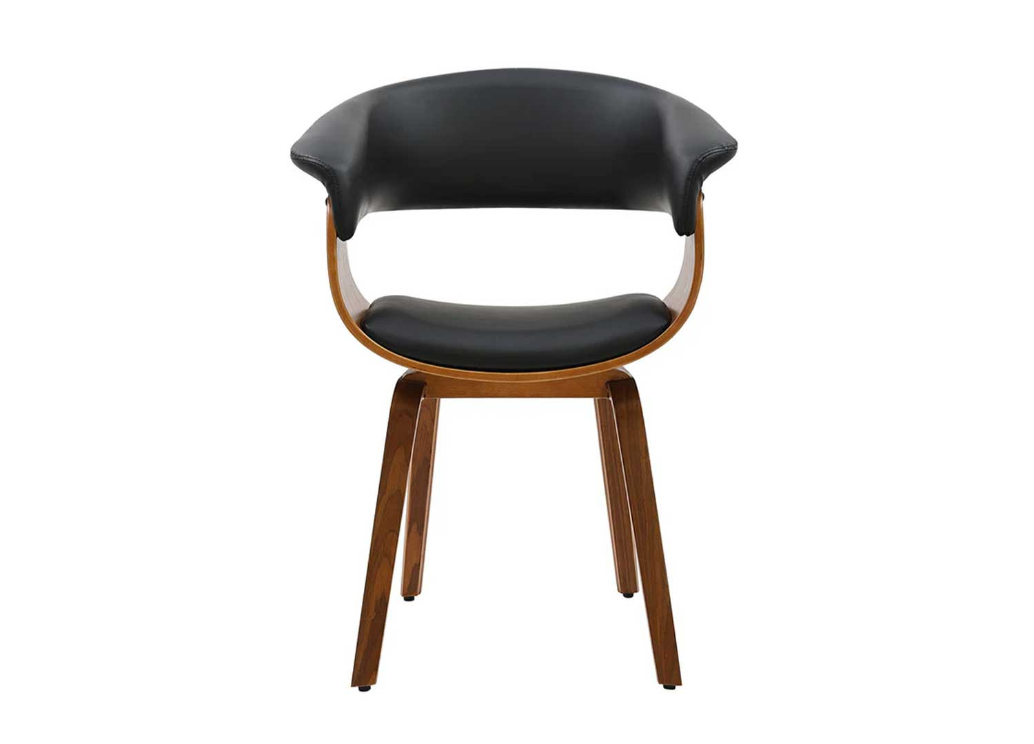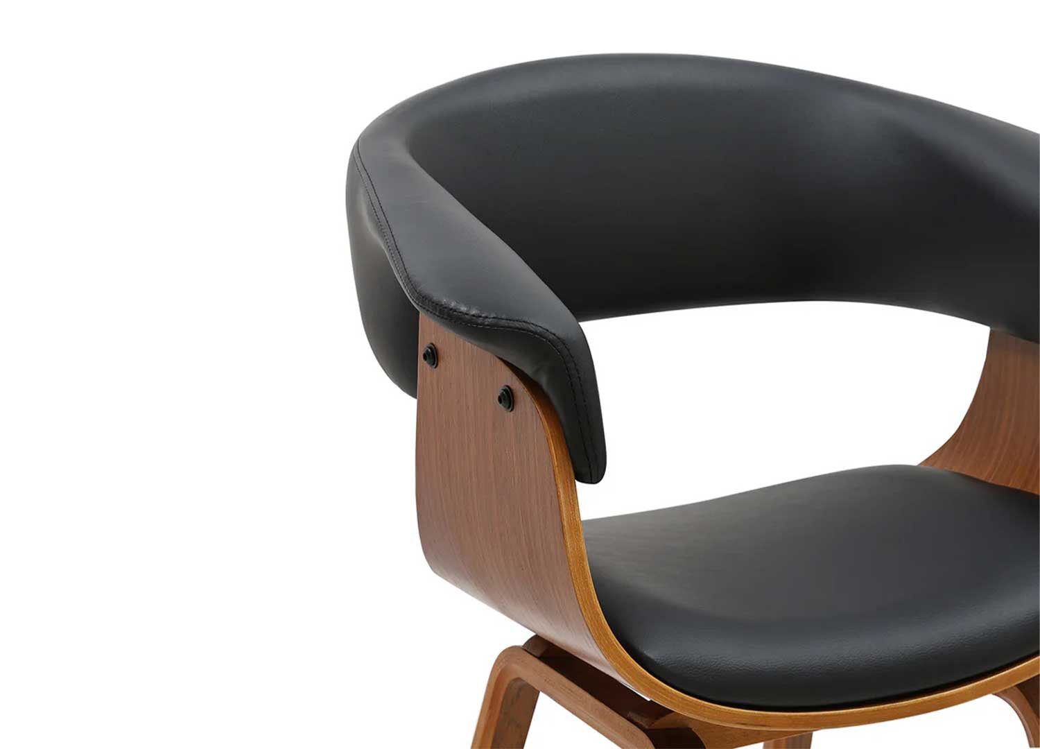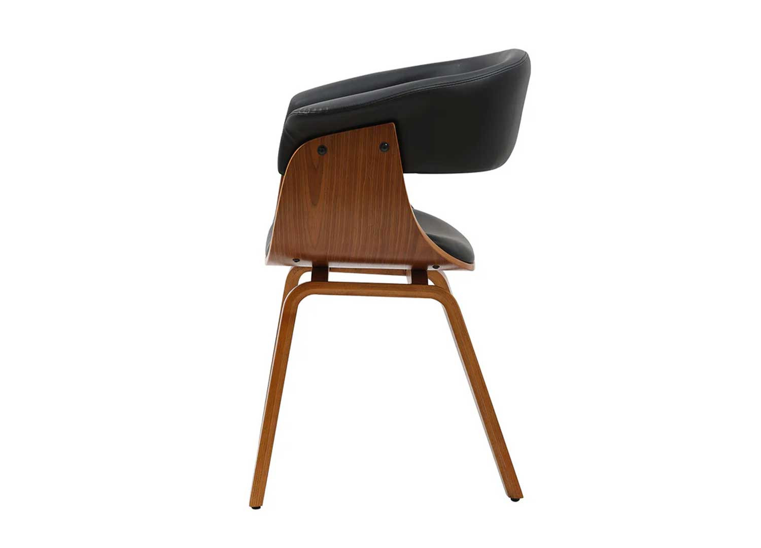 La chaise Oliver mise sur son style rétro. Son assise en simili cuir noir se marie avec une coque en bois noyer aux courbes arrondies qui enveloppent subtilement l'assise et les accoudoirs. Les pieds en bois, légèrement évasés offrent un style scandinave.