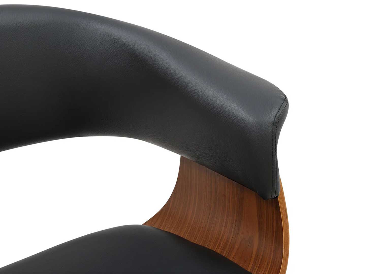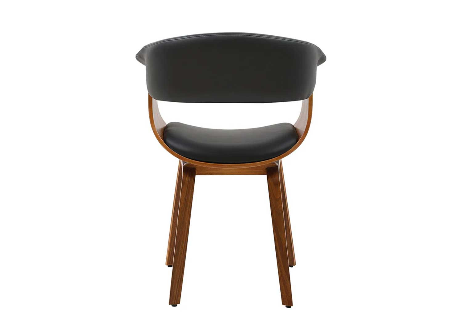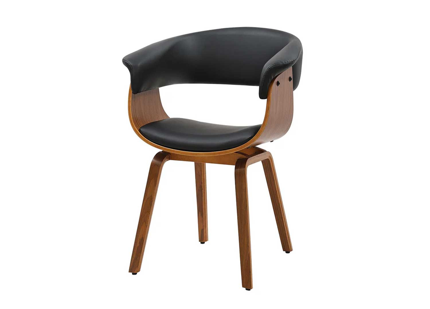 La chaise Oliver mise sur son style rétro. Son assise en simili cuir noir se marie avec une coque en bois noyer aux courbes arrondies qui enveloppent subtilement l'assise et les accoudoirs. Les pieds en bois, légèrement évasés offrent un style scandinave.