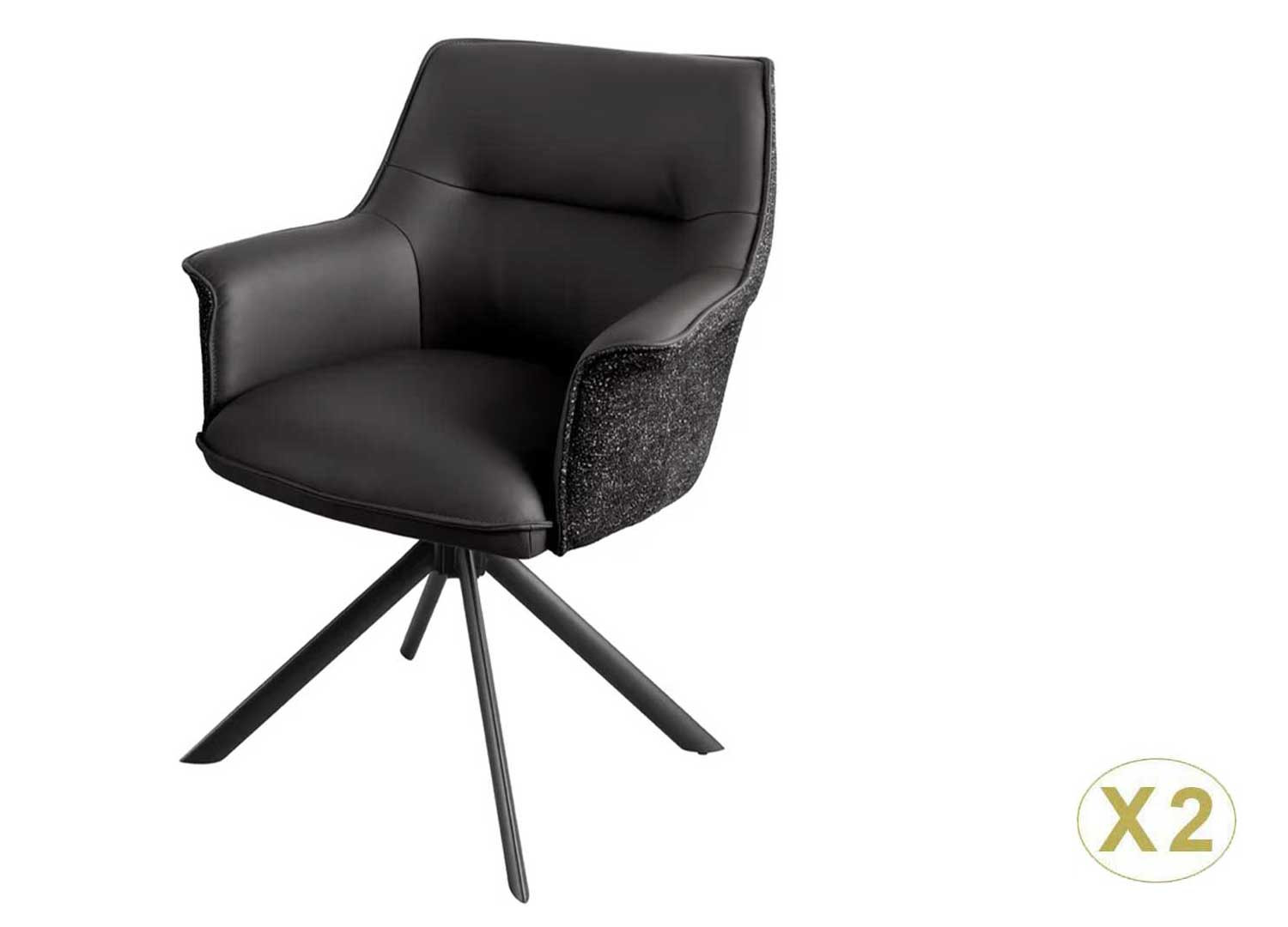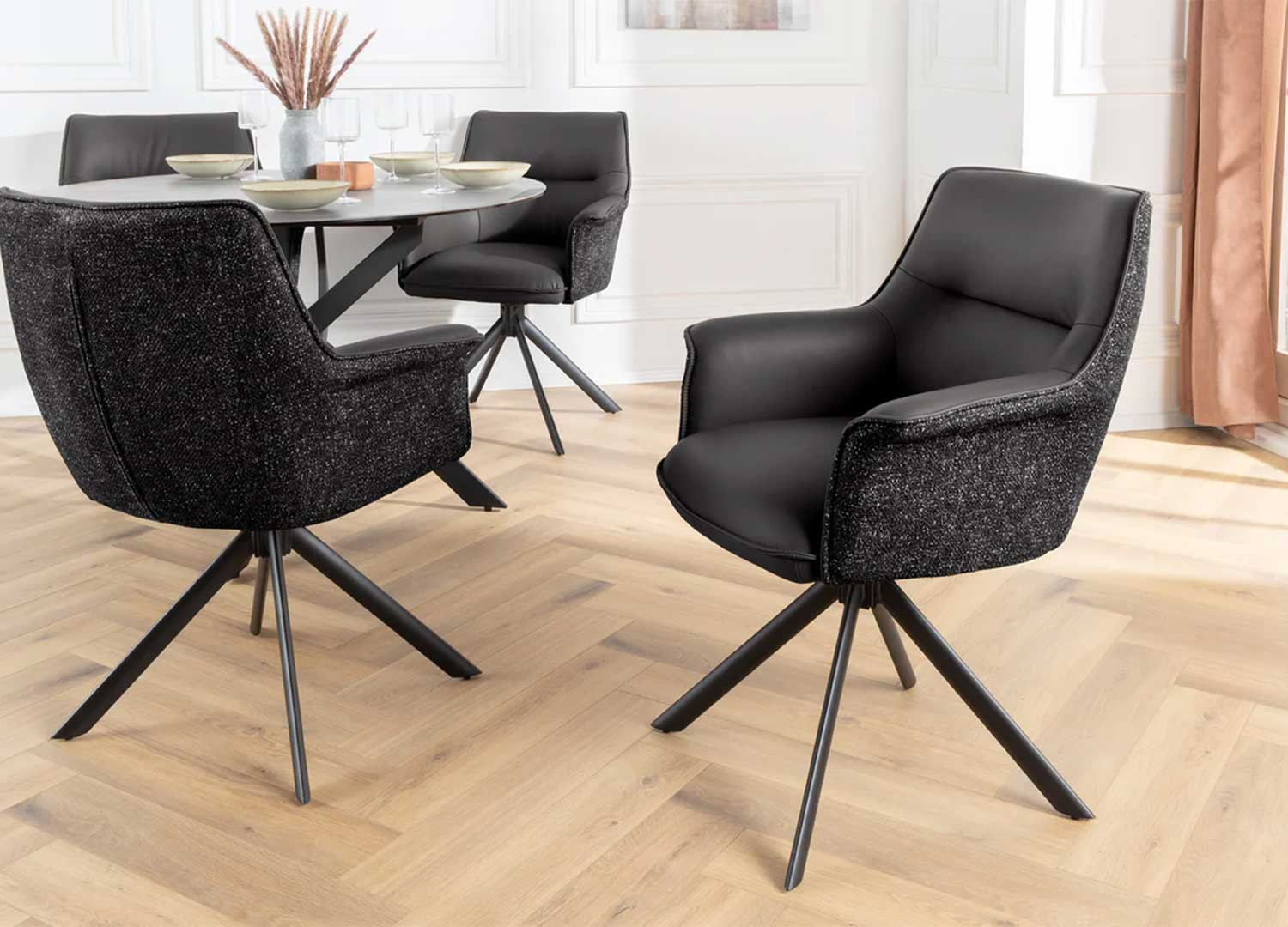 La chaise pivotante Darek est revêtue de cuir véritable et de tissu structuré noir. Son mécanisme pivotant à 180° avec retour automatique offre une assise pratique, idéale pour la salle à manger. Elle dispose d'accoudoirs intégrés et d'une assise rembourrée garantissant un confort optimal. Avec son design moderne, cette chaise s’intègre aussi bien dans un intérieur contemporain, industriel ou rétro chic.