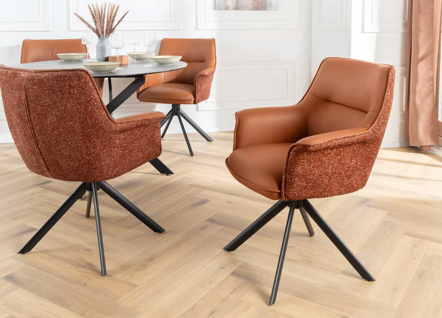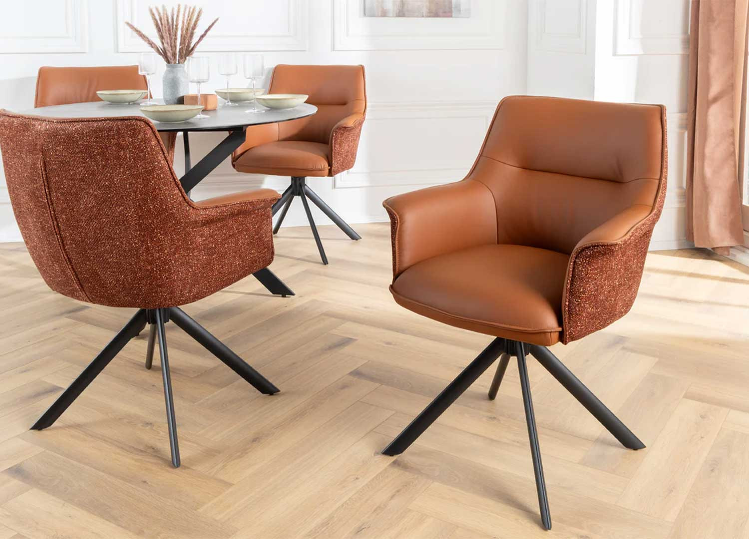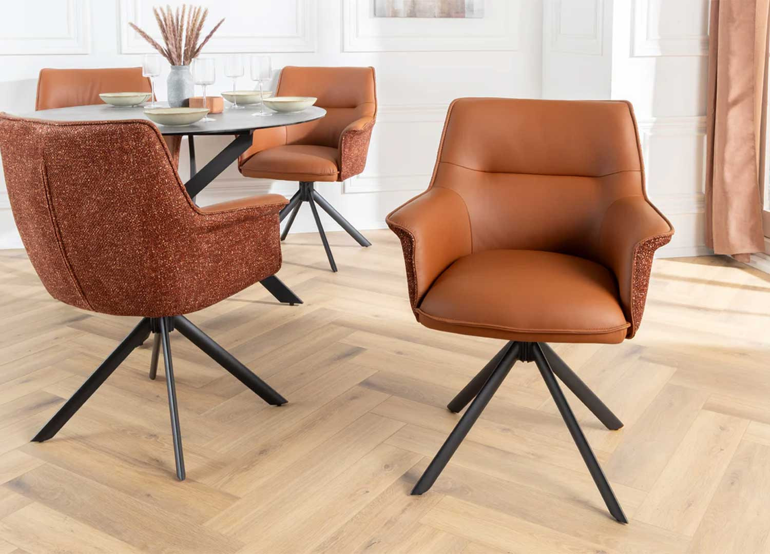 La chaise pivotante Darek est revêtue de cuir véritable et de tissu structuré marron. Son mécanisme pivotant à 180° avec retour automatique offre une assise pratique, idéale pour la salle à manger. Elle dispose d'accoudoirs intégrés et d'une assise rembourrée garantissant un confort optimal. Avec son design moderne, cette chaise s’intègre aussi bien dans un intérieur contemporain, industriel ou rétro chic.