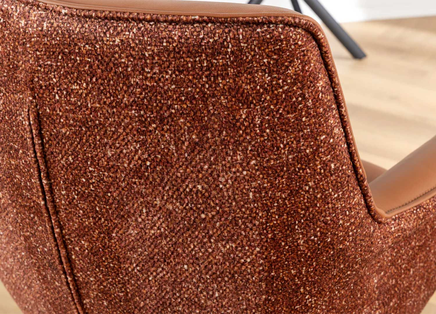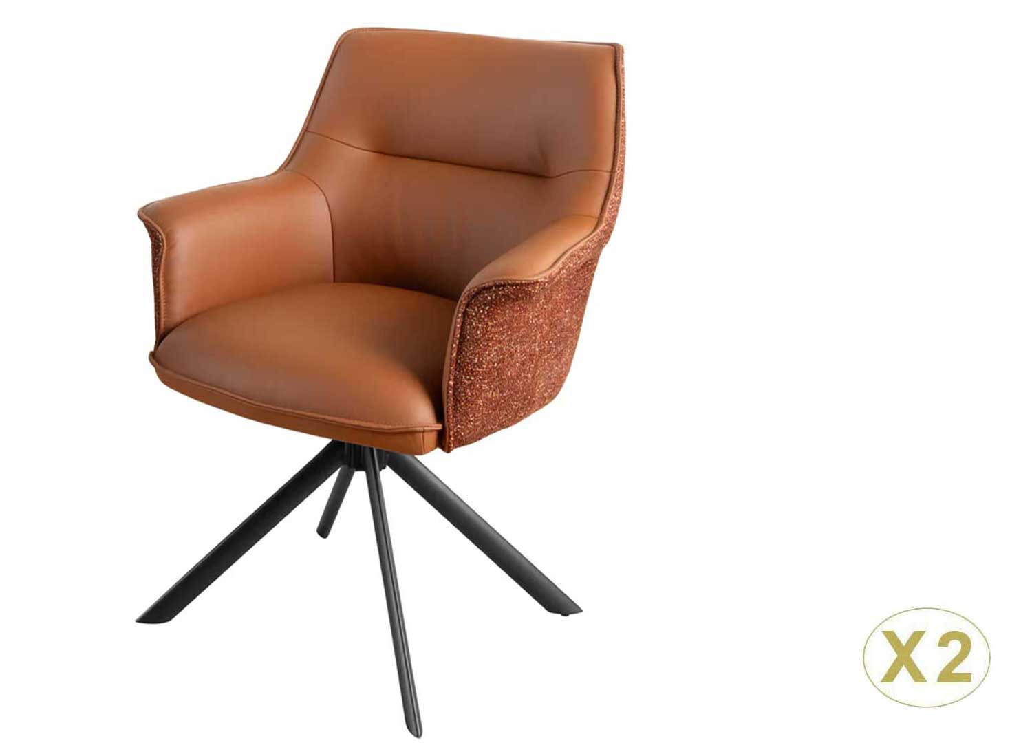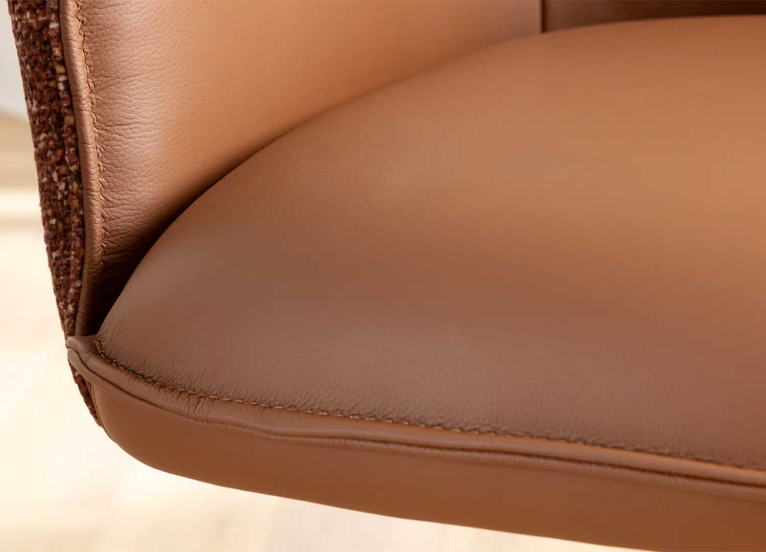 La chaise pivotante Darek est revêtue de cuir véritable et de tissu structuré marron. Son mécanisme pivotant à 180° avec retour automatique offre une assise pratique, idéale pour la salle à manger. Elle dispose d'accoudoirs intégrés et d'une assise rembourrée garantissant un confort optimal. Avec son design moderne, cette chaise s’intègre aussi bien dans un intérieur contemporain, industriel ou rétro chic.