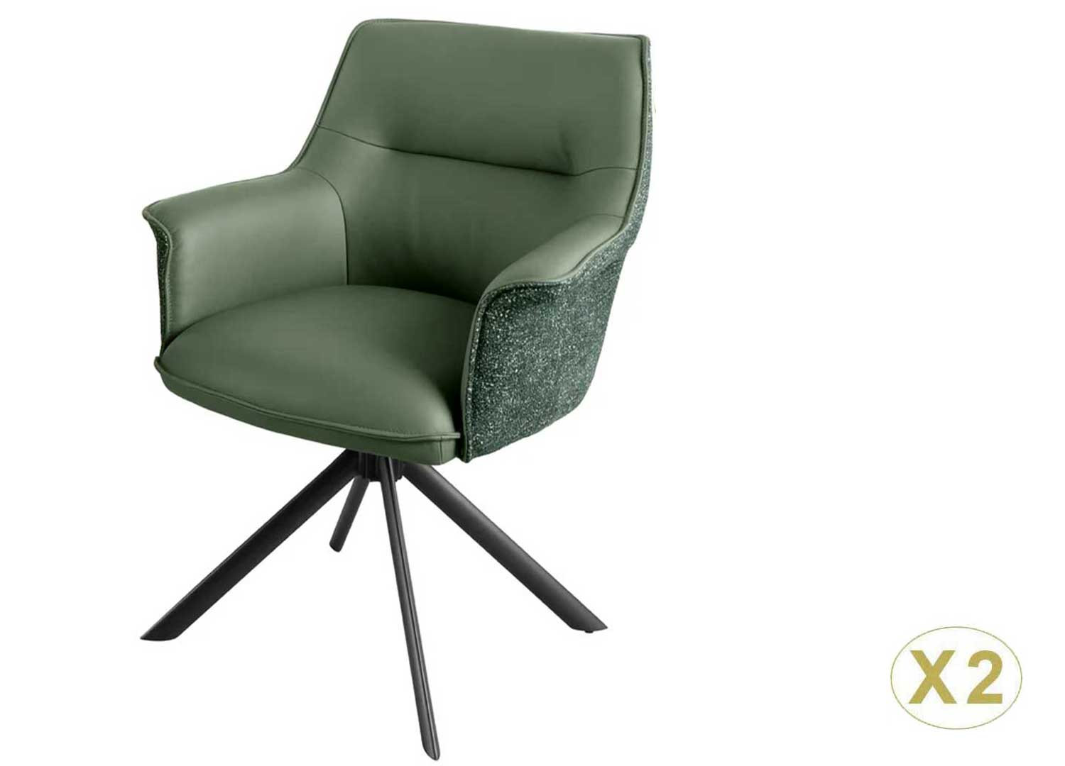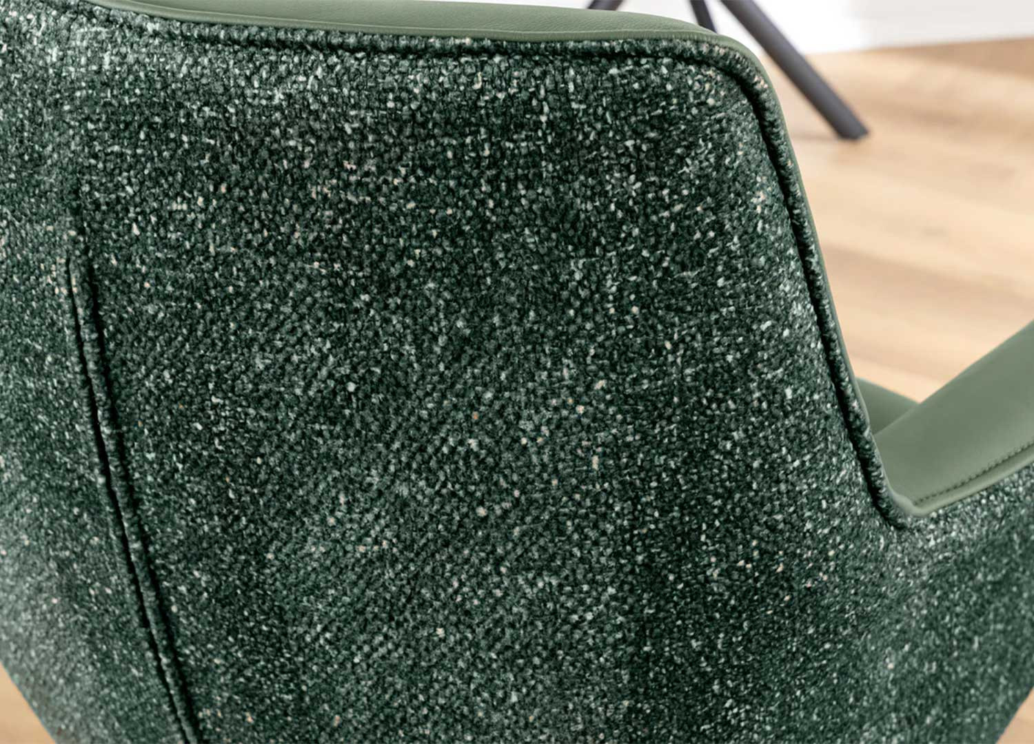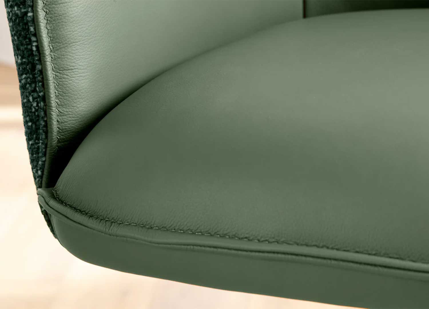 Le fauteuil pivotant Darek est revêtu de cuir véritable et de tissu structuré vert. Son mécanisme pivotant à 180° avec retour automatique offre une assise pratique, idéale pour la salle à manger. Il dispose d'accoudoirs intégrés et d'une assise rembourrée garantissant un confort optimal. Avec son design moderne, ce fauteuil de table s’intègre aussi bien dans un intérieur contemporain, industriel ou rétro chic.