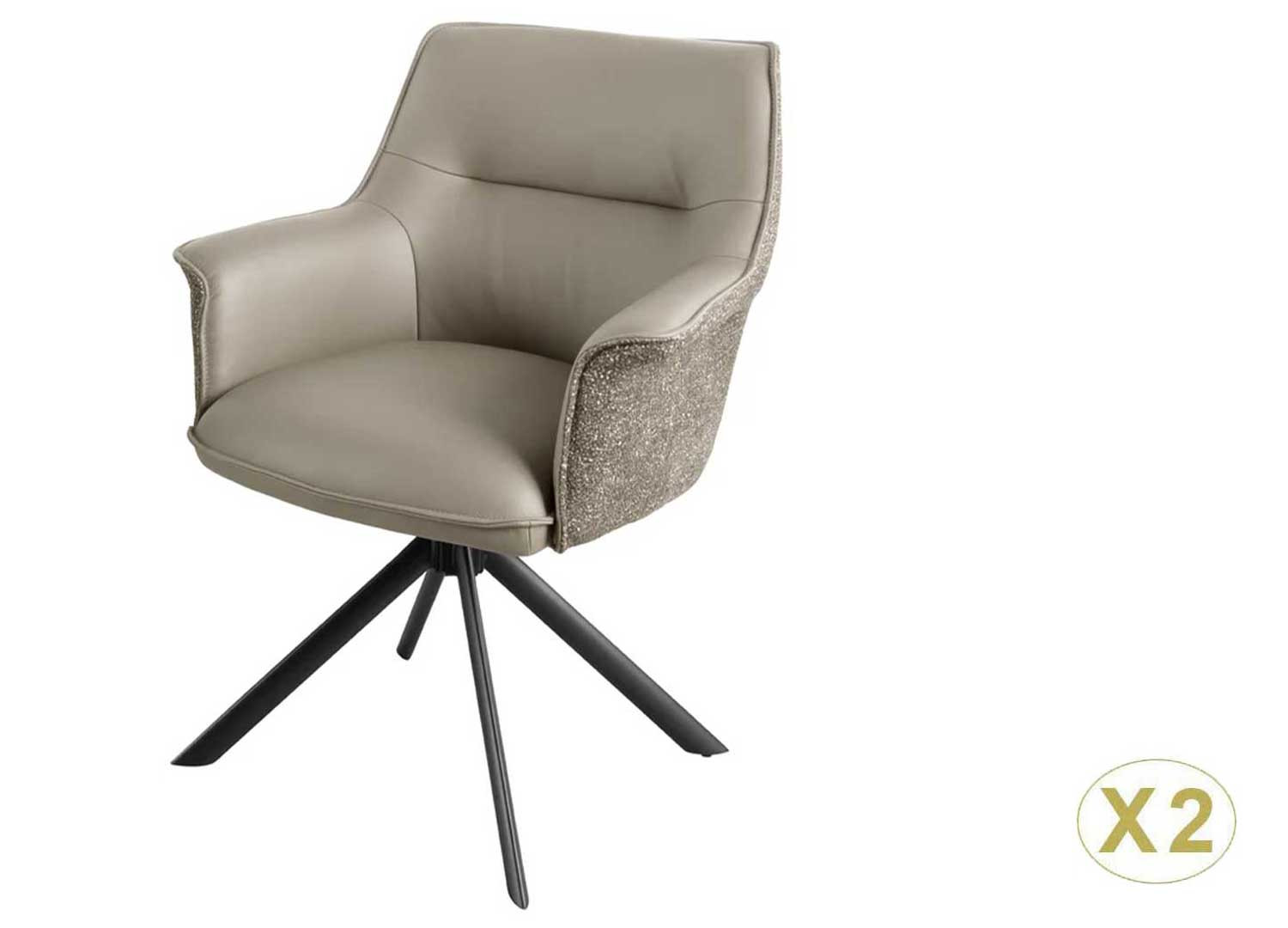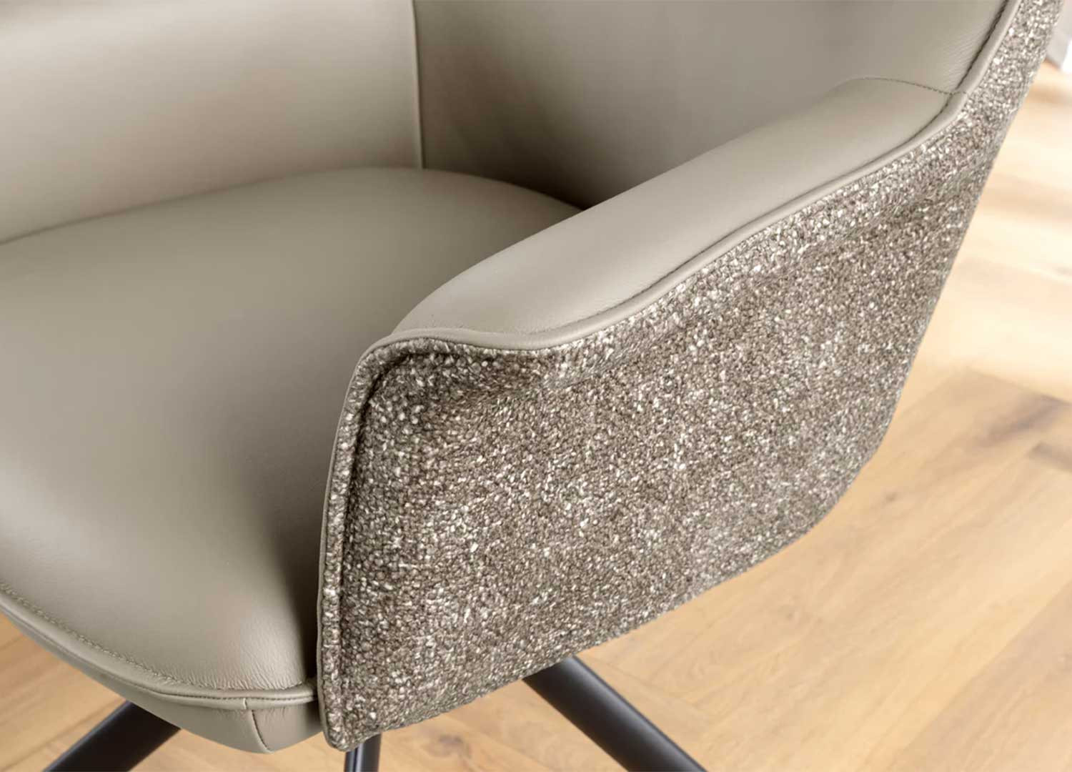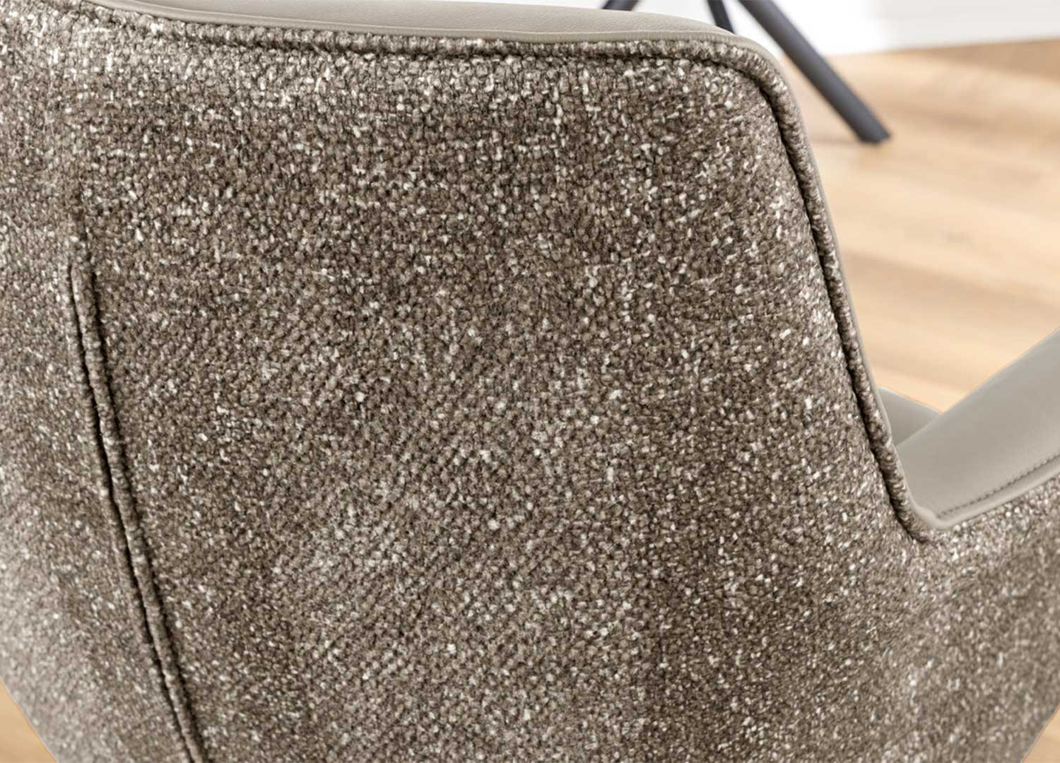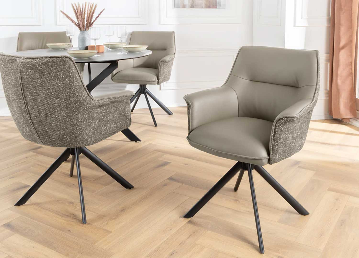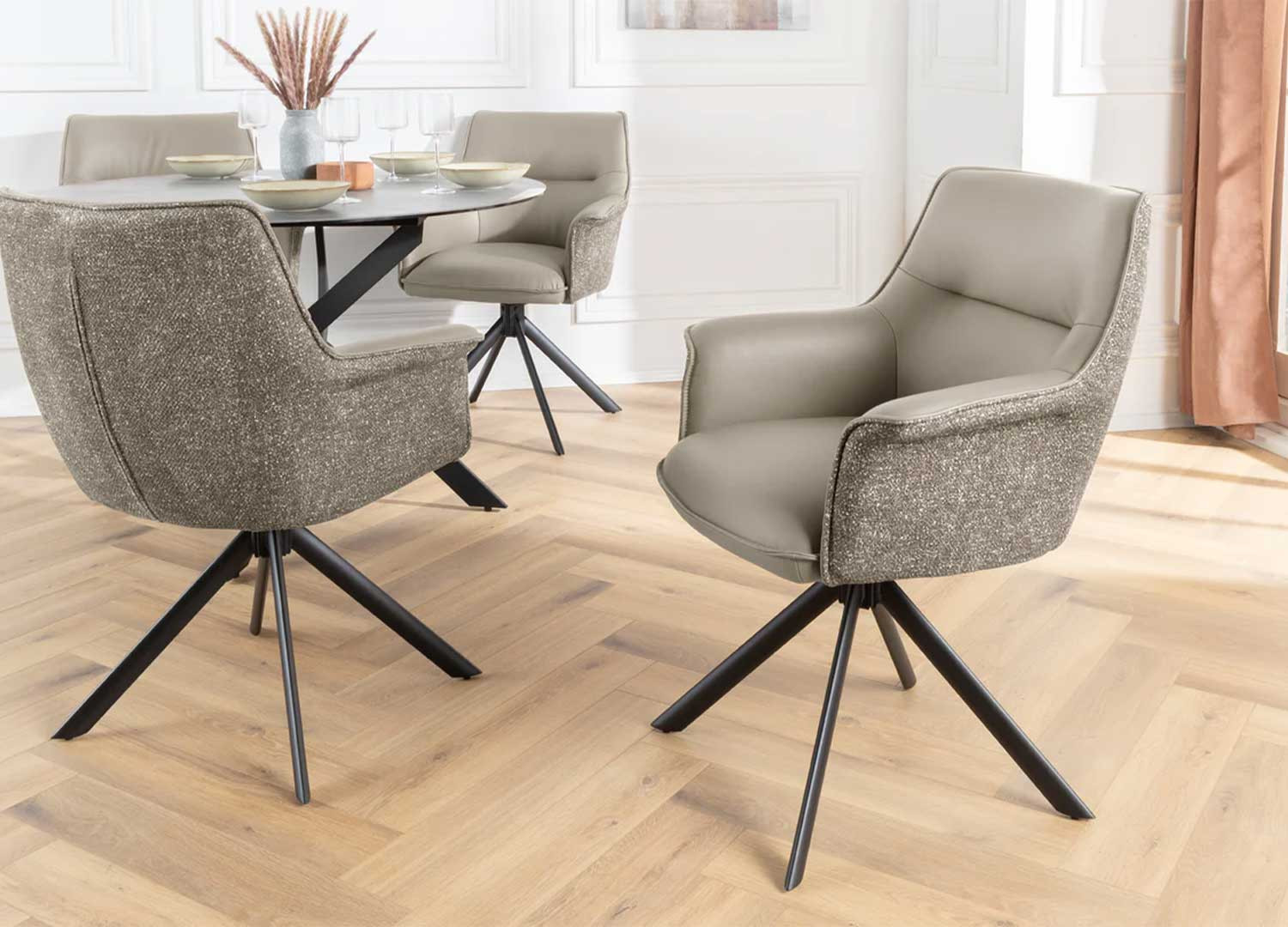 Le fauteuil pivotant Darek est revêtu de cuir véritable et de tissu structuré taupe. Son mécanisme pivotant à 180° avec retour automatique offre une assise pratique, idéale pour la salle à manger. Il dispose d'accoudoirs intégrés et d'une assise rembourrée garantissant un confort optimal. Avec son design moderne, ce fauteuil de table s’intègre aussi bien dans un intérieur contemporain, industriel ou rétro chic.