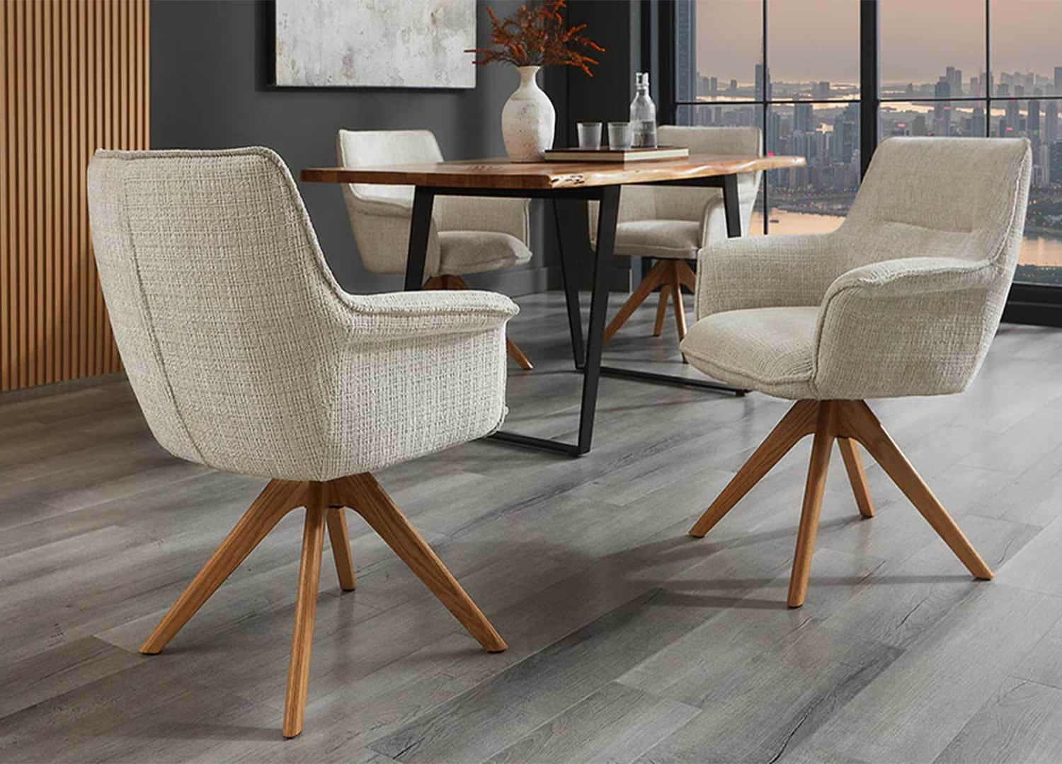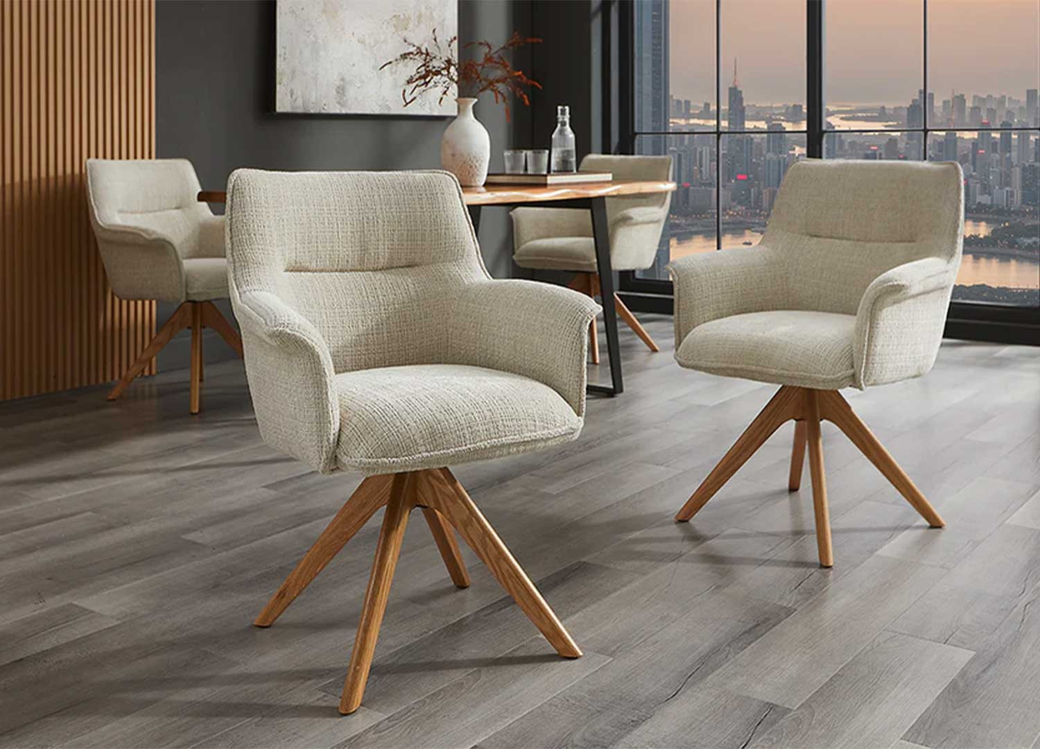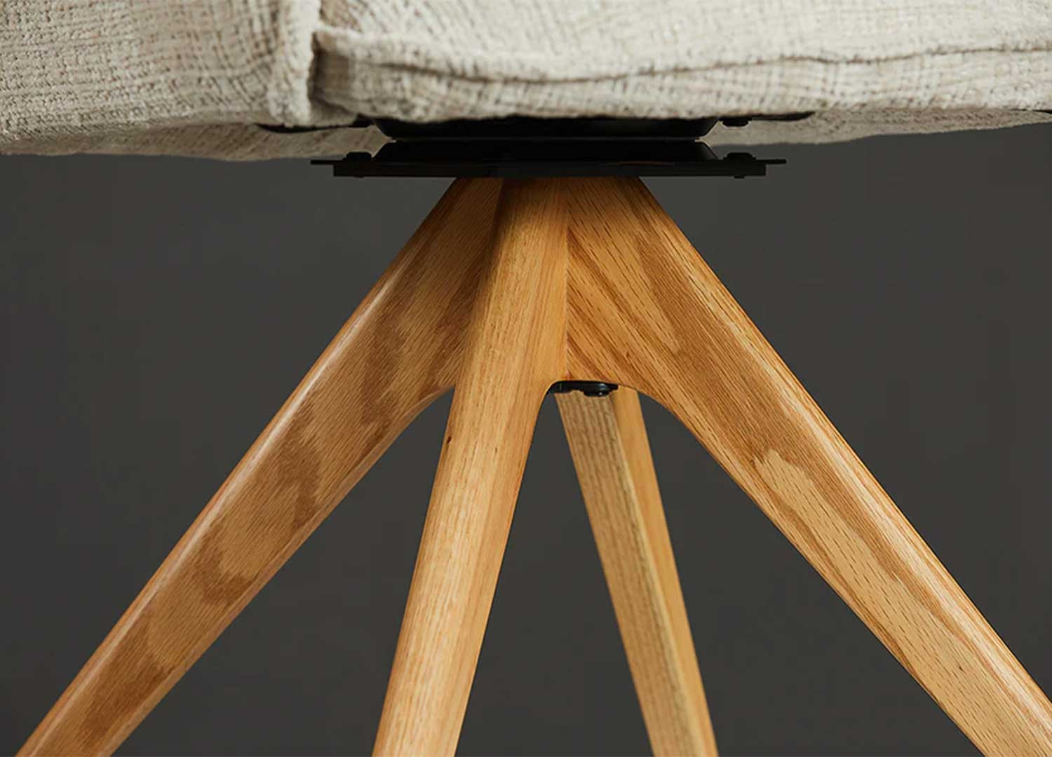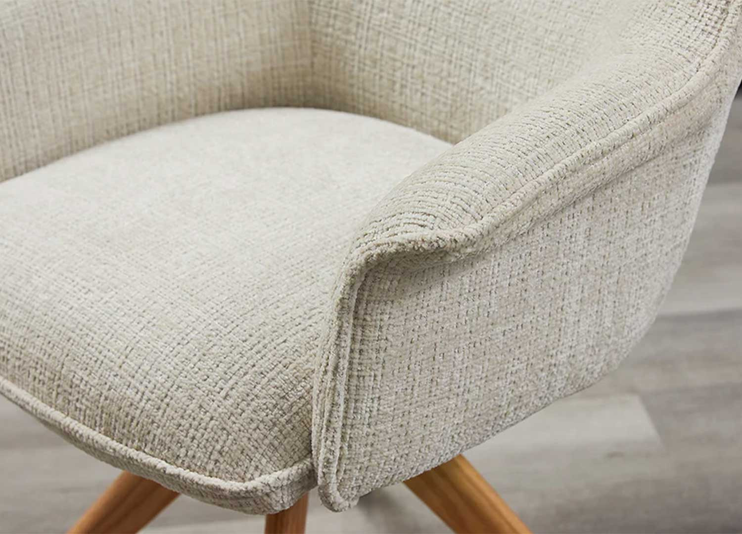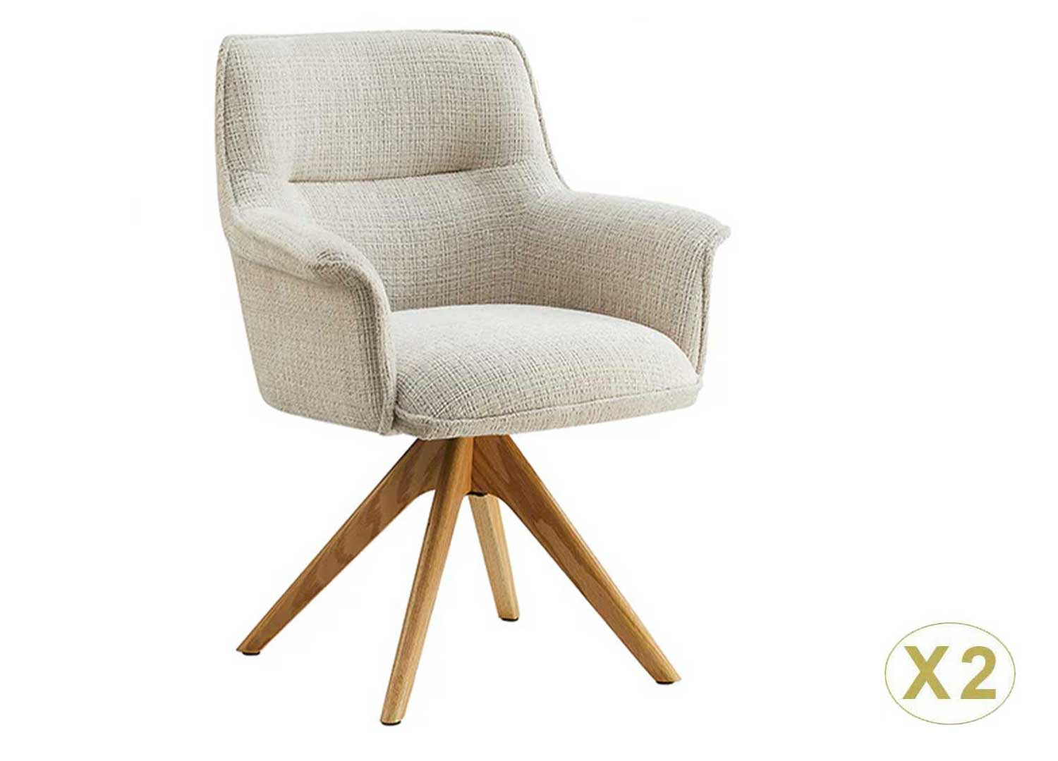 La chaise Darek est revêtue d’un tissu chenille beige doux au toucher avec un piétement en bois massif de chêne naturel. Cette chaise moderne pivote à 180° et dispose d'un mécanisme de retour automatique, de sorte que la chaise revient d’elle-même à sa position d’origine quand on se lève.