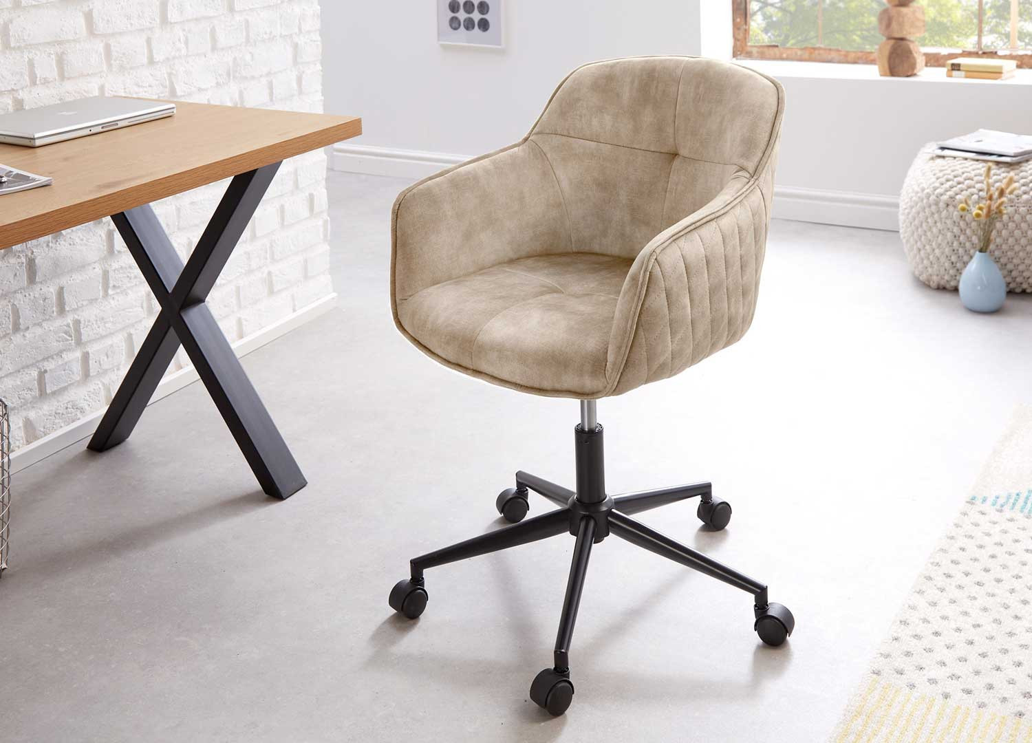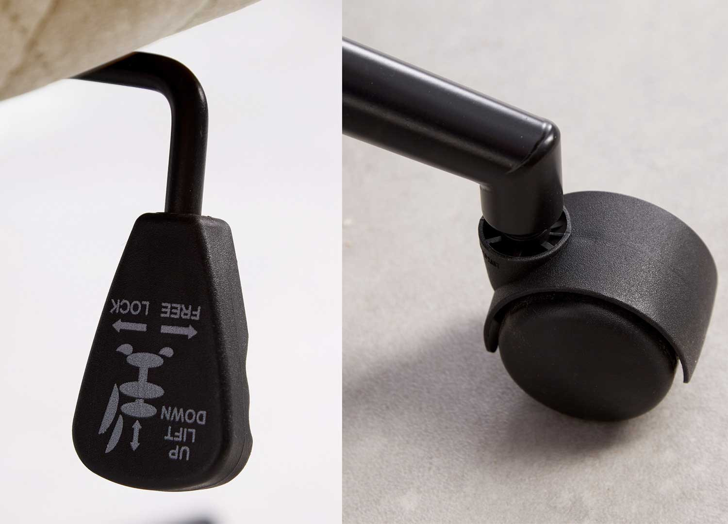 Détail de la chaise de bureau champagne grège - revêtement en velours avec surpiqûres décoratives - hauteur des accoudoirs 17 cm - réglage de la hauteur d'assise de 47 à 56 cm grâce à un levier sous la coque - cadre en métal noir monté sur 5 roulettes - charge maximale de 120 kg |