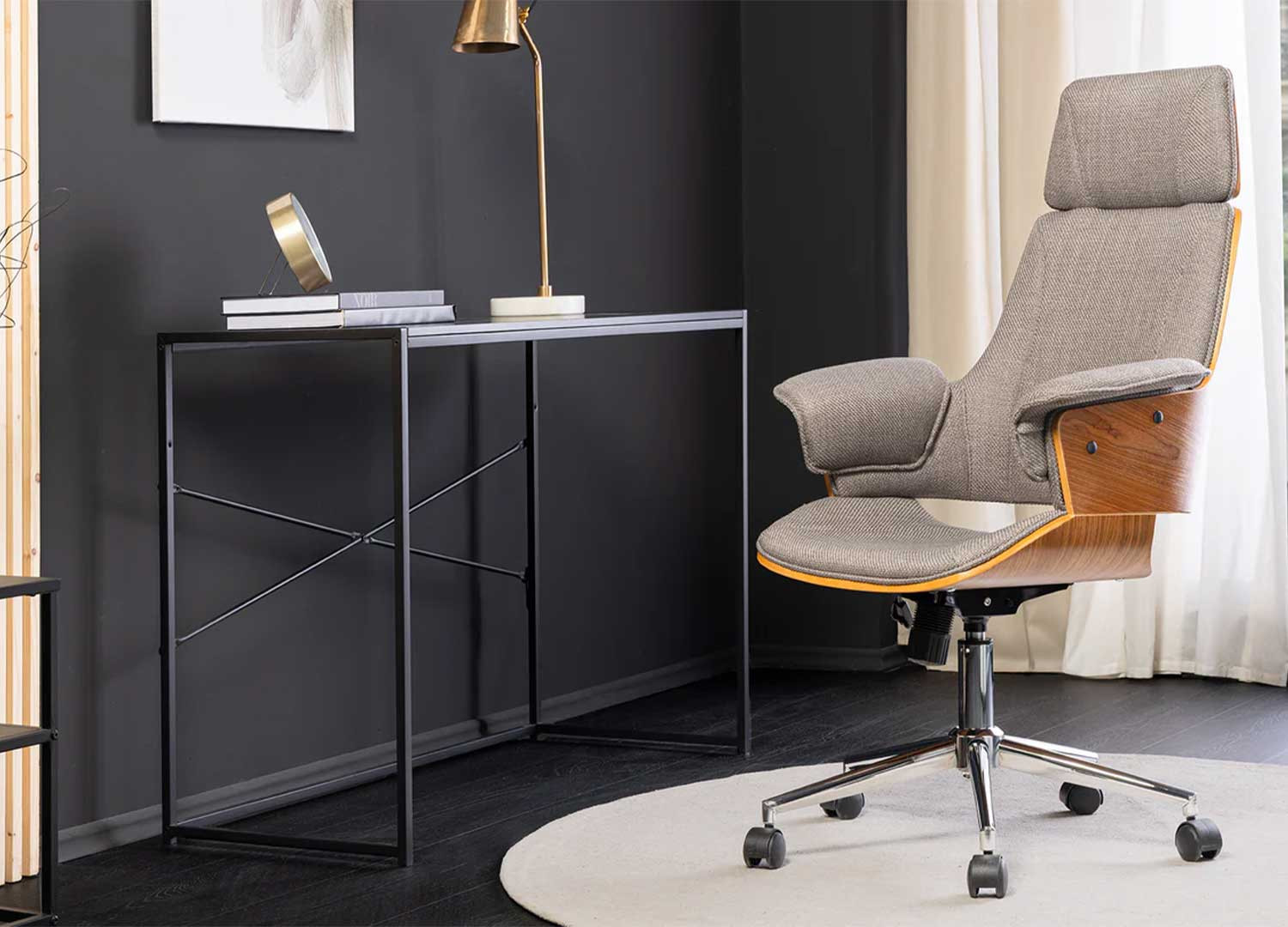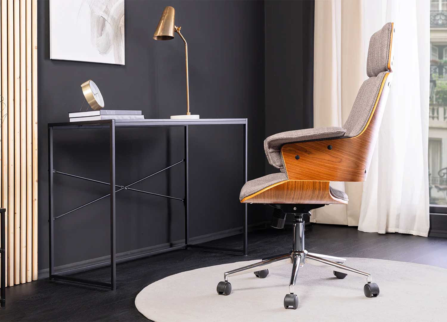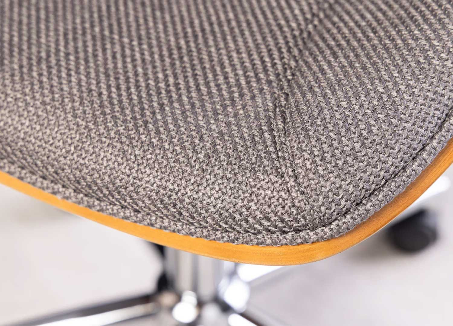 Le fauteuil de bureau Oliver est doté d'une assise en tissu texturé gris qui s’harmonise parfaitement avec sa coque en placage noyer, pour un style inspiré du mid-century. Pratique et fonctionnel, il dispose d’une hauteur réglable de 44 à 54 cm, d’une rotation à 360° et de roulettes fluides pour une mobilité optimale. Sa structure en métal chromé assure une grande solidité et peut supporter jusqu’à 130 kg.