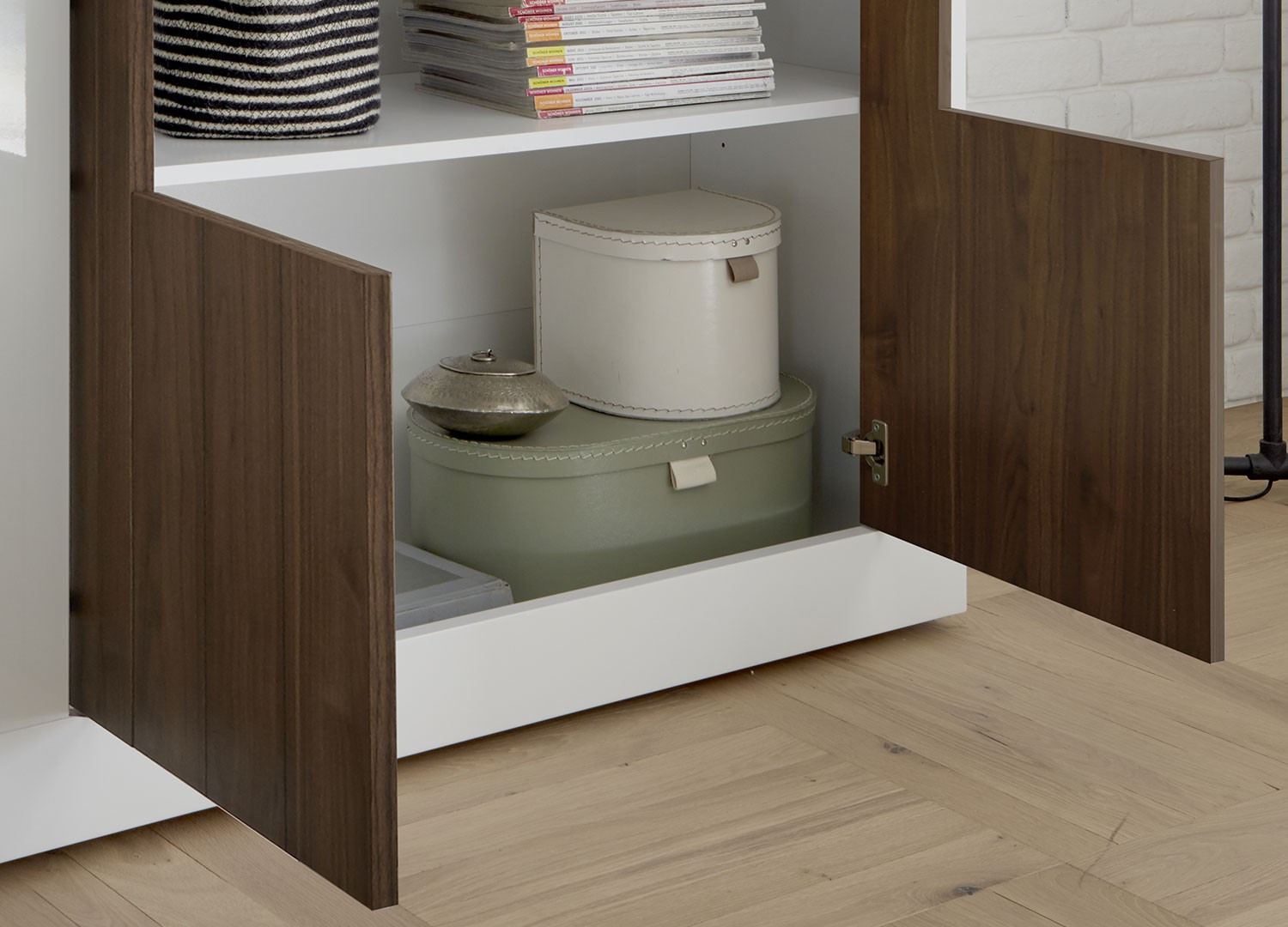Détail du buffet bas moderne 241 cm - 1 porte intégrant 1 étagère - 1 porte à abattant avec pistons à ouverture douce - 2 tiroirs sur glissières en métal à fermeture douce - 2 compartiments ouverts - pieds en PVC de forme fuseaux Les + produit ✔ fabrication italienne ✔ facile d'entretien ✔ design contemporain |