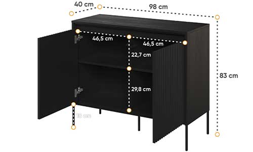 Détail de la commode noire - couleur noire - 2 portes à ouverture et fermeture par bouton poussoir - 1 étagère derrière chacune des portes - façades de portes rainurées - pieds fins en métal noir d'une hauteur de 18 cm - bande led de 94,5 cm incluse ✔ Ce meuble est livré en kit. Son temps de montage est estimé à 90 minutes à 2 personnes. |