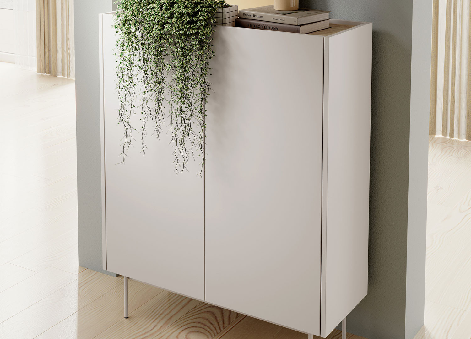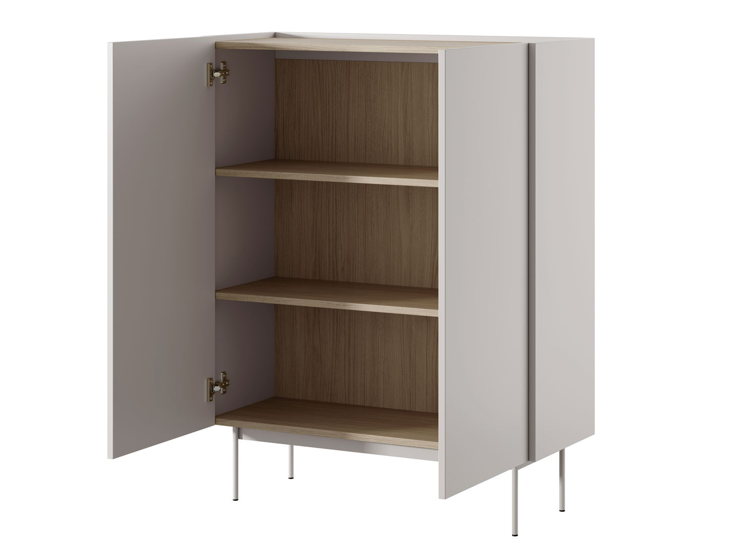 Avec ses teintes douces, la commode Color offre une capacité de rangement généreuse grâce à ses deux portes dissimulant trois espaces spacieux. Sa finition cachemire est associée à un intérieur et à un plateau en bois clair, les pieds fins en métal allègent la silhouette et facilite le nettoyage. Cette commode s’intègrera aisément dans toute pièce de la maison.