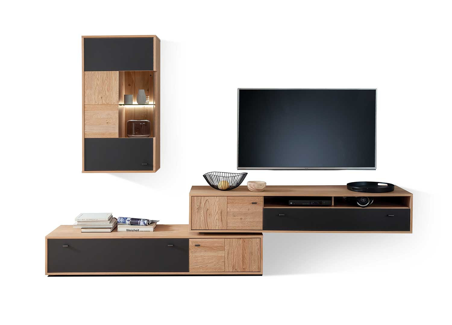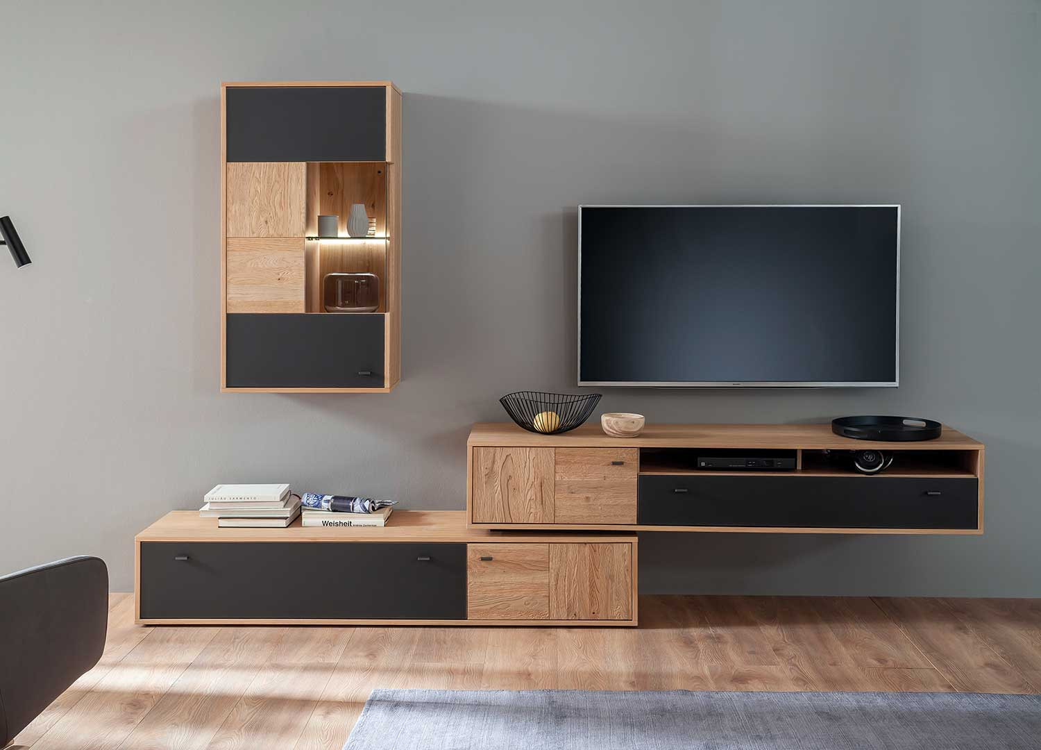 Cet ensemble TV moderne combine le chêne bianco massif, le verre et la couleur anthracite pour un style élégant et contemporain. Le corps est en placage chêne Bianco, avec des poignées en métal anthracite. Les portes et tiroirs sont équipés d’amortisseurs pour plus de confort. Des vitrages Parsol gris et des étagères en verre transparent apportent une touche raffinée. Cet ensemble TV de 306 cm au design avant-gardiste, créera une ambiance chic dans votre salon.