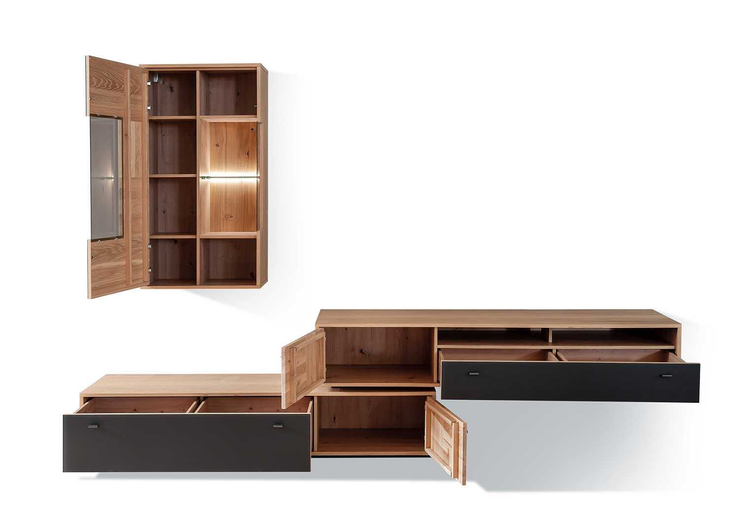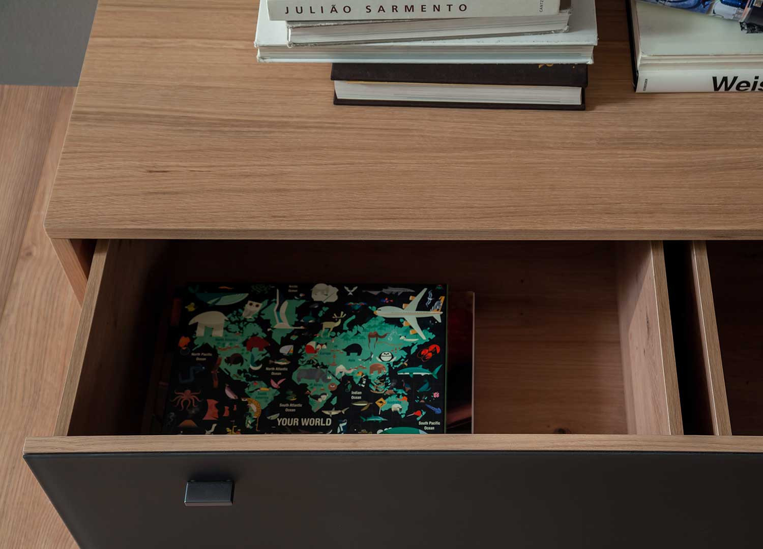 | Matériau | Façade : chêne bianco massif à lamelles continues et verre anthracite satiné / Structure : placage chêne bianco / Verre parsol gris et clair / Dos : imitation chêne bianco |