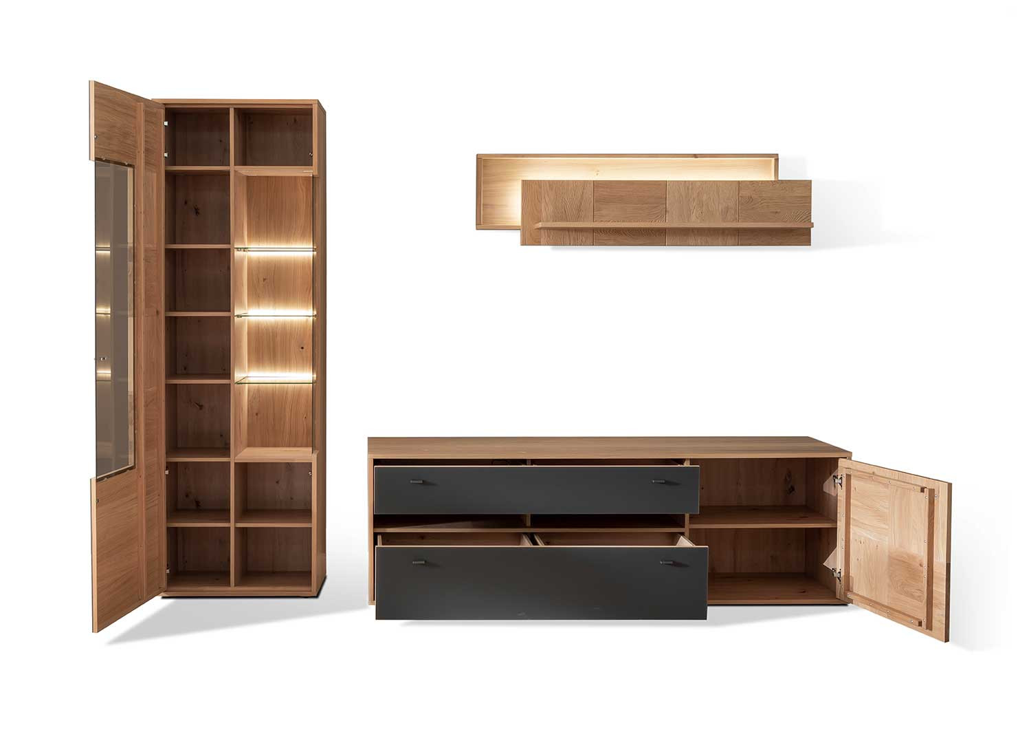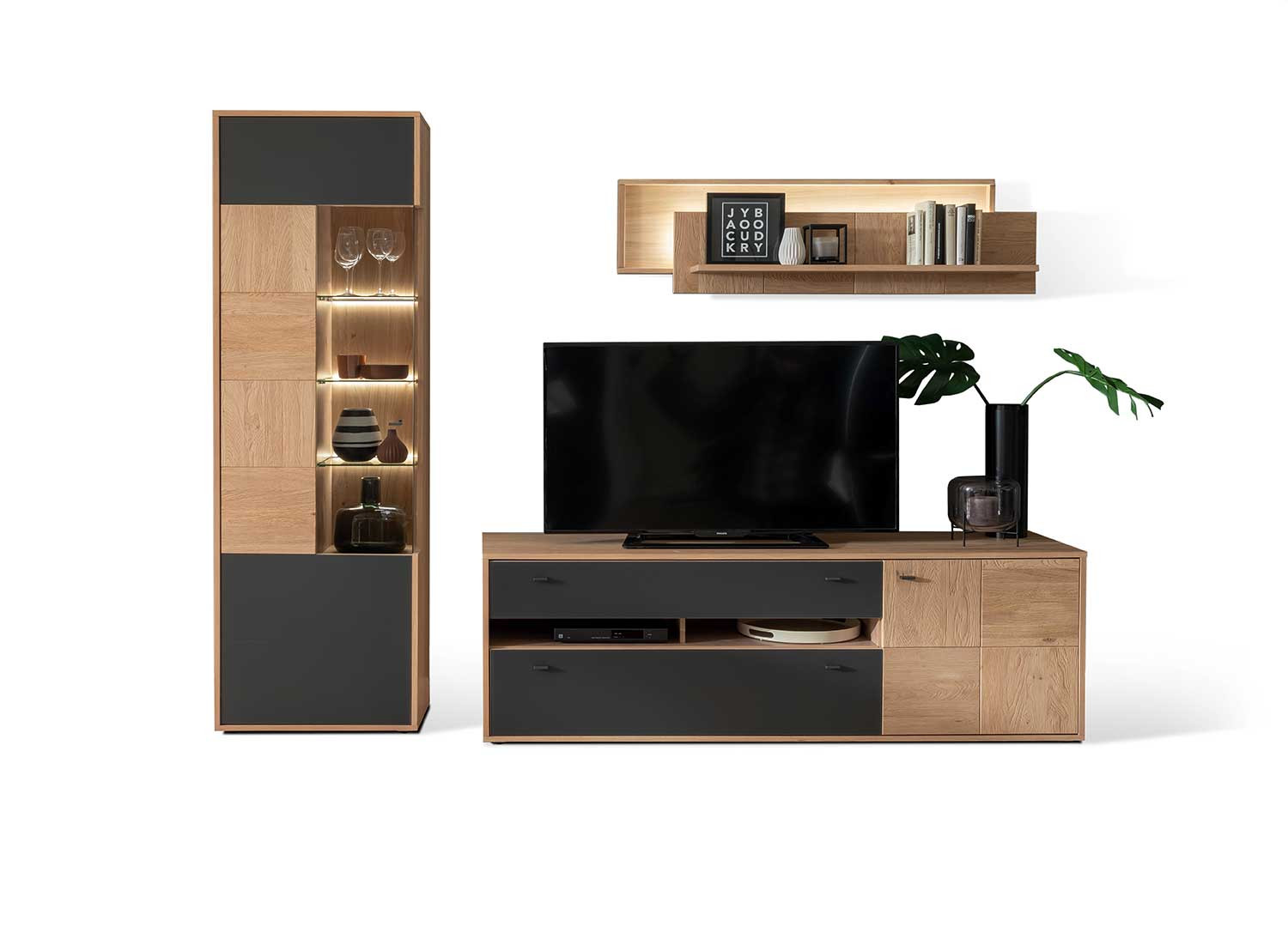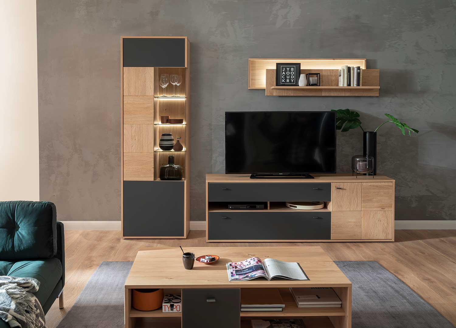 Un ensemble TV pour salon fonctionnel équipé d'une vitrine haute avec porte semi vitrée dotée de plusieurs compartiments de rangement et étagères permettant une belle mise en valeur des objets. Un meuble bas TV avec deux larges tiroirs anthracite et une porte en bois. Une étagère murale avec tablette de pose.