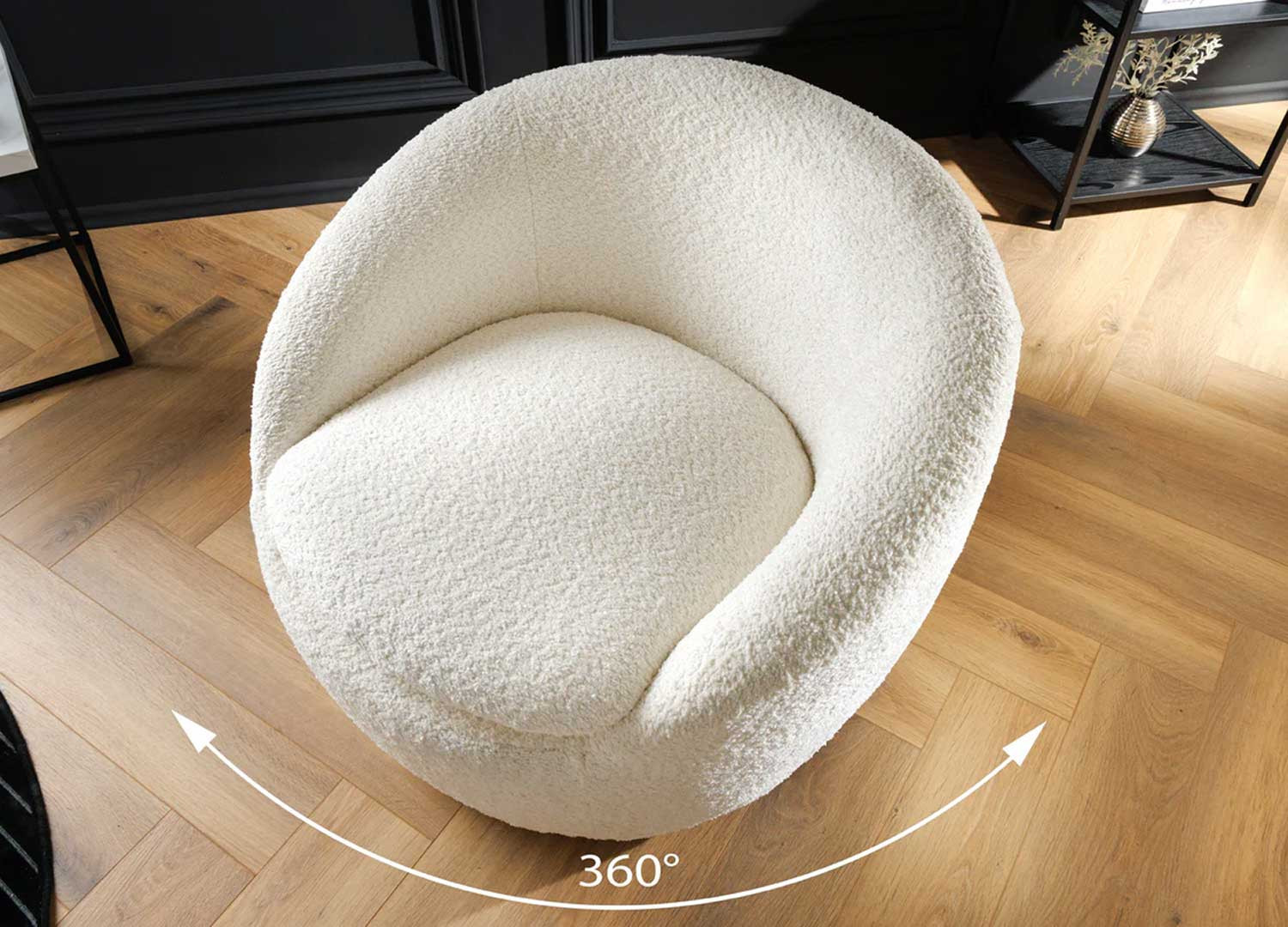 Fauteuil design rotatif blanc boucléOn adore la douceur et l'élégance que dégage le fauteuil en tissu bouclé blanc Mirea. Ce fauteuil est une invitation à la détente, un cocon de douceur où il fait bon se lover pour lire un livre, savourer une tasse de thé ou partager un moment convivial entre amis. Grâce à sa rotation à 360°, vous profitez d'une liberté de mouvement totale sans jamais sacrifier le confort. | ||