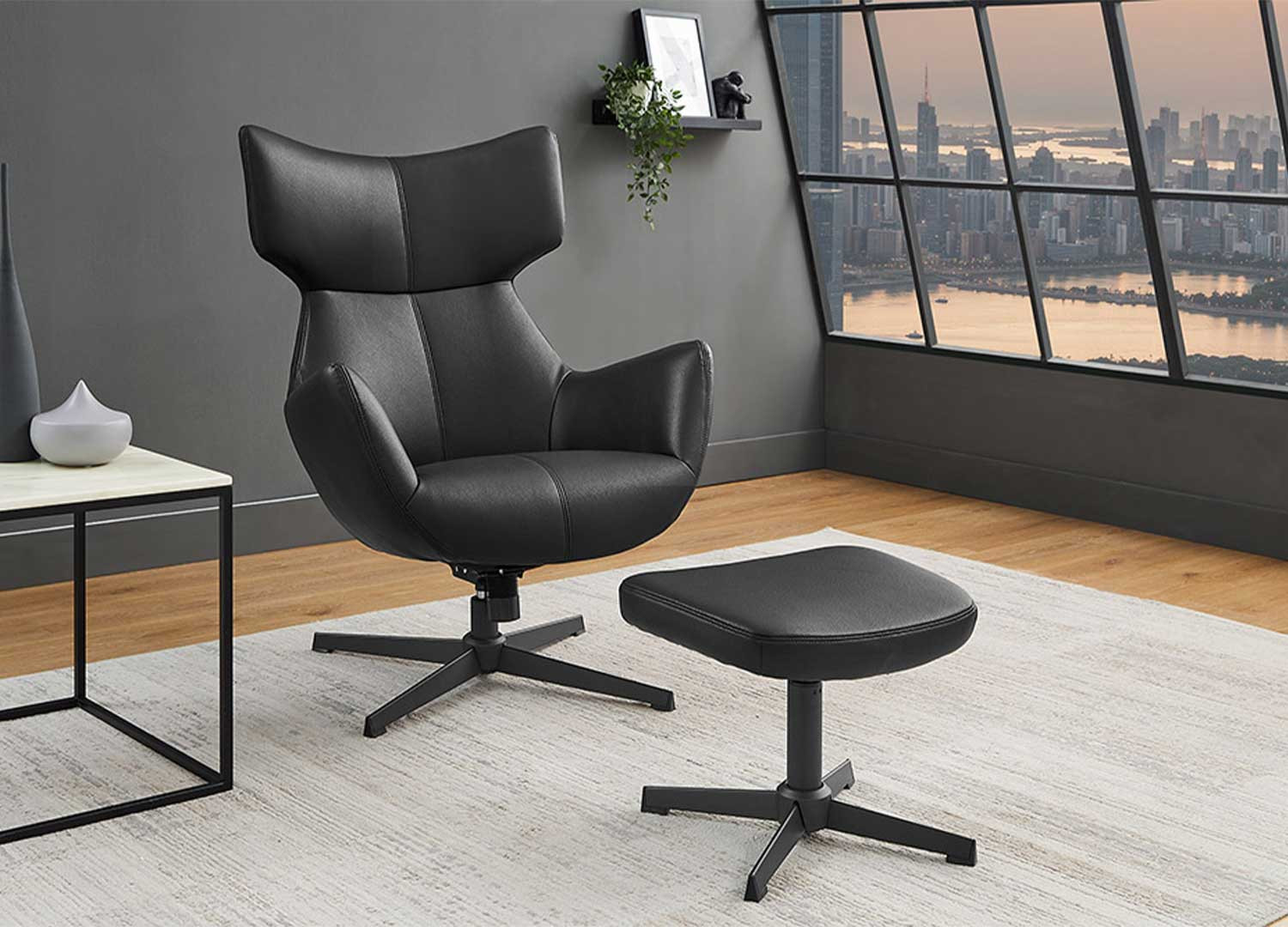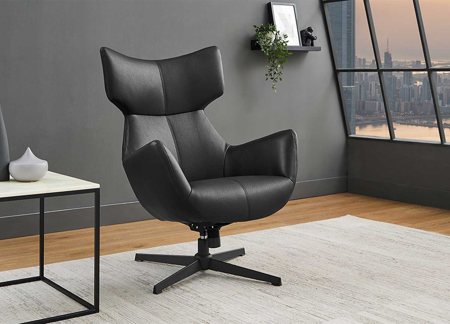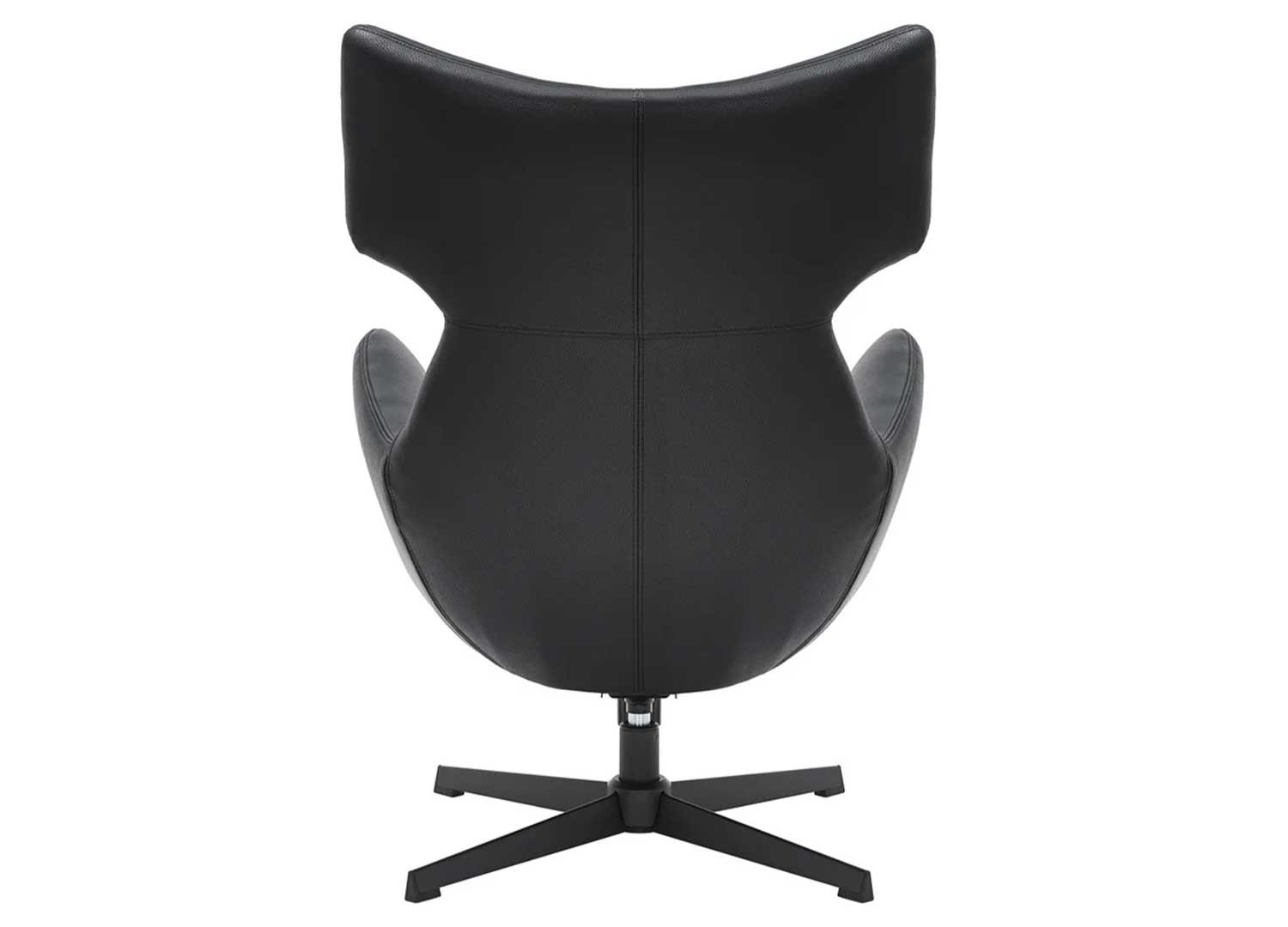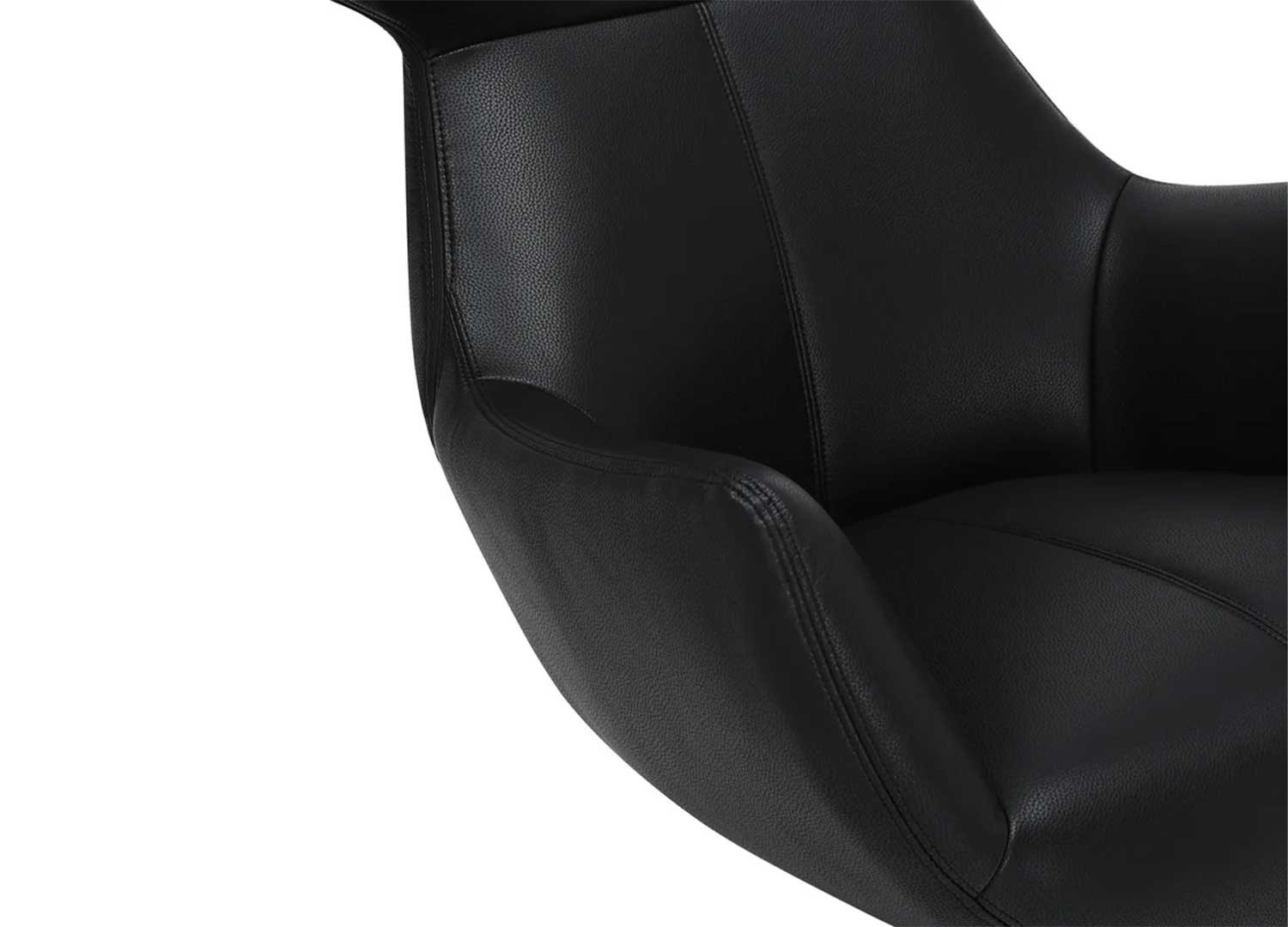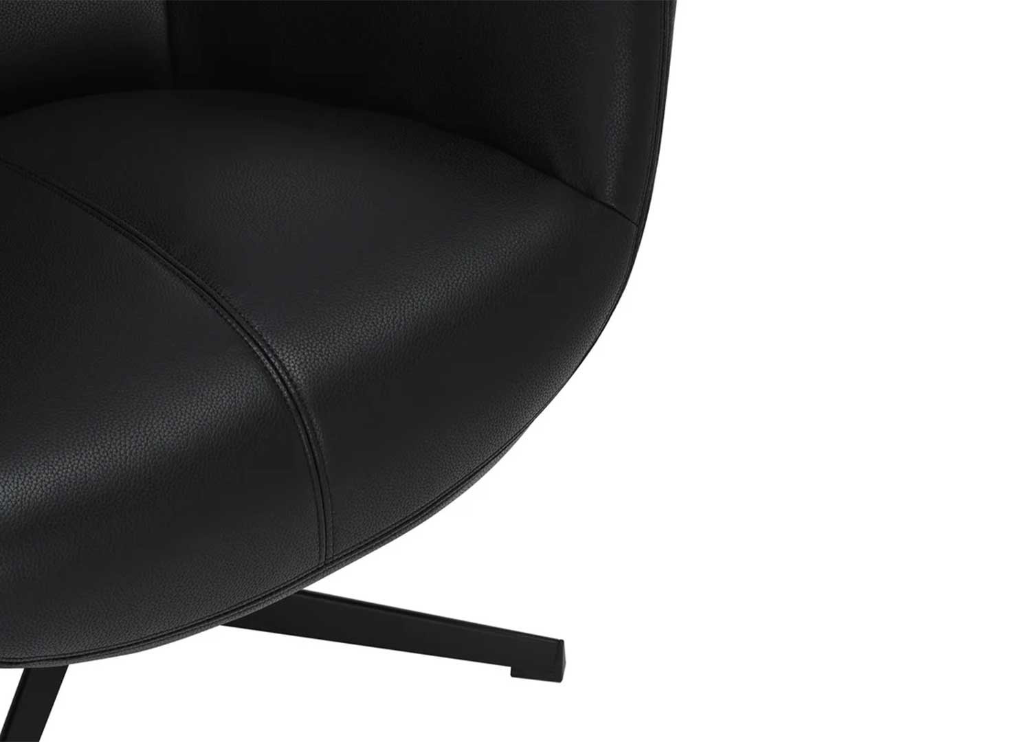 Offrez-vous une parenthèse de confort avec le fauteuil Jade. Son revêtement en simili cuir noir séduit par sa texture douce et lumineuse, jouant subtilement avec la lumière pour révéler toutes ses nuances. Conçu pour épouser vos mouvements, ce fauteuil relax pivote à 360° et offre une assise généreuse, un dossier enveloppant et des accoudoirs délicatement inclinés. Chaque détail est pensé pour vous offrir une expérience de détente unique, que ce soit pour lire, discuter ou simplement savourer un moment de calme.