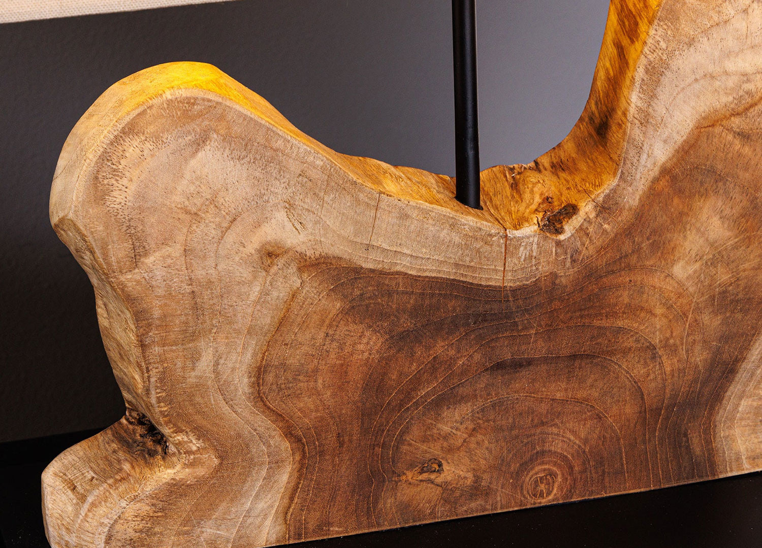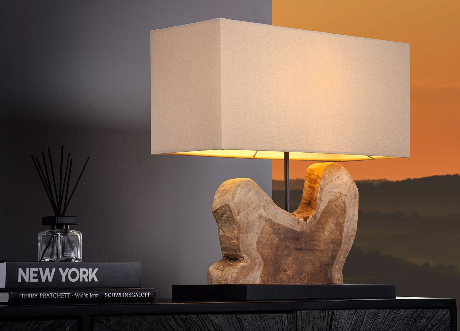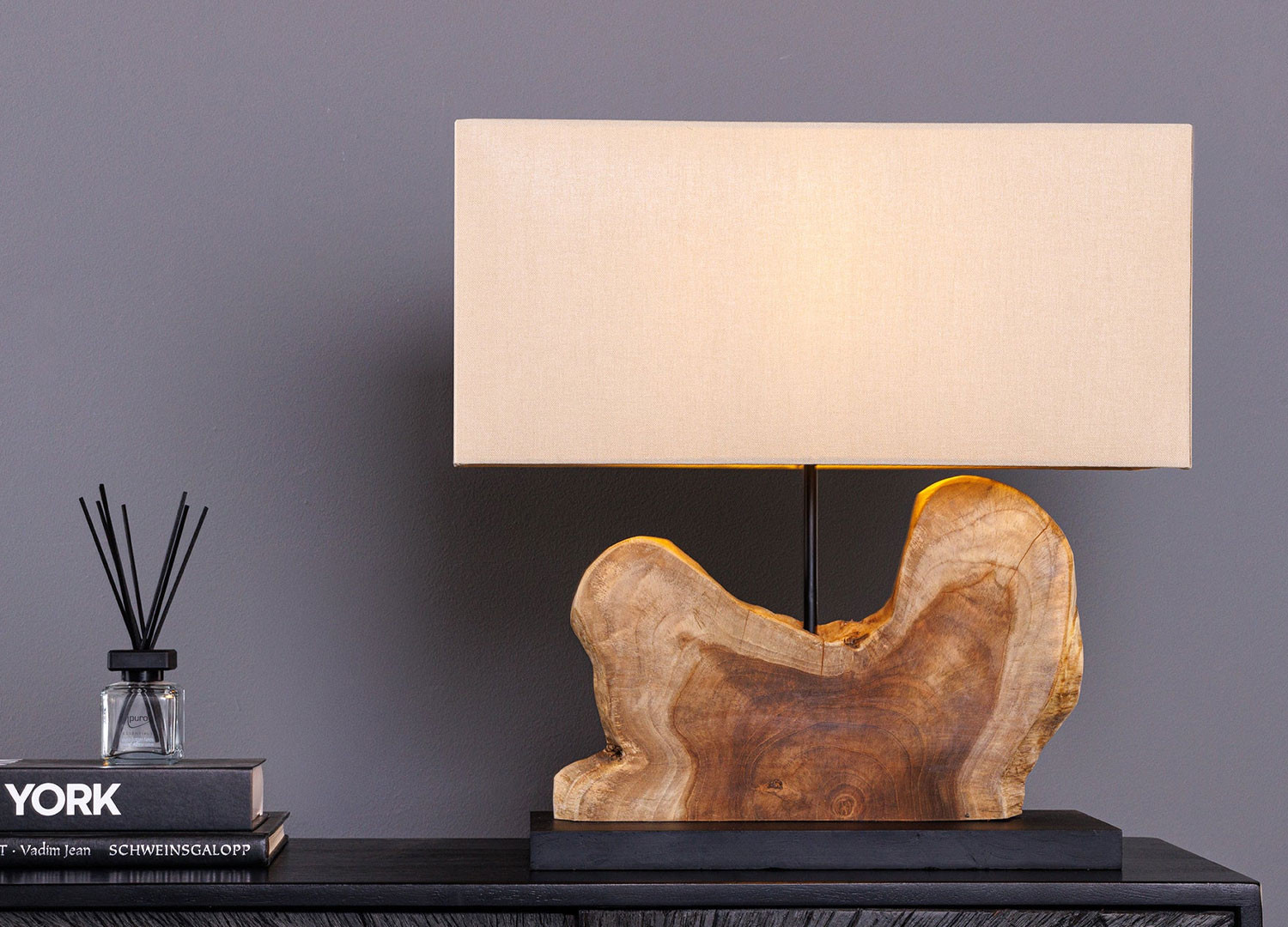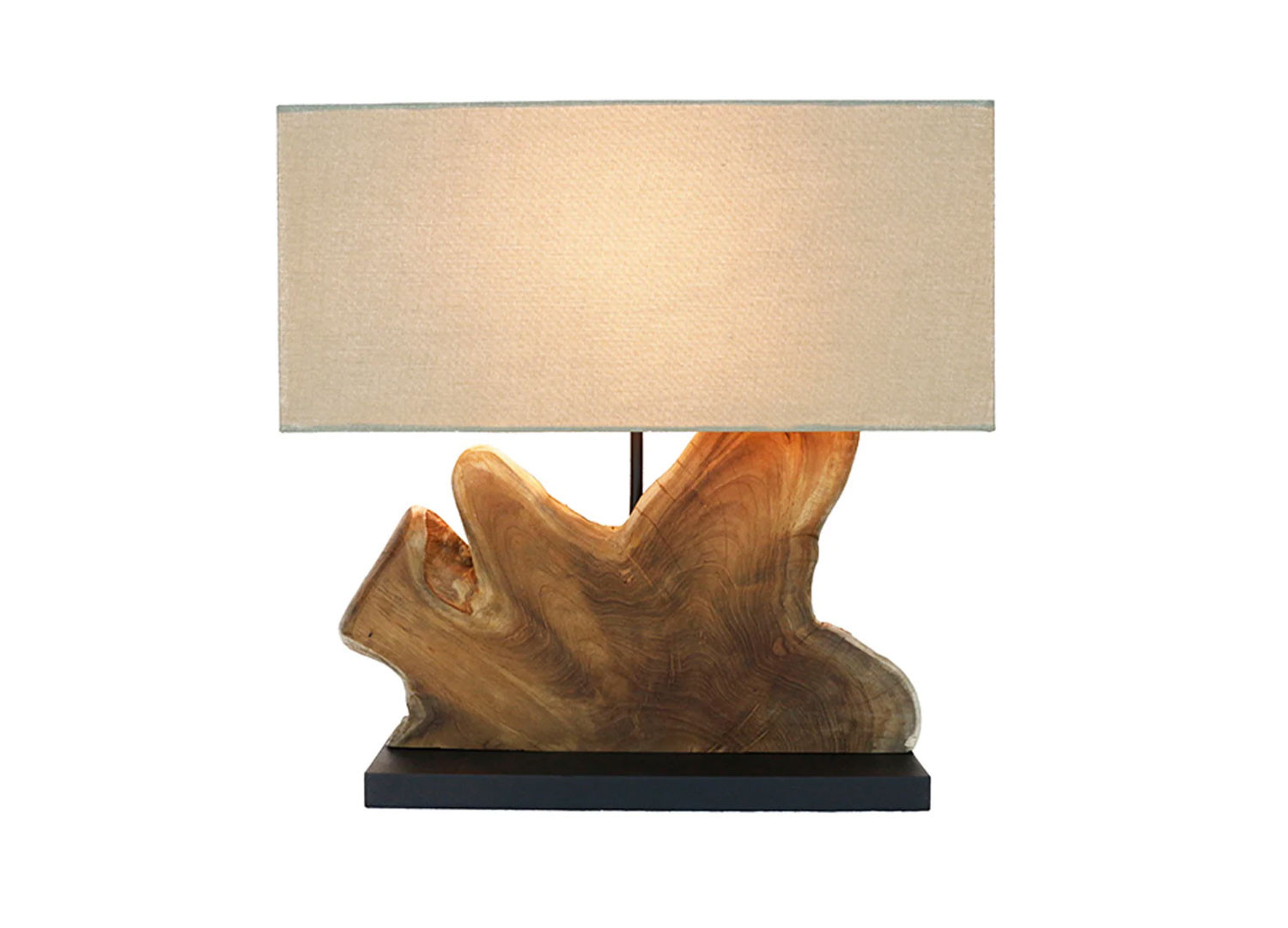 ✓ une lampe à poser en bois de teck façonné à la main, surmontée d’un abat-jour beige qui diffuse une lumière apaisante, à la fois sobre et envoûtante.