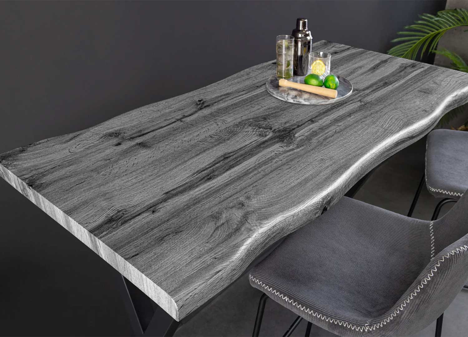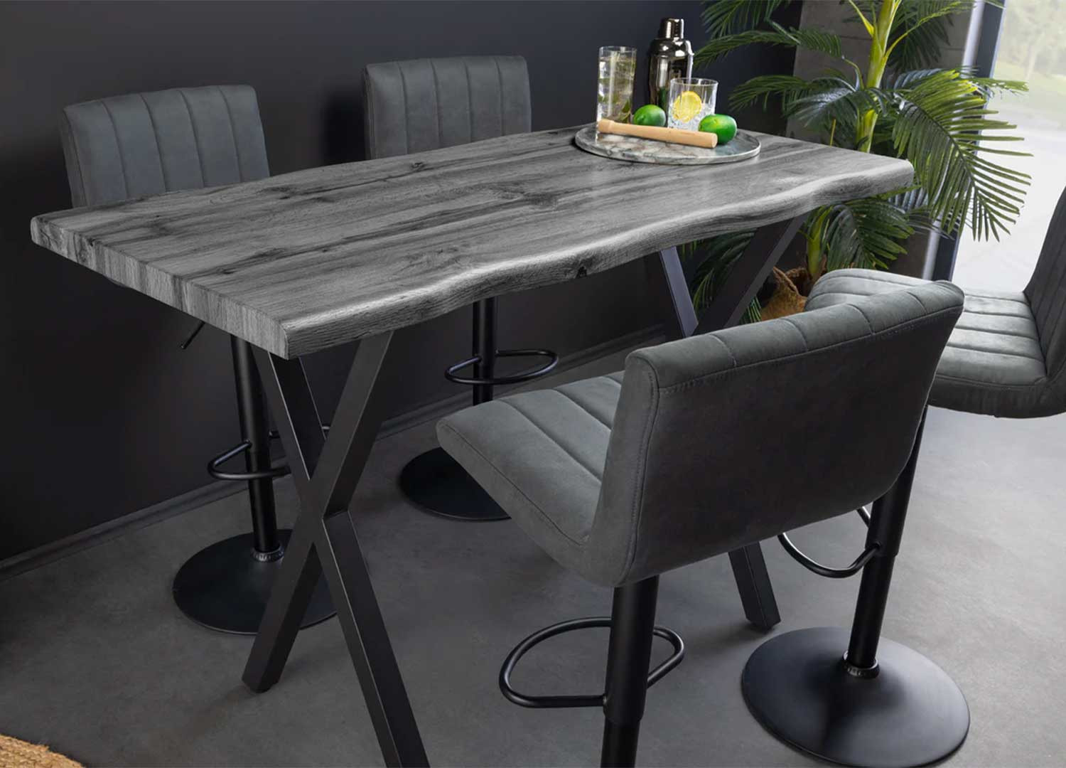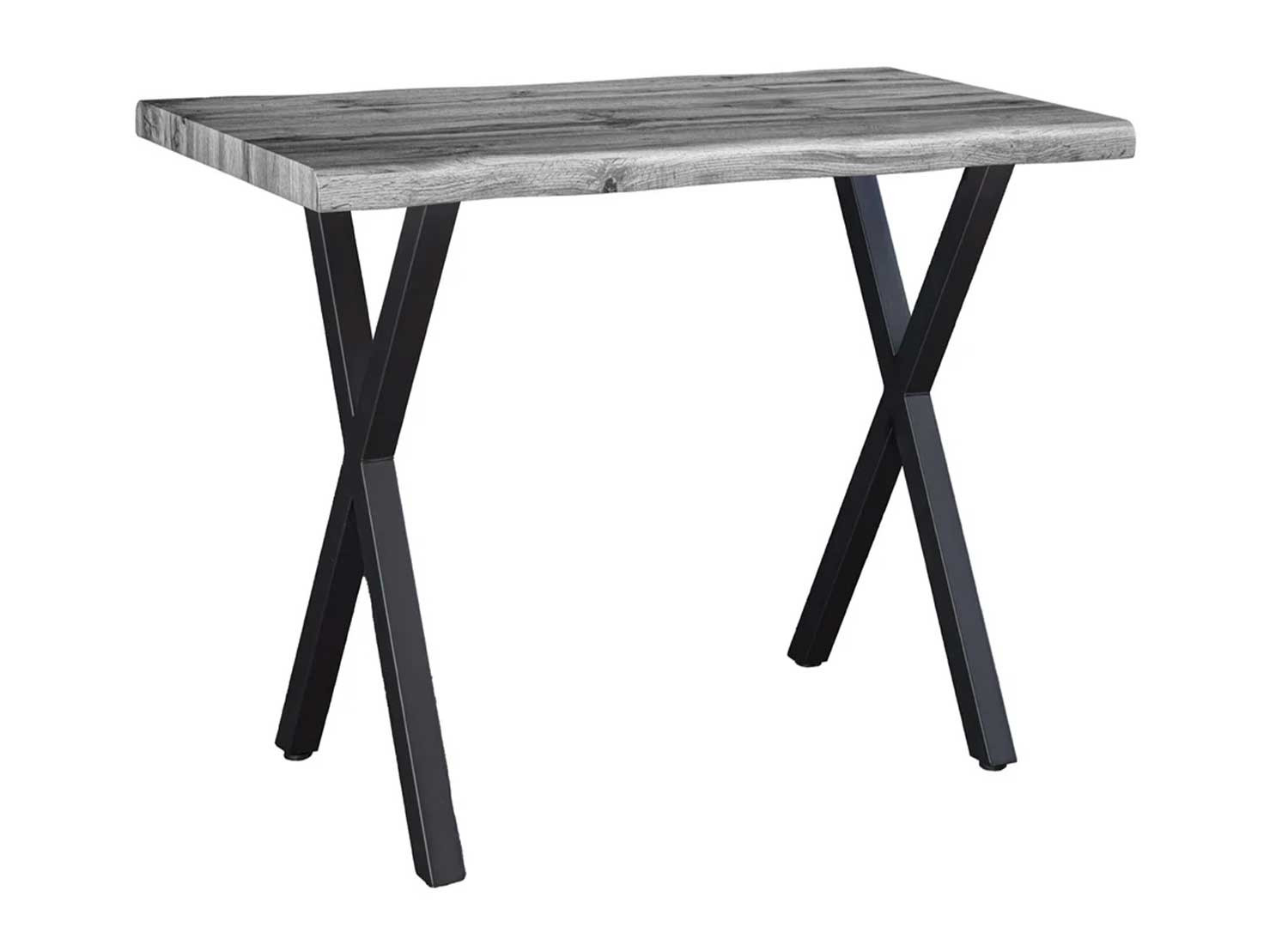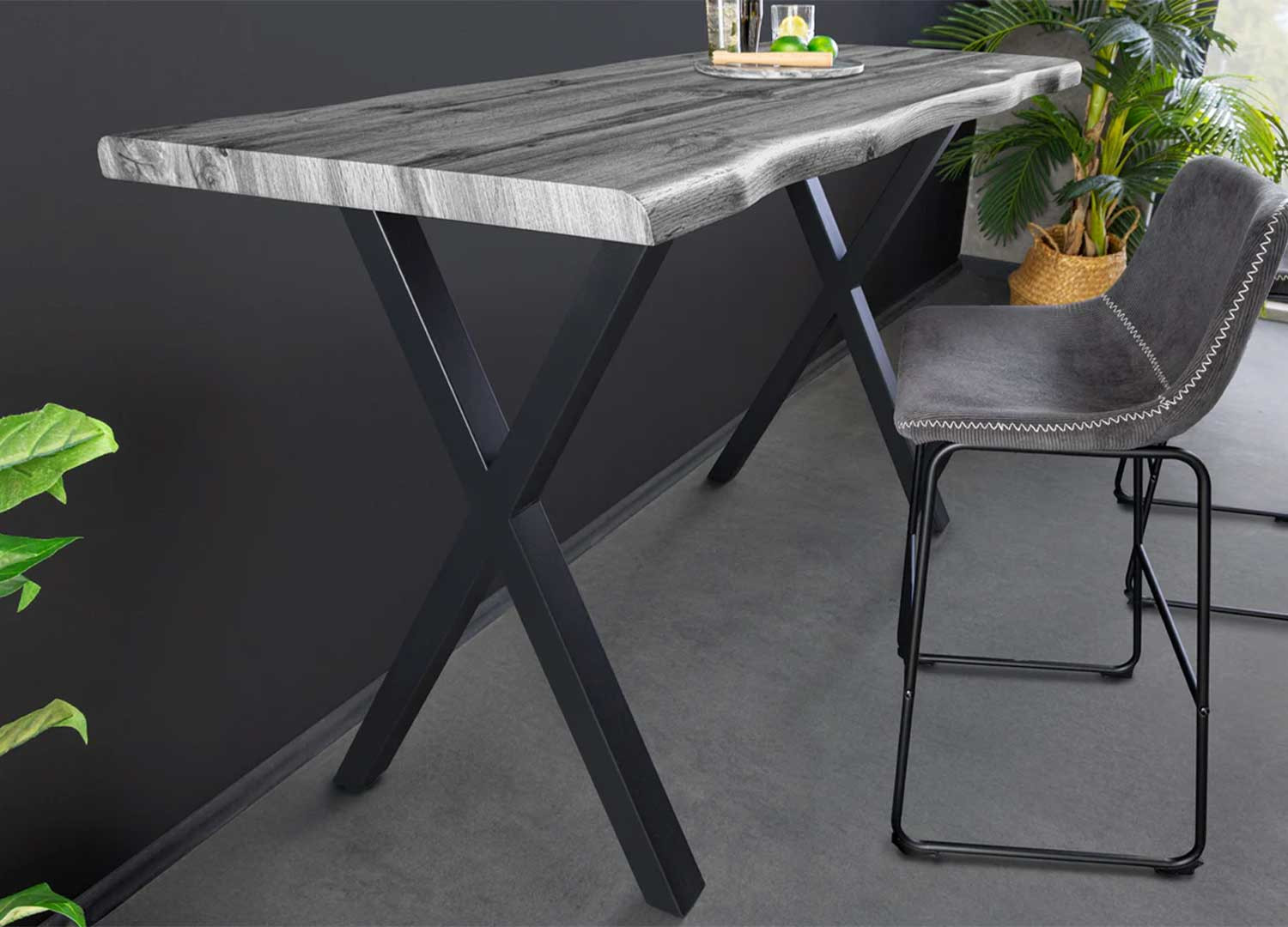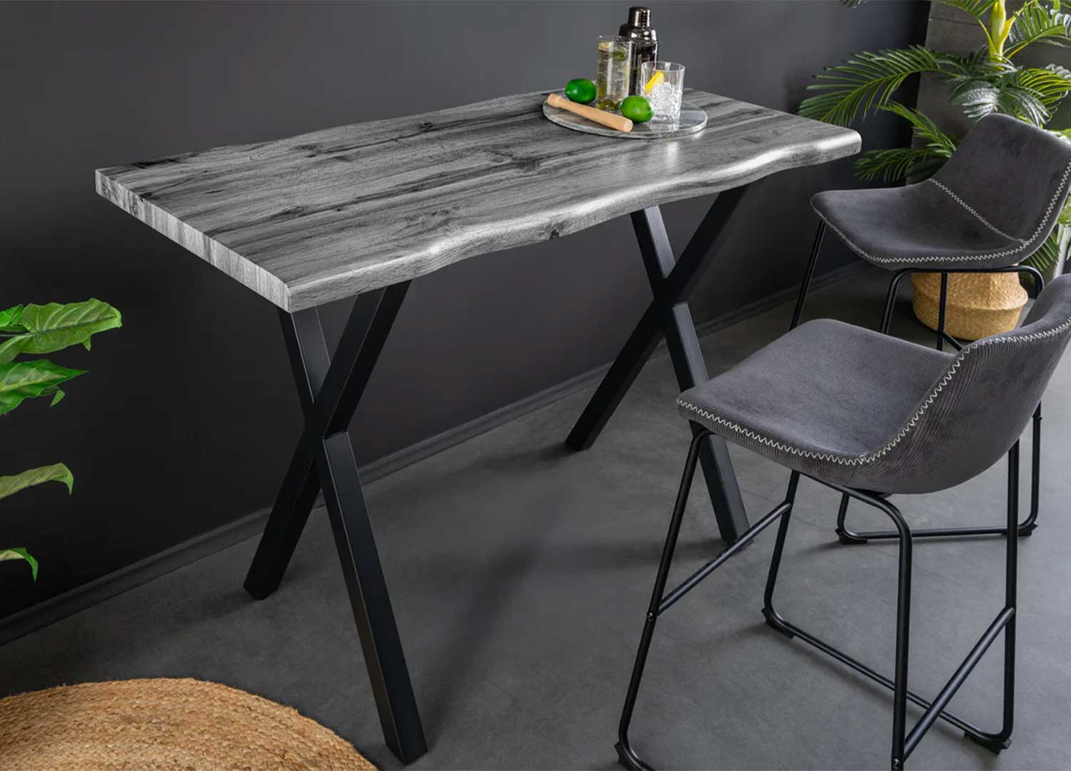 Cette table de bar au design industriel est dotée d'un plateau rectangulaire arborant une finition chêne sauvage grisé et des bords irréguliers qui rappellent la forme brute du bois naturel. Le piètement en métal noir, en forme de X, lui confère une allure élégante tout en assurant une excellente stabilité. Avec ses dimensions de 120 × 60 × 100 cm, elle est parfaite comme table haute dans une cuisine moderne, un coin bar ou un salon loft.