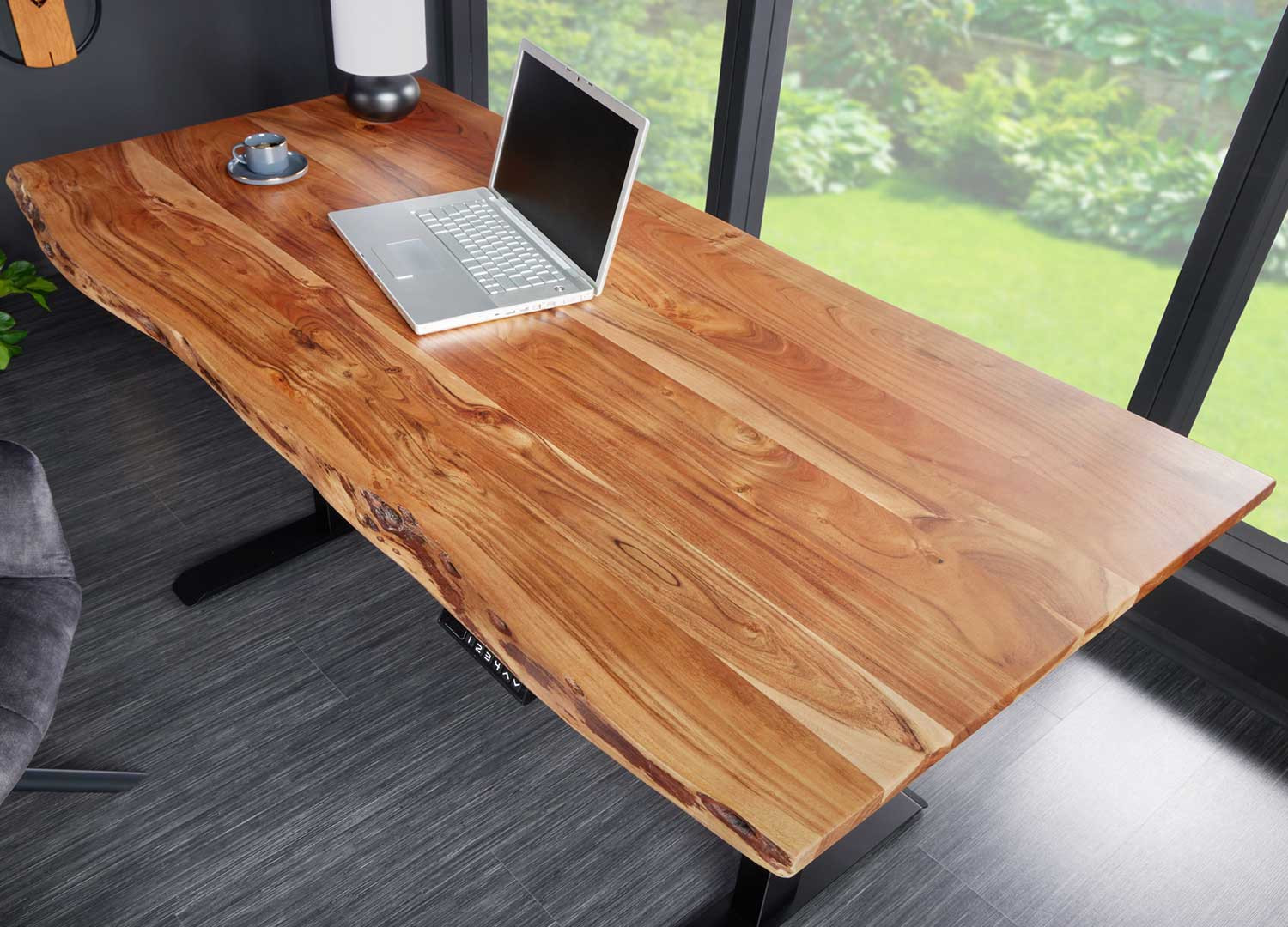 Détail du bureau réglable en hauteur 140 cm - surface de travail de 140 cm en bois d'acacia - plateau rectangulaire à rebords irréguliers d'une épaisseur de 25 mm - pied métal noir avec fonction réglable en hauteur de 78 à 123 cm - espace de 87 cm entre les pieds - câble d'alimentation de 2m30 environ ✔ chaque plateau est unique présentant des caractéristiques distinctives telles que des irrégularités ou des fissures. Ces caractéristiques font le charme de nos meubles en bois massif. |