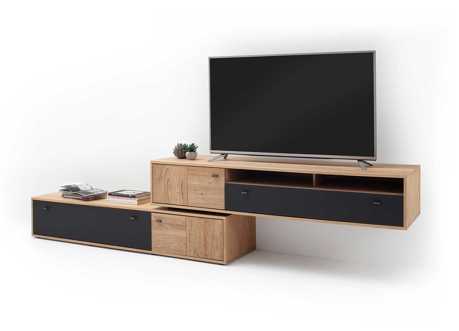 Apportez du style à votre salon avec ce meuble TV moderne de 306 cm en bois de chêne bianco et anthracite. Ses lignes contemporaines s’intègrent parfaitement dans un intérieur design, tandis que ses portes et tiroirs à fermeture amortie garantissent confort et durabilité. Doté de poignées en métal et d’un grand espace de rangement, ce meuble TV est idéal pour organiser vos appareils multimédias et accessoires.