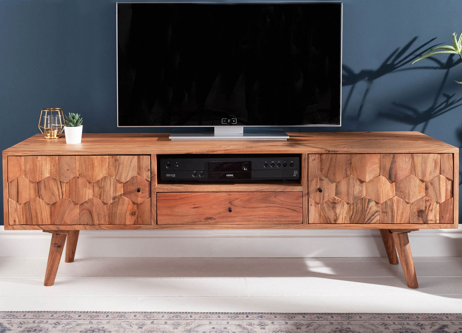 Un grain magnifique pour ce meuble tv en bois massif d'acacia mis en scène pas les motifs mosaïque extravagant de ses deux portes. Ce meuble tv design, monté sur ses quatre pieds fuseaux, accueillera votre équipement hi-fi dans le compartiment ouvert, vos télécommandes dans le tiroir et tous vos autres accessoires derrière ses deux portes. Un look design et contemporain à la fois pour ce beau meuble tv qui vous offrira l'espace de rangement désiré. Réalisé en bois massif d'acacia, ce meuble tv associé aux autres meubles de la même collection, vous séduira et agrémentera votre pièce avec élégance.