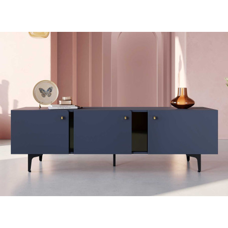 Ce meuble TV de style contemporain est le moyen idéal pour ranger et organiser tous vos appareils multimédias et vos accessoires. Ce meuble tv comporte trois portes, chacune avec une étagère offrant un total de six compartiments de rangement. Les poignées rondes en métal doré, les pieds incurvés en métal noir et la couleur bleue originale créent un look intemporel, parfait pour n'importe quelle pièce. La longueur du meuble télé est de 165 cm, ce qui vous permet de le placer facilement dans n'importe quel espace. Avec son design épuré, ce meuble tv sera le complément parfait de votre maison.